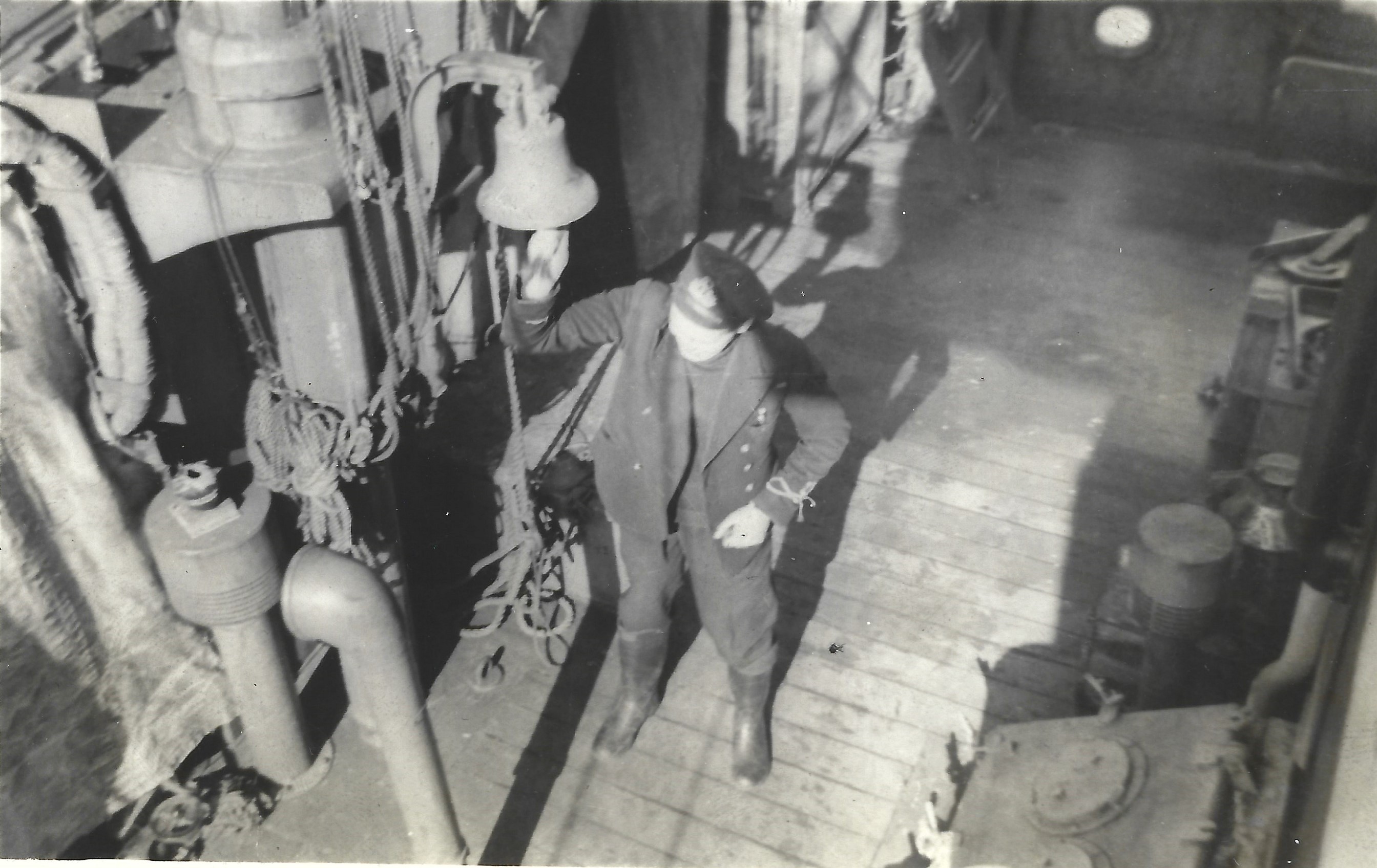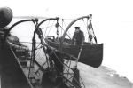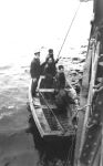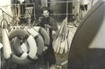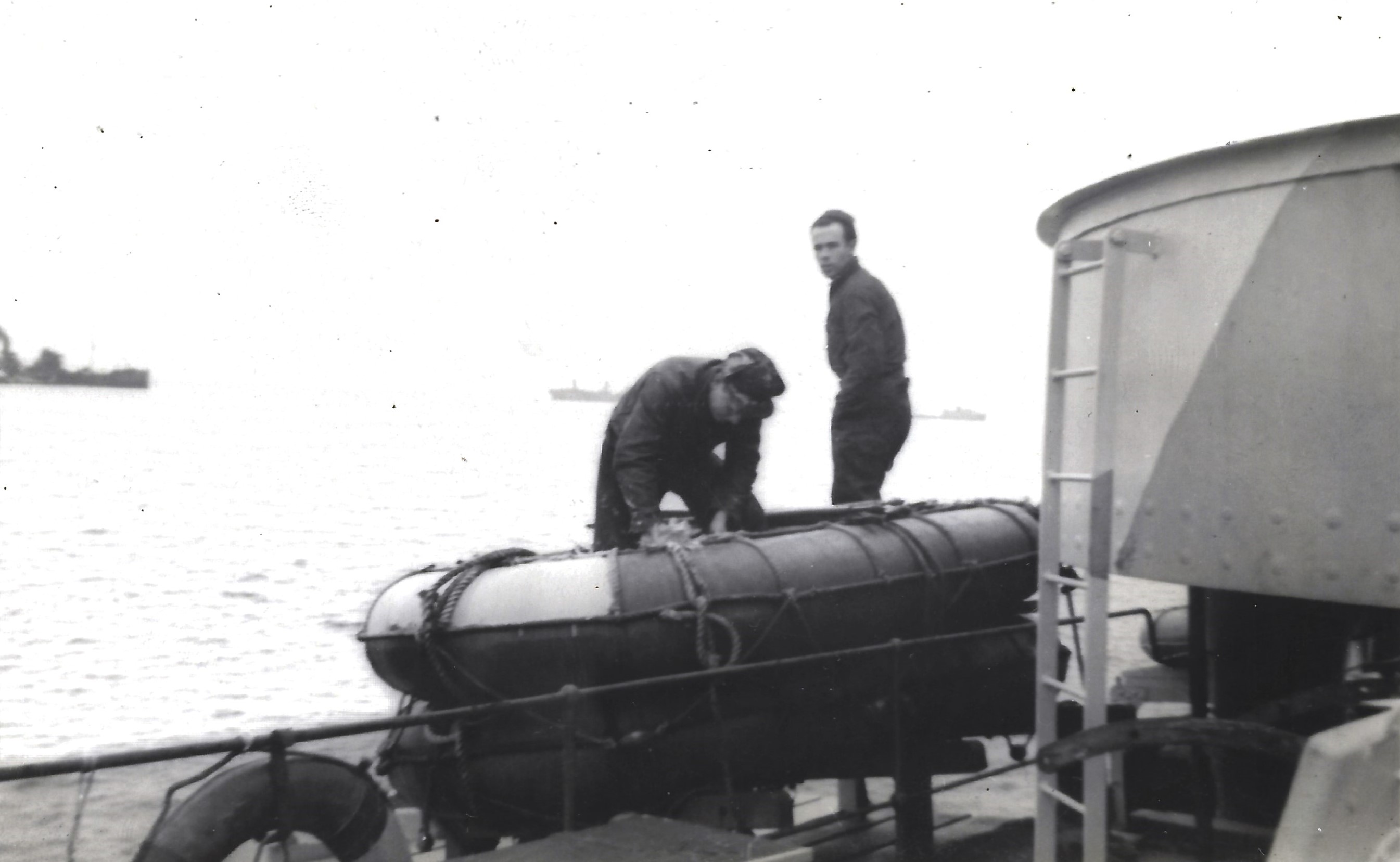 (TB25) Unknown RCNR SLt on HMCS TRILLIUM K172 about to ring the ship's bell (TB26) Two unknown sailors in a Carley float on HMCS TRILLIUM K172. One of the sailors appears to be checking the ropes securing the float (TB27)