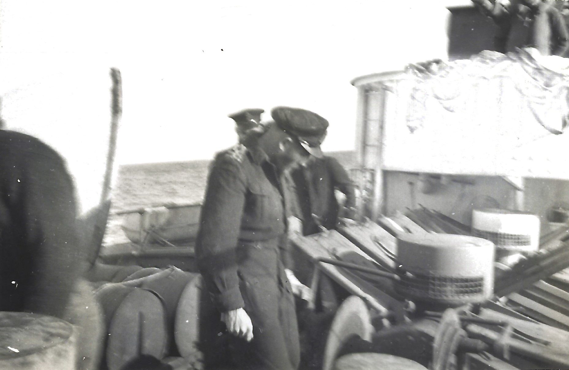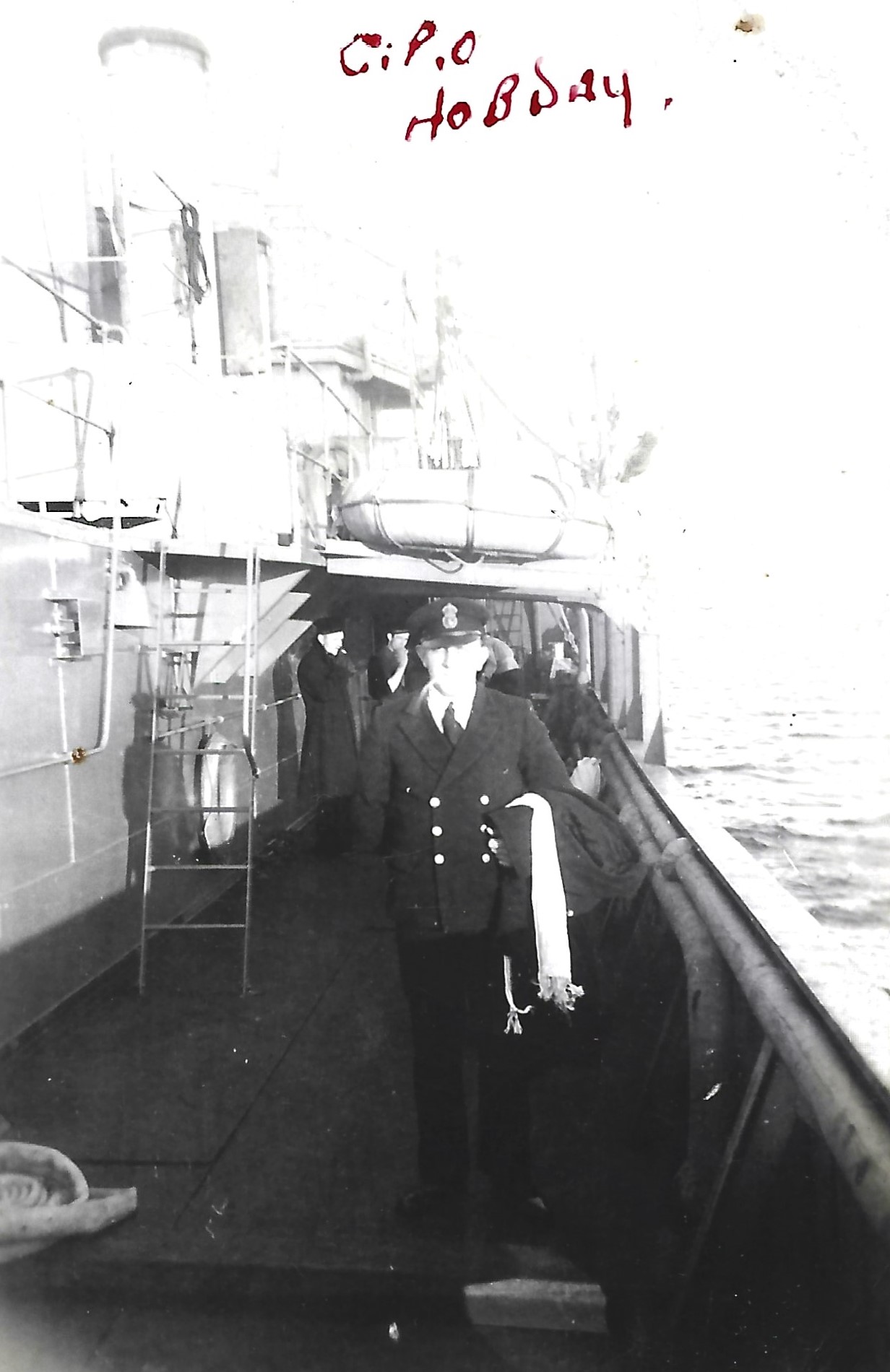 (TB35-TB36) Unknown sailor transferring supplies from unknown corvette to HMCS TRILLIUM K172 via a plank between ships (TB37) Unknown RCNR Lt, possibly the CO, inspecting the ship by the engine room skylights on HMCS TRILLIUM K172 (TB38) Unknown Chief Petty Officer on HMCS TRILLIUM K172 (TB39) Unknown officer on HMCS TRILLIUM K172 painting the anti-splinter mats on the forward gun deck