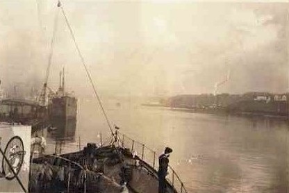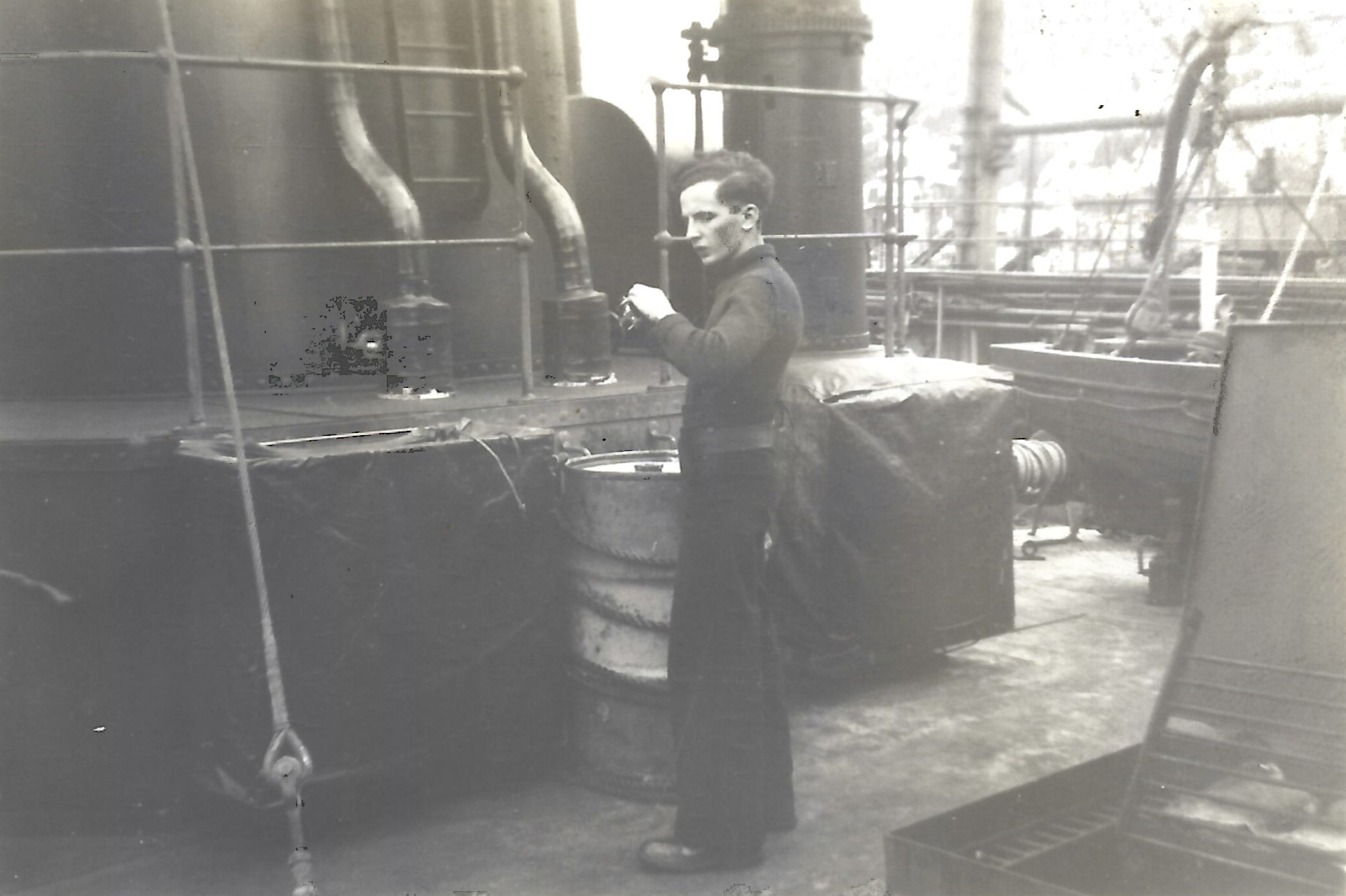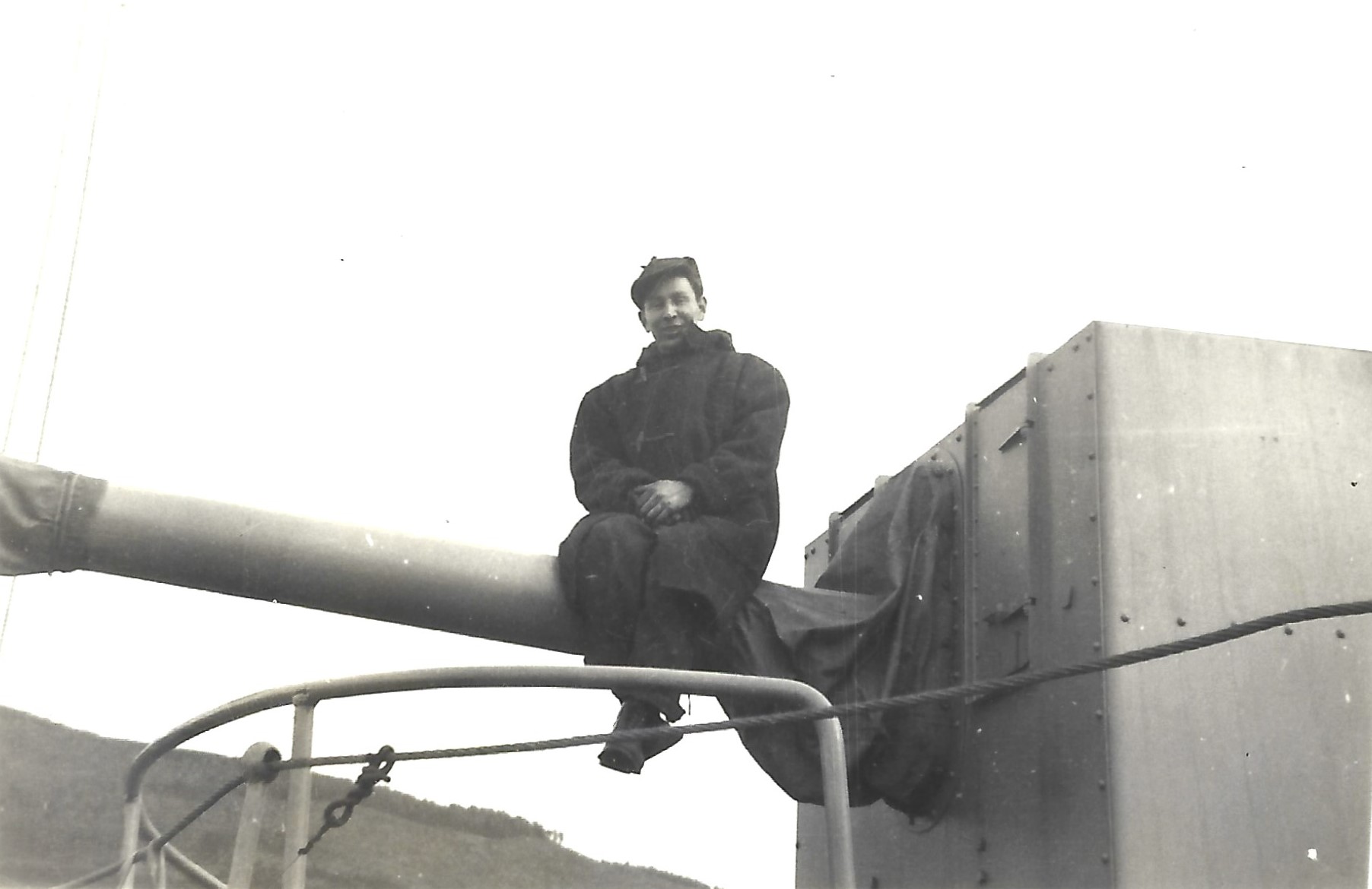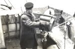 (TB10) One of three casualties on board HMS TRILLIUM K172 who were killed when TRILLIUM was staffed by a German plane on 12 Apr 1941. Though manned mainly by a Canadian crew, TRILLIUM was built for the Royal Navy. She was transferred to the RCN 15 May 1941. (TB11) Leading Stoker Campbell on HMCS TRILLIUM K172 (TB12) OS Cottrell on HMCS TRILLIUM K172 (TB13) Jack Hollands in the crow's nest on HMCS TRILLIUM K172 (TB14) Bill Owens on the barrel of the 4-inch gun on HMCS TRILLIUM K172