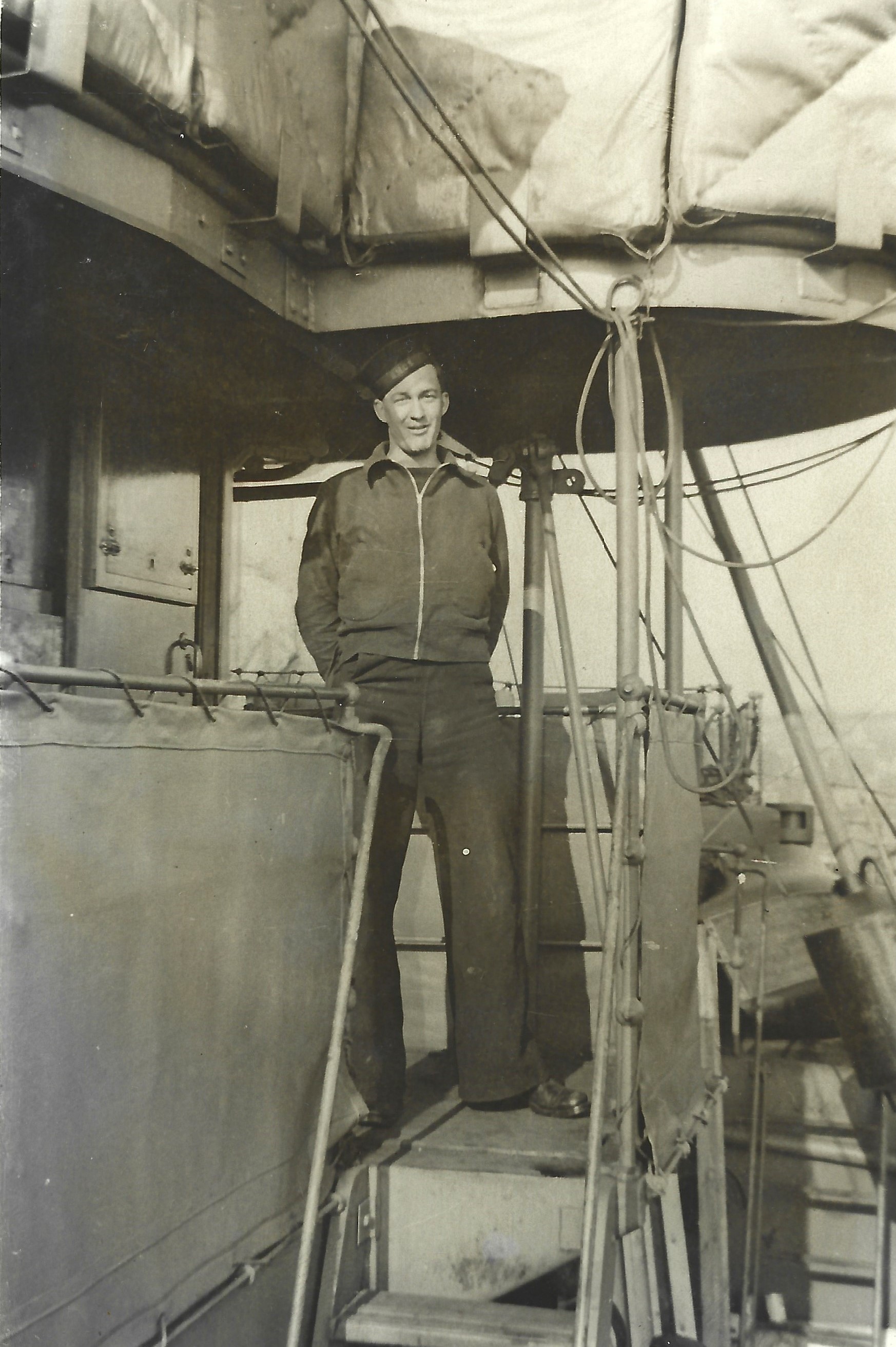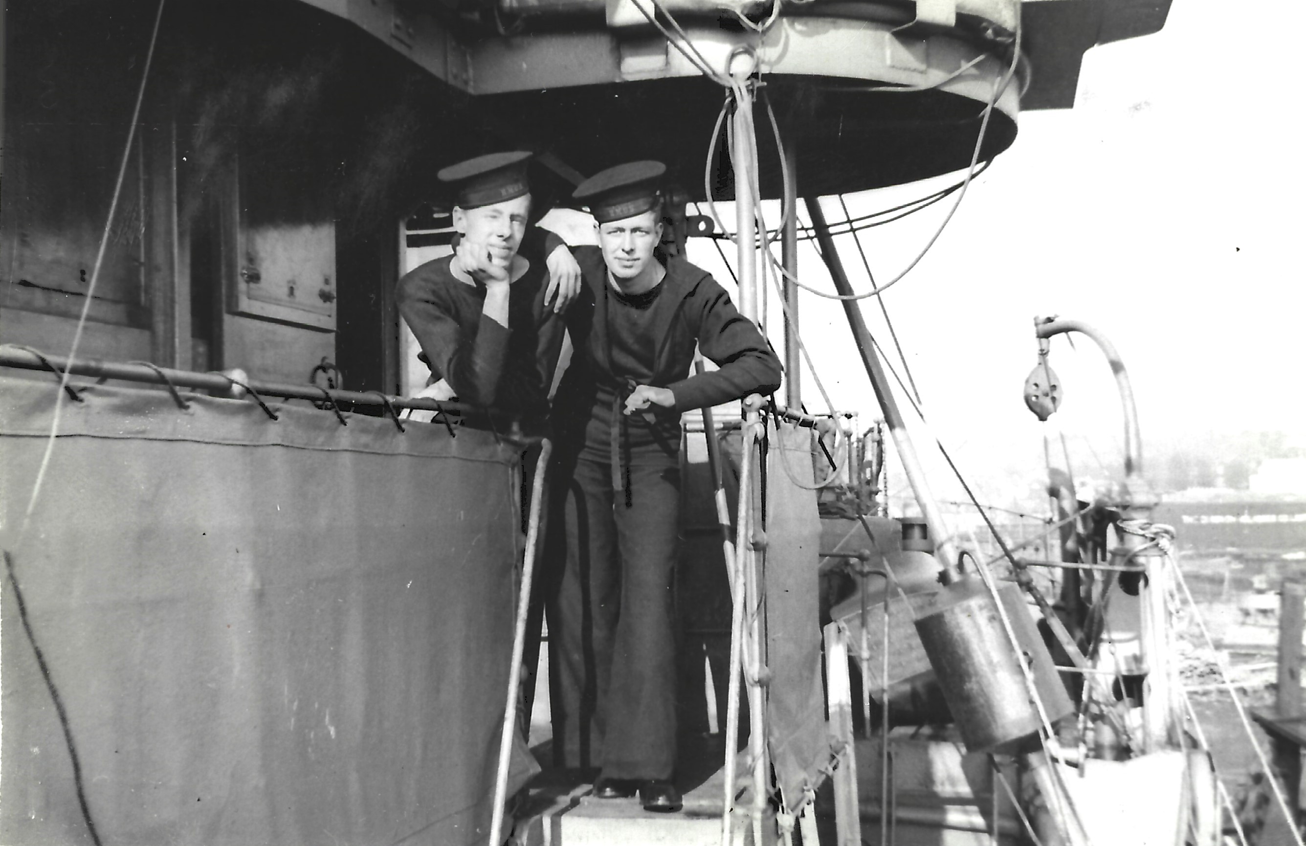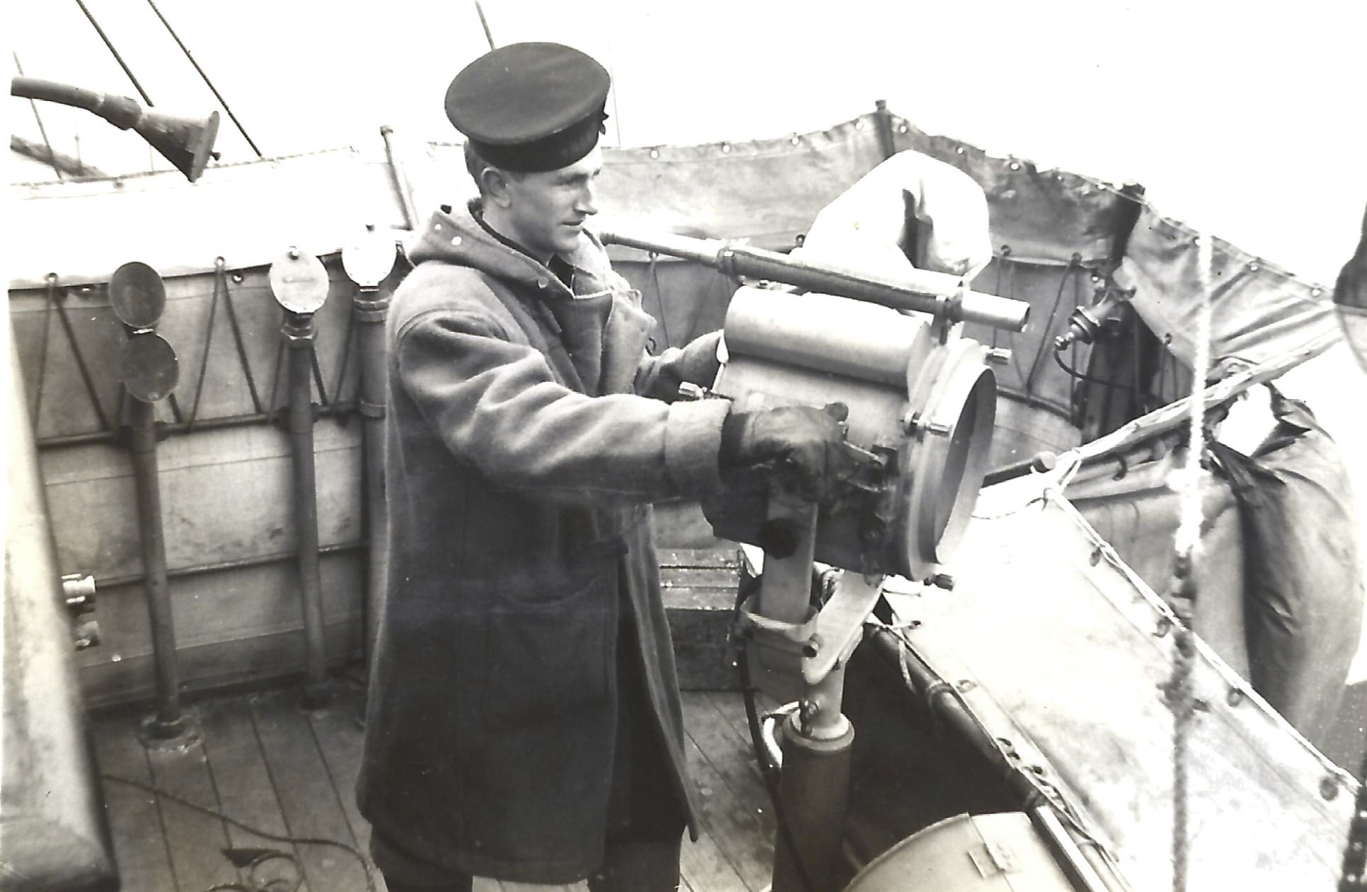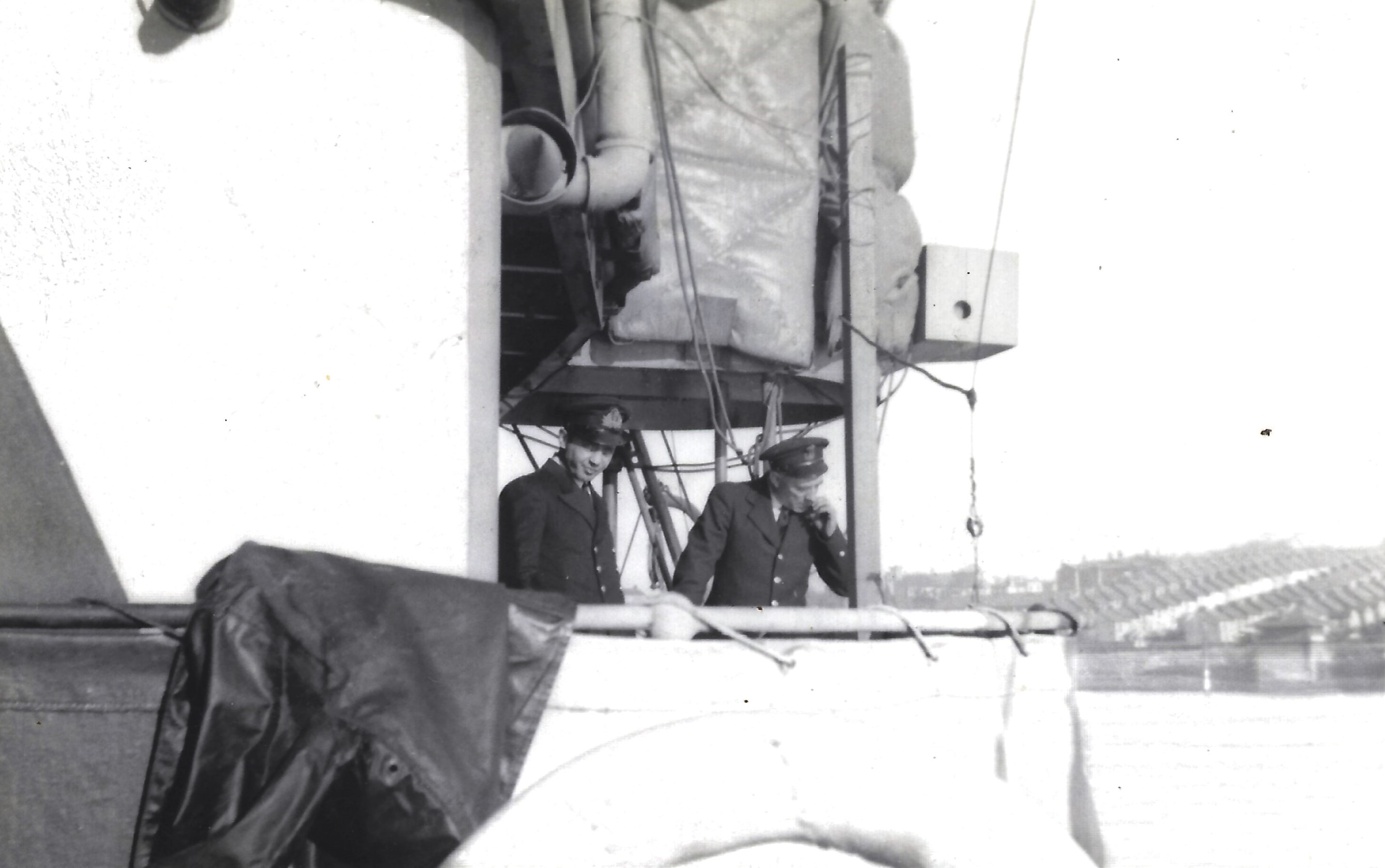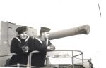 (TB15) "Spud" Gillan with Cook Blakenby on HMCS TRILLIUM K172 (TB16) Unknown sailor as on watch as Quartermaster on HMCS TRILLIUM K172 (TB17) "Spud" Gillan and Frank by the 4-inch gun on HMCS TRILLIUM K172 (TB18) F. Williams and Macmillan on HMCS TRILLIUM K172 (TB19) Ted Brown manning the twin .50 cal machine guns on HMCS TRILLIUM K172