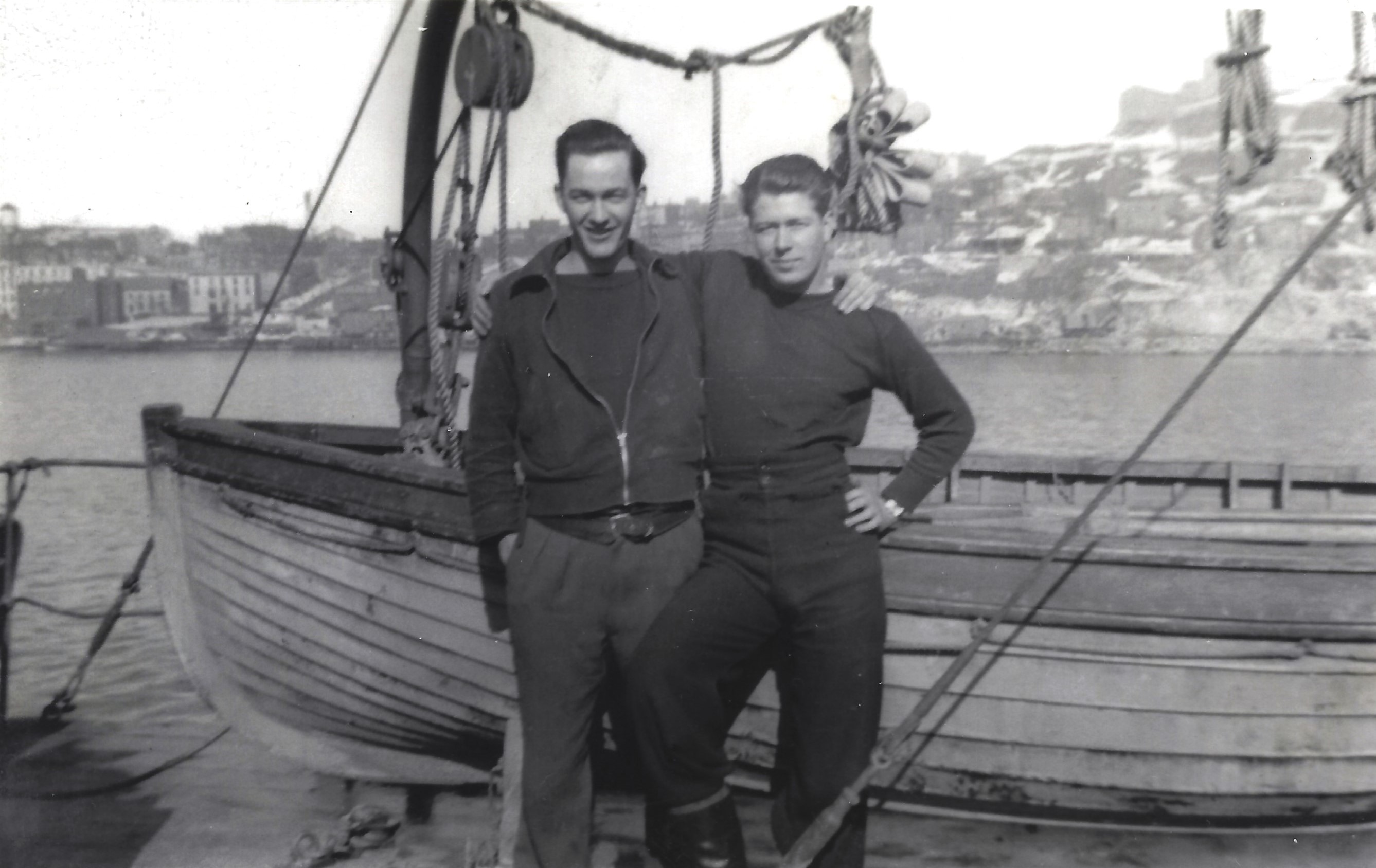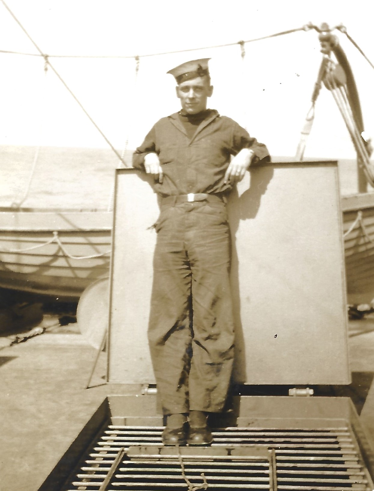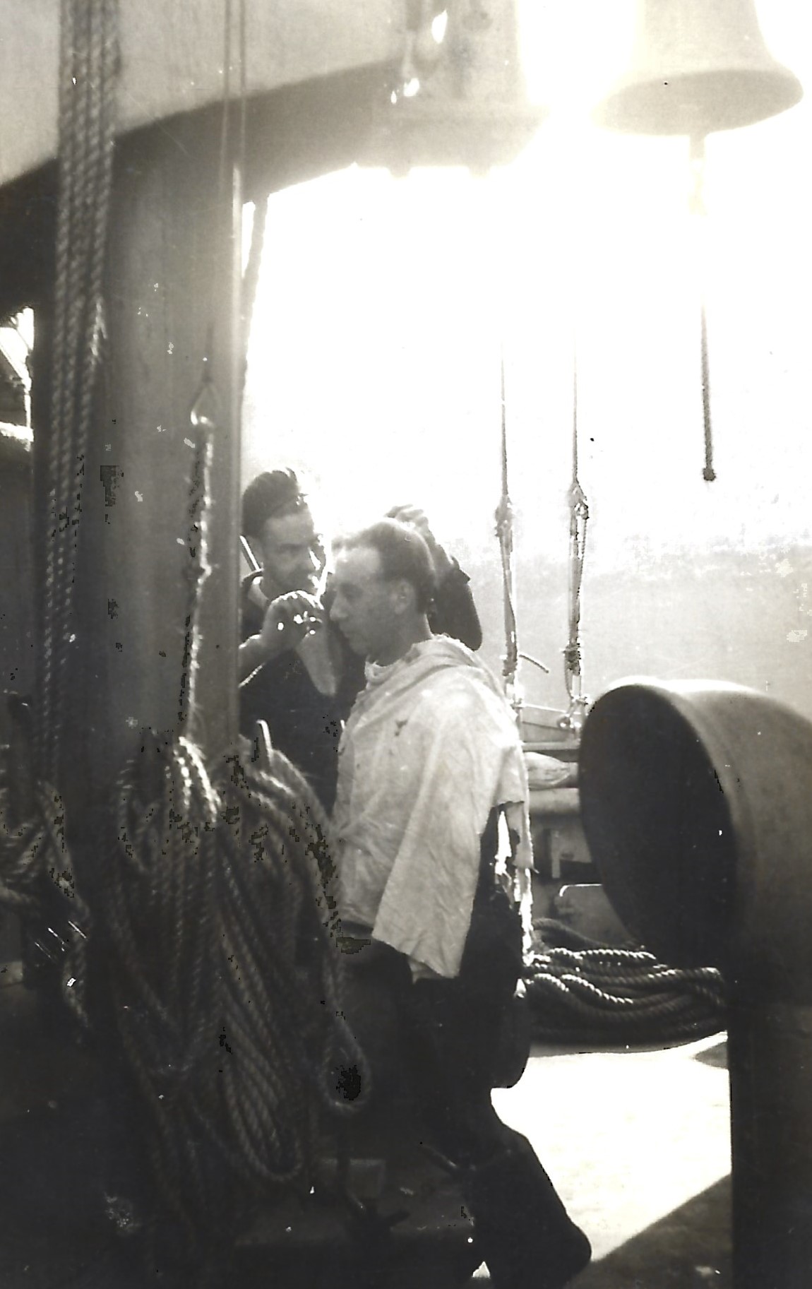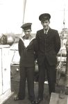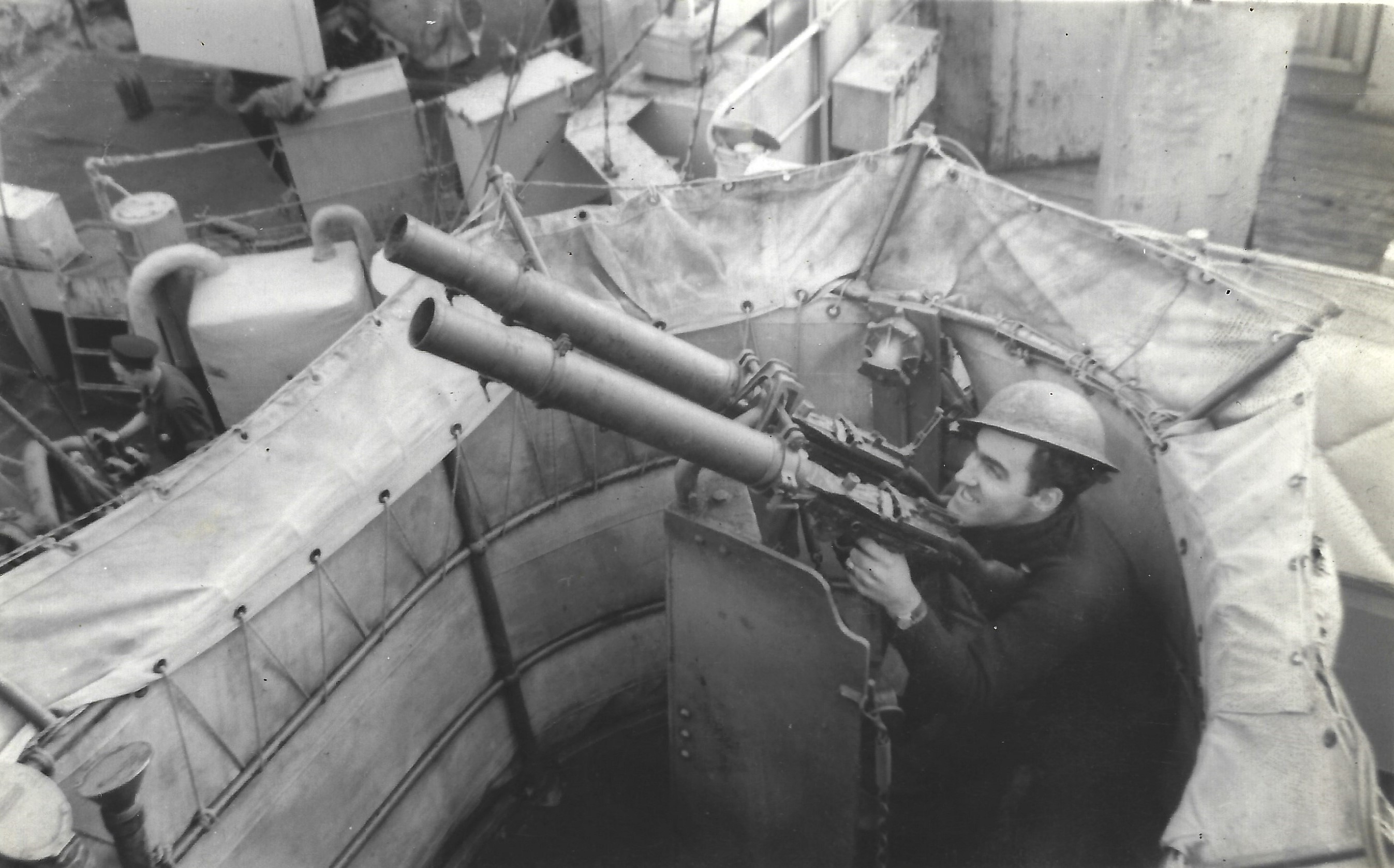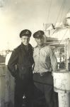(TB15) "Spud" Gillan with Cook Blakenby on HMCS TRILLIUM K172 (TB16) Unknown sailor as on watch as Quartermaster on HMCS TRILLIUM K172 (TB17) "Spud" Gillan and Frank by the 4-inch gun on HMCS TRILLIUM K172 (TB18) F. Williams and Macmillan on HMCS TRILLIUM K172 (TB19) Ted Brown manning the twin .50 cal machine guns on HMCS TRILLIUM K172
