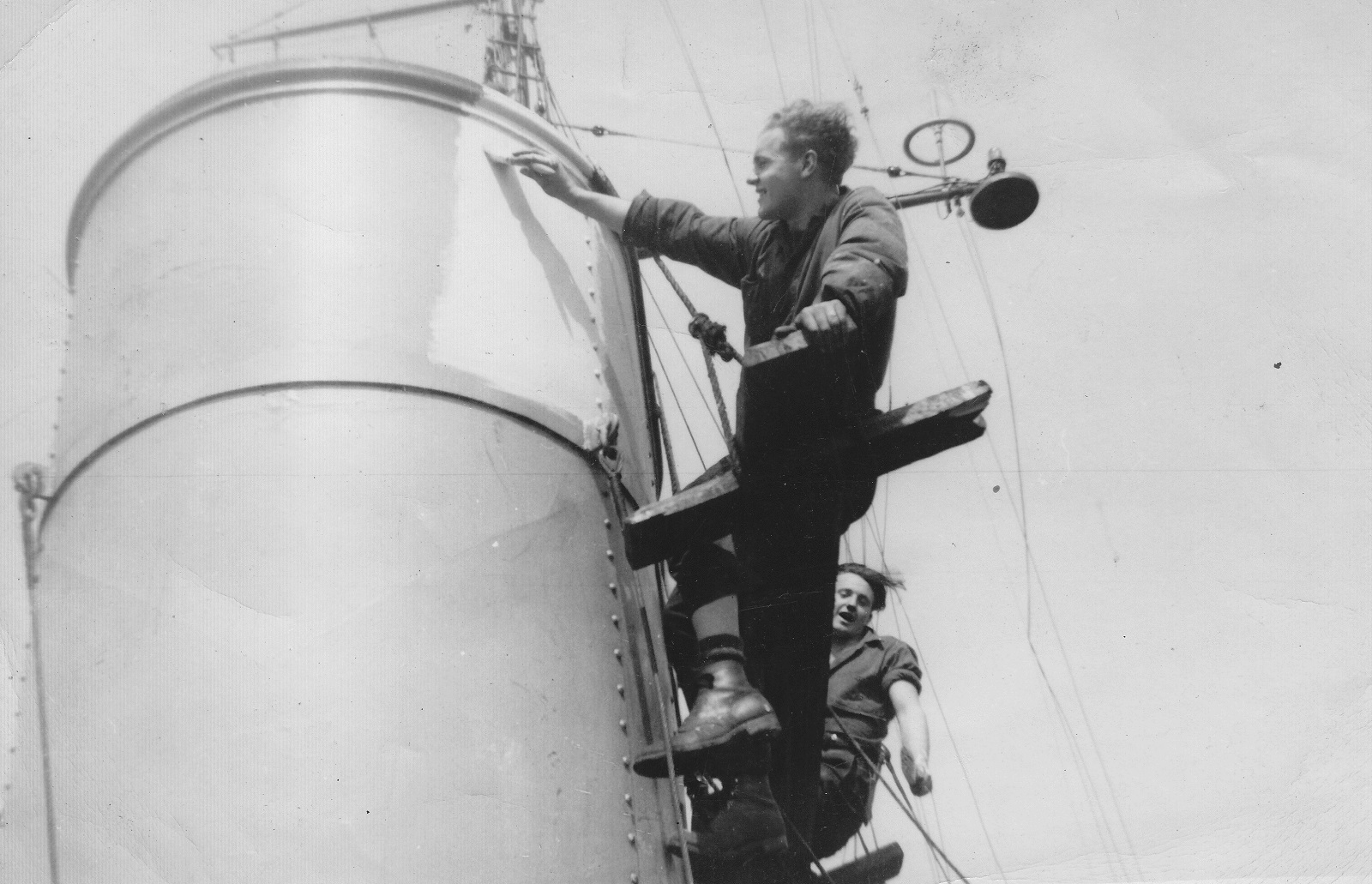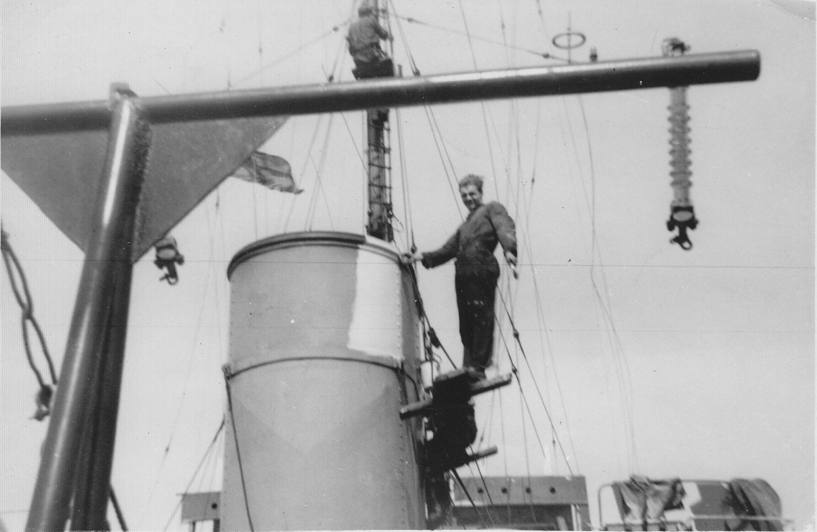 (JW01) John Wall on leave  (JW02) HMCS TROIS-RIVIÈRES  (JW03) "Painting the Stack - Refit Lunenburg 1945"  (JW04) "Kind a windy up there - Lunenburg 1945"  (JW05) Sailors relaxing on the quarterdeck of HMCS TROIS-RIVIÈRES during refit in Lunenburg - 1945  (JW06) Quarterdeck of HMCS TROIS-RIVIÈRES as seen from the crow's nest.  Looks like laundry day