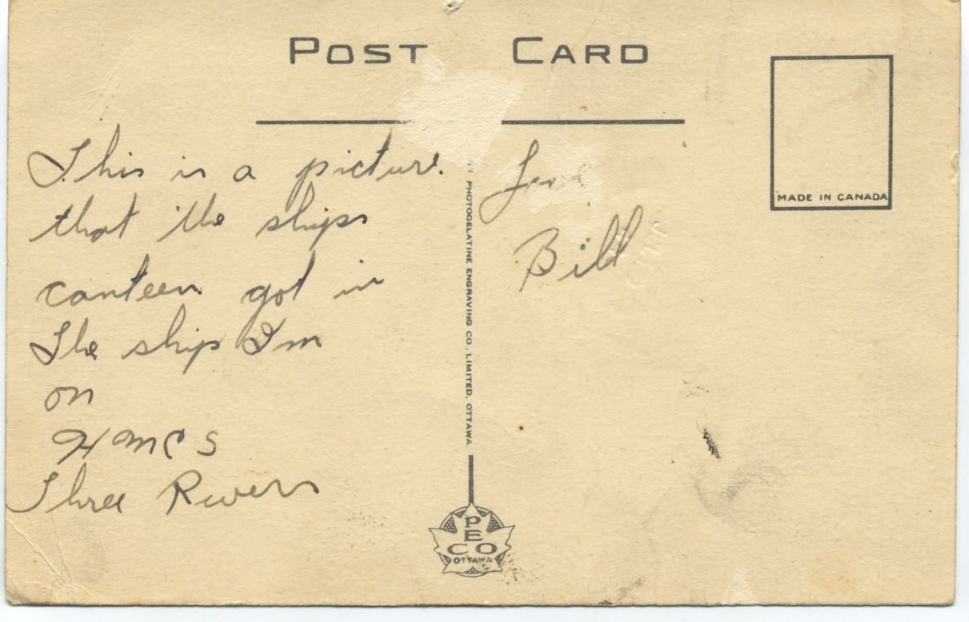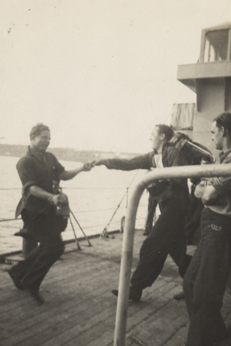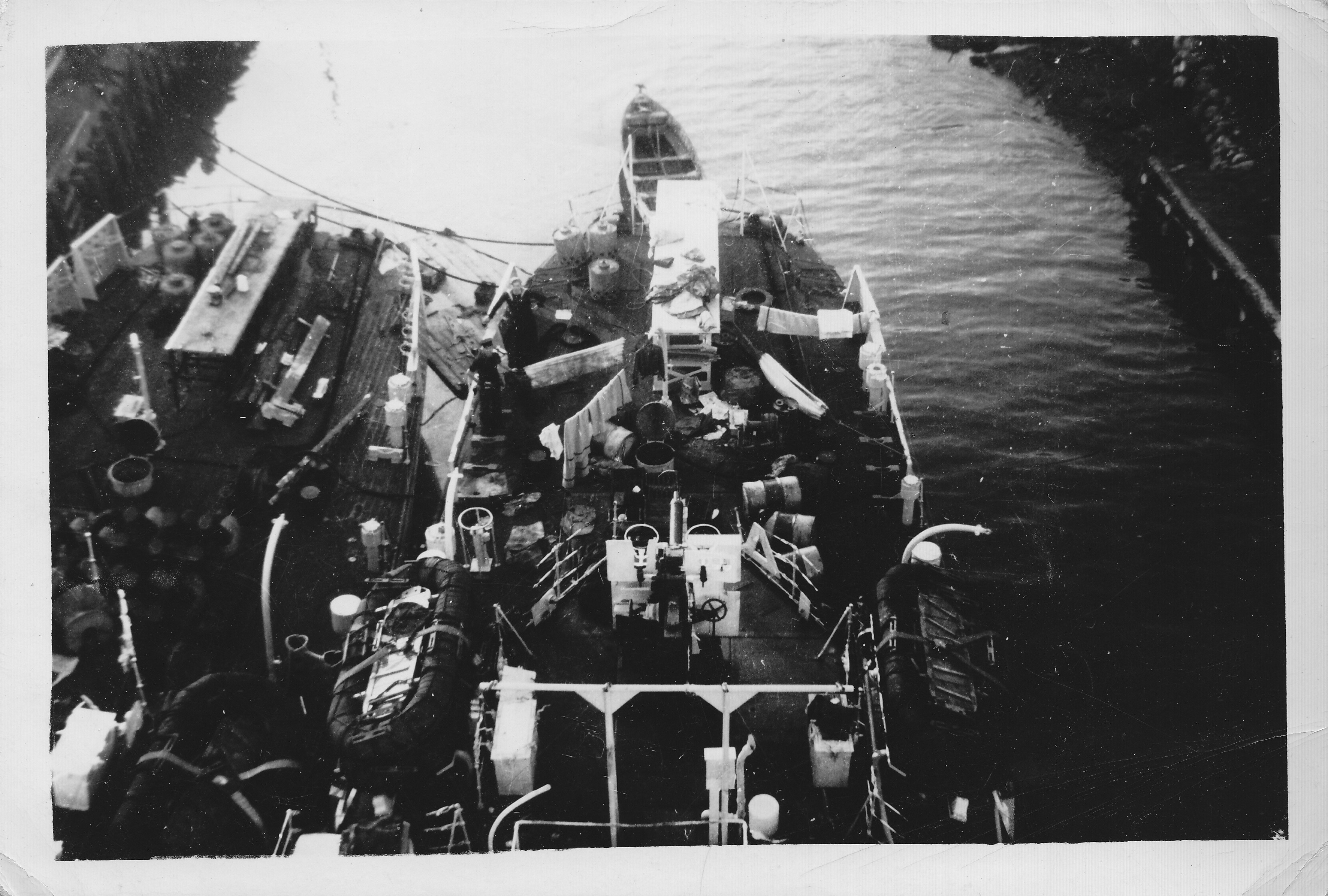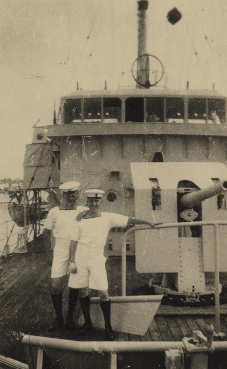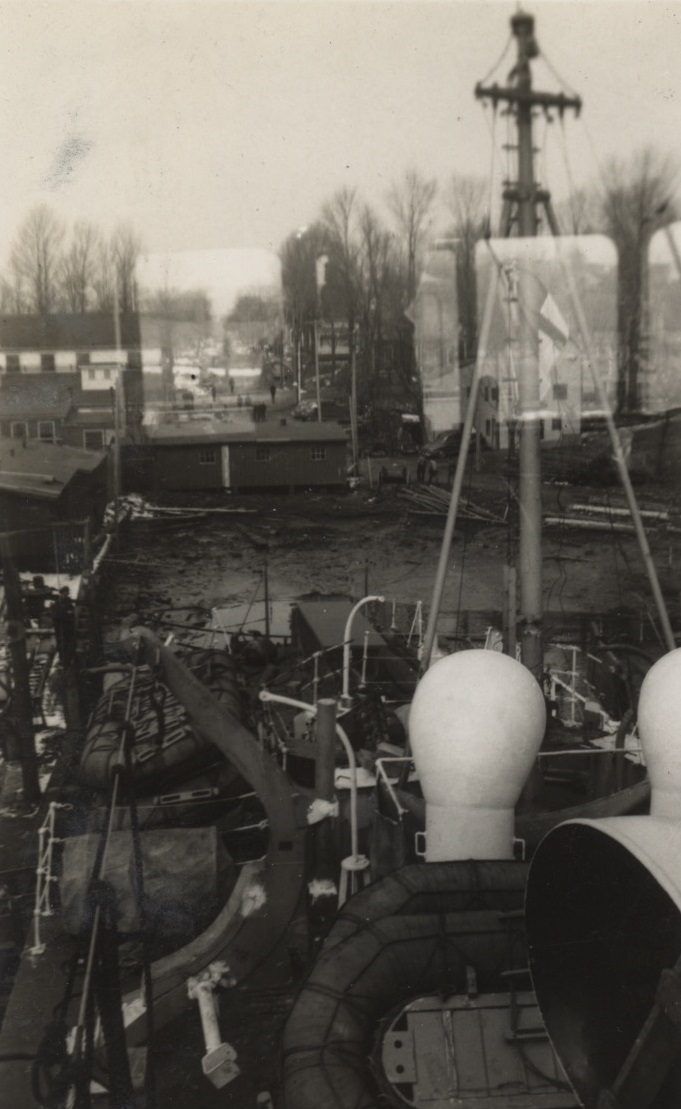 (JW07) HMCS NIPIGON J154 outboard minesweeper  (JW08) HMCS TROIS-RIVIÈRES "in slips - taken from mast - 1945"  (JW09) Unidentified sailor "sitting in the vent - HMCS TROIS-RIVIÈRES - 1945"