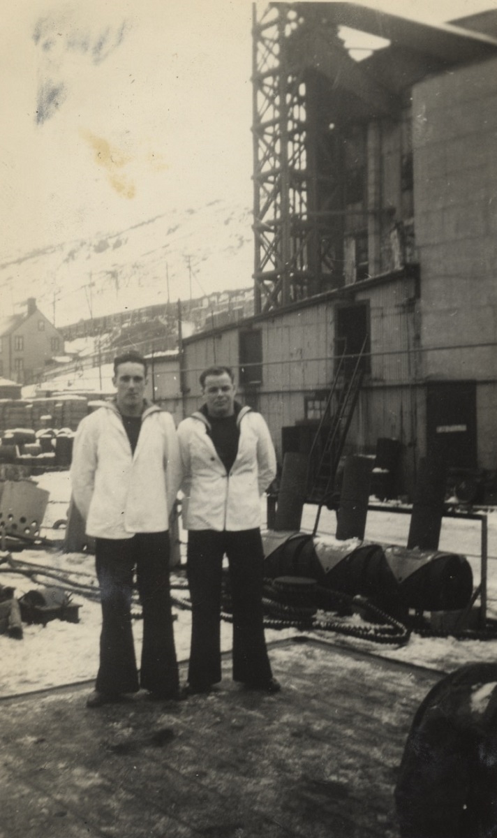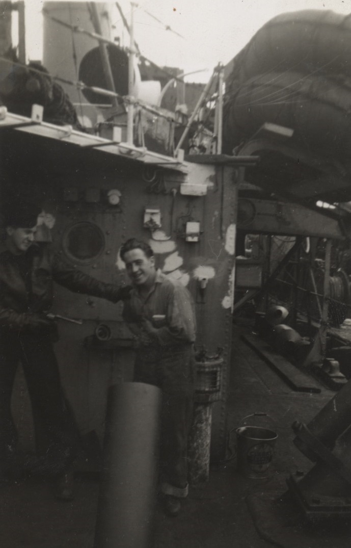 Two unknown sailors on the quarterdeck of HMCS TROIS-RIVIÈRES J269 (in what appears to be St. John's, Nfld)