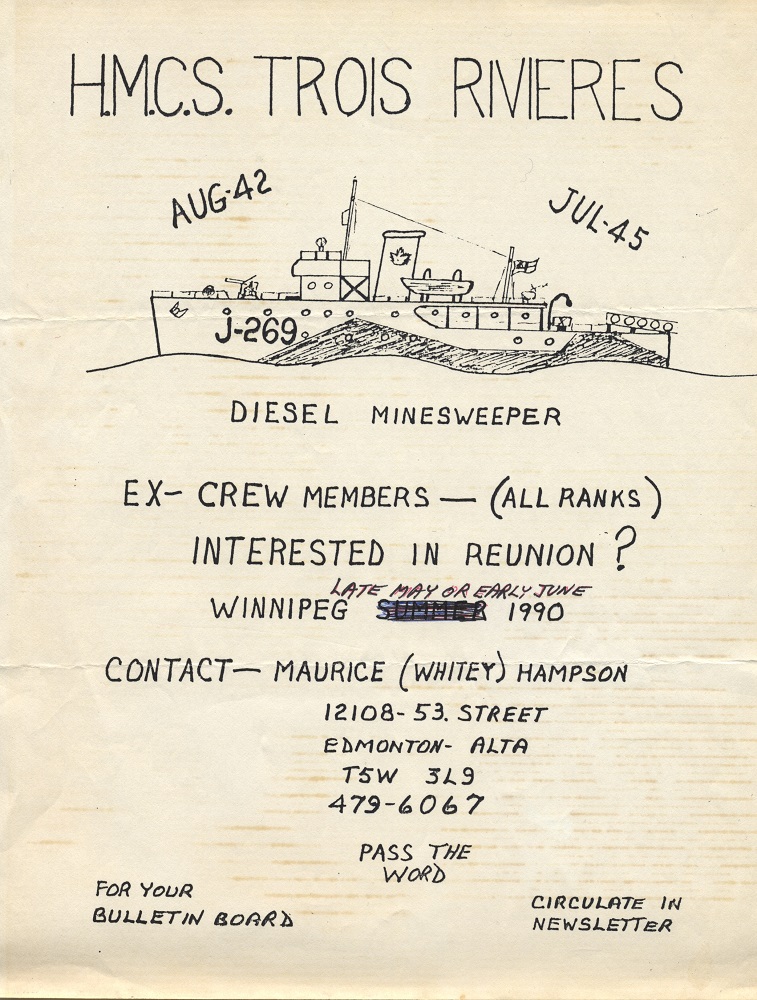Flyer by Maurice Hampson to organize a TROIS-RIVIÈRES reunion in 1990