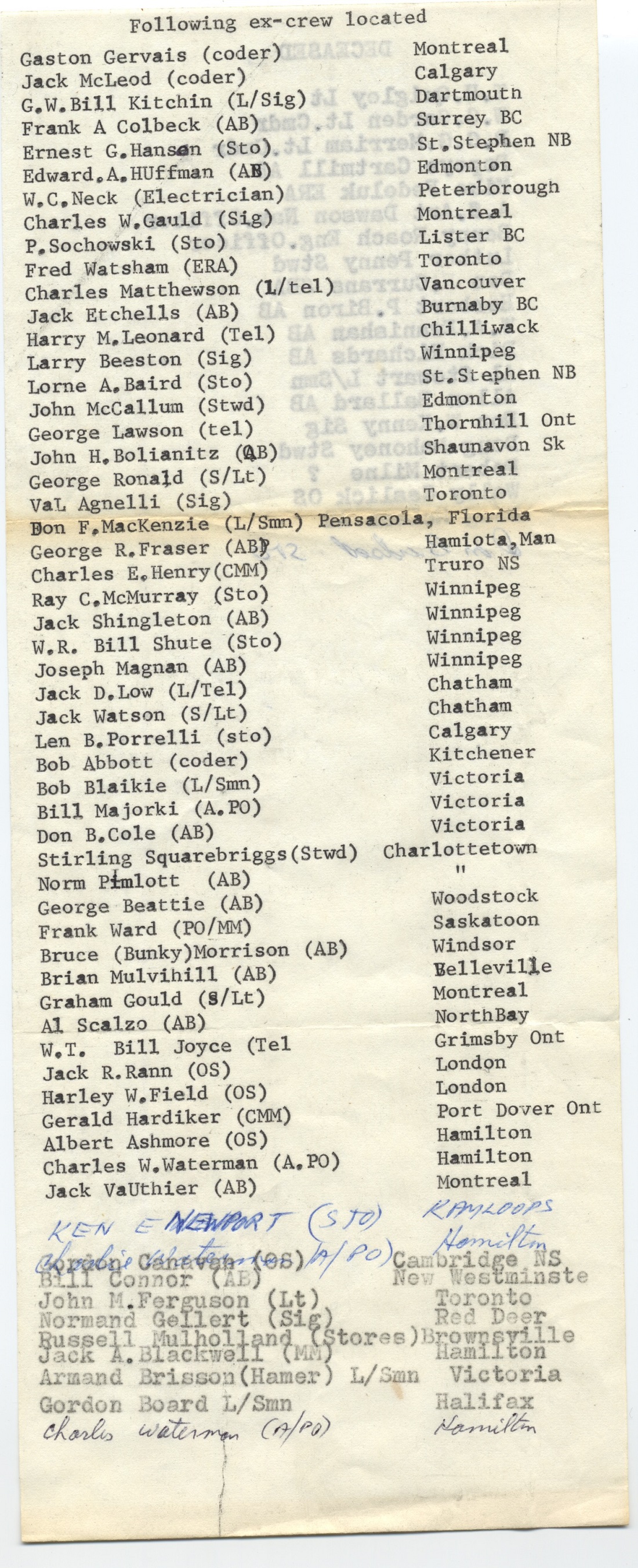 Contact list of former crew members put together in the lead up to the 1990 reunion