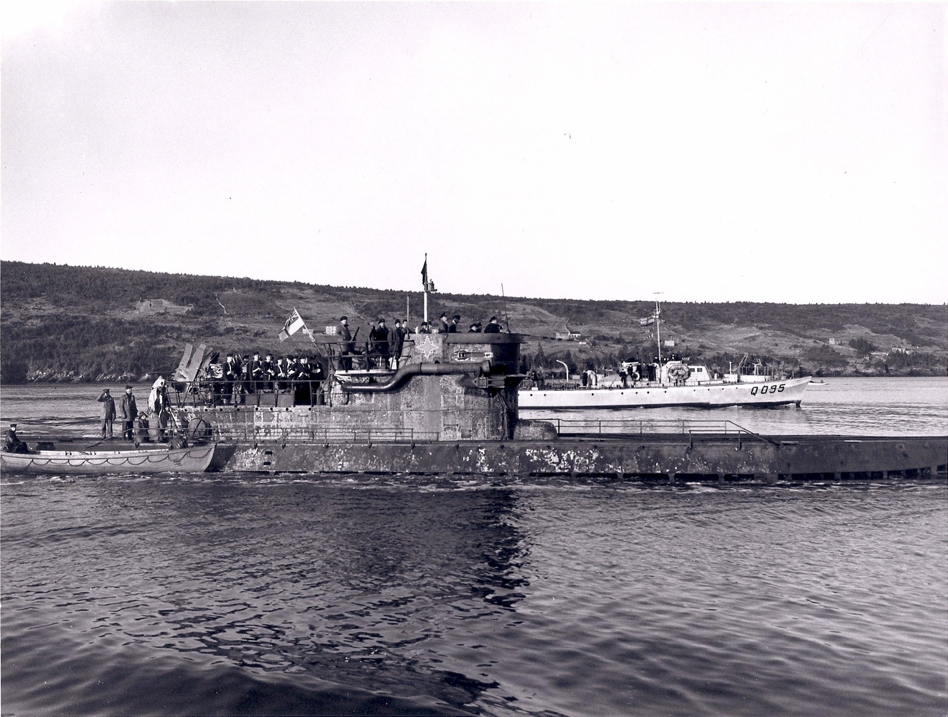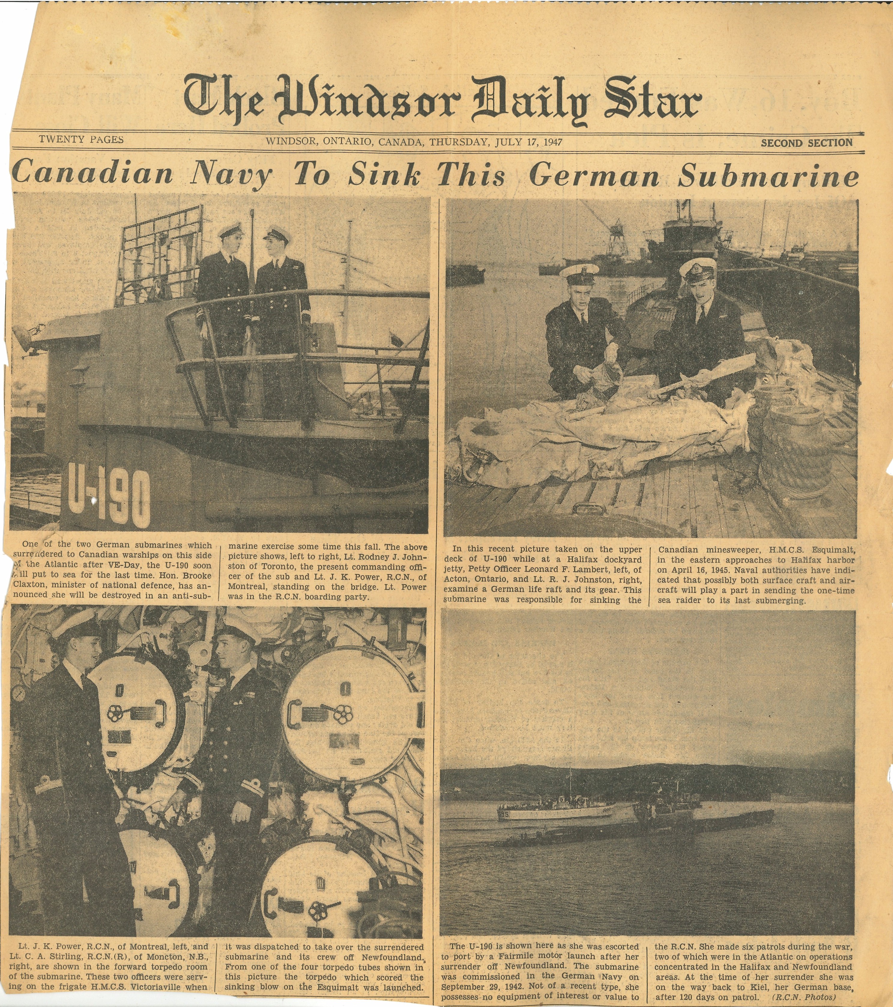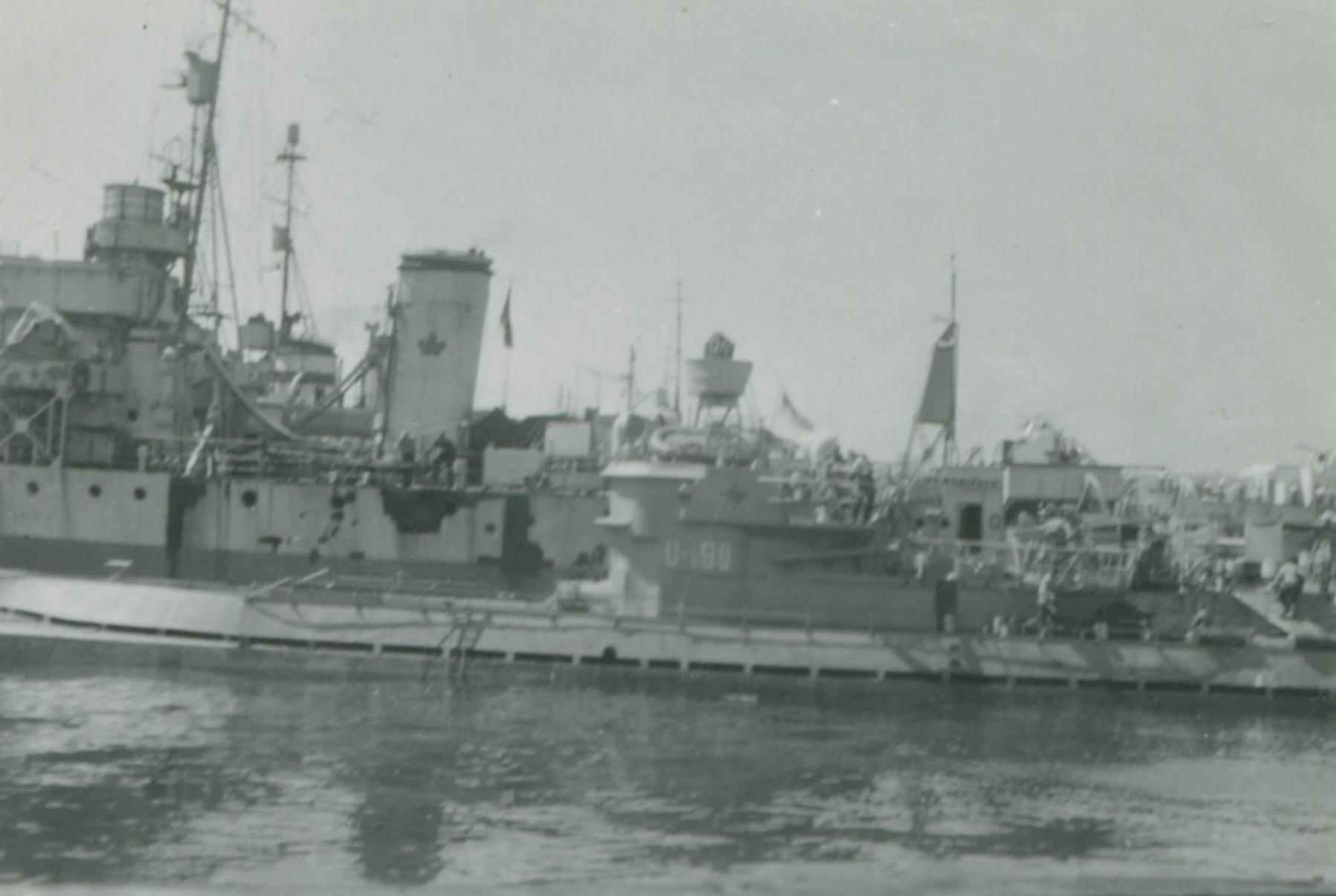 (U190-016) Surrender of U-190 - Front page of the Daily News, St. John's Newfoundland, 15 May 1945 // From the collection of Nicholas Choppe // Courtesy of Trudy Choppe (U190-017) German POWs from U-190 // The Daily News, St. John's Newfoundland, 15 May 1945 // From the collection of Nicholas Choppe // Courtesy of Trudy Choppe (U190-018) Surrendered U-190 at St. John's, Nfld // From the collection of Willie Waugh // Courtesy of Brian Lapierre (U190-019) Surrendered U-190 // RCN photo # E-5082Y // Courtesy of the Comox RCAF Museum (190-020) HMCS U-190 alongside at Quebec. The ship is open to visitors // HMCS Thetford Mines was also in port at the same time as HMCS U-190 // Courtesy of the Thetford Mines Archives Center / Centre d'achives de la région de Thetford