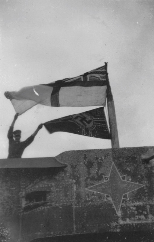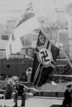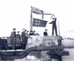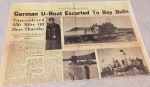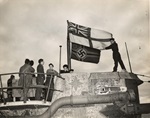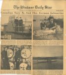 (AD81) Newspaper article showing U-190 entering the narrows at St. John's, Nfld with a copy of her surrender document above (AD82) U-190 passing the anti-submarine nets as she enters the narrows at St. John's, Nfld // RCN Neg # Z-1470 (AD83) U-190 in harbour at St. John's, Nfld // RCN Neg # Z-1474 (AD84) Sailor posing for photo holding up White Ensign and Nazi flag on U-190 // RCN Neg # 1475 From the collection of Allan Dougall, LCdr (E), RCN(R) Courtesy of David Dougall