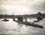 (U190-001)HMC U-190 pennant. A British Bull dog with a German Eagle in its mouth and U-190 in the background // From the collection of Robert C. Foster, Submariner, Royal Navy // Robert Foster was part of the boarding crew for U-190 when she surrendered and also part of the crew when U-190 was commissioned into the Royal Canadian Navy // Courtesy of David Foster (U190-002 - U190-003) Surrendered German U-boat U-190 flying the black flag of surrender under escort of HMCS VICTORIAVILLE and HMCS THORLOCK // From the collection of AB Radar III Robert Stone, RCNVR // Courtesy of Julia Payne (U190-004) U-190 entering St. John's Harbour // Courtesy of Chris Carnell (U190-005) U-190 passing the anti-submarine nets as she enters the narrows at St. John's, Nfld // RCN Neg # Z-1470 // Courtesy of the Naval Museum of Halifax