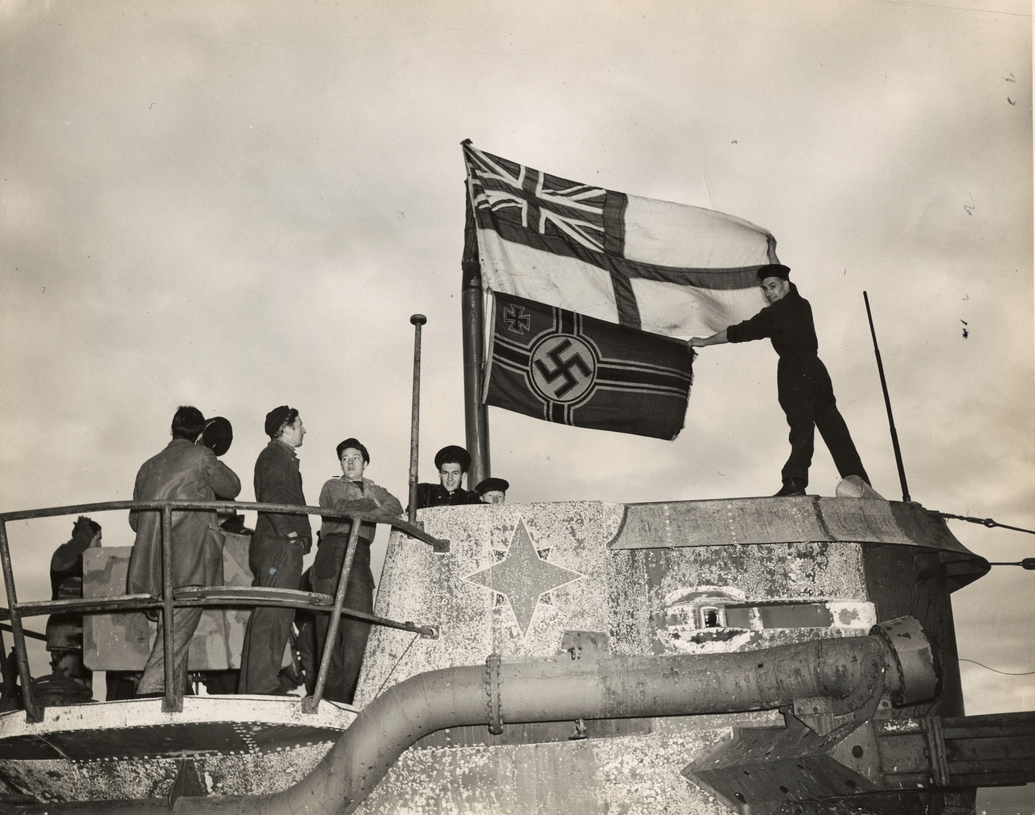 (CNMAA001) U-190 - surrendered - entering harbour at St. John's, Newfoundland (CNMAA002) Canadian sailor holds the White Ensign above a German submarine in St. John's, Newfoundland, in 1945 // Library and Archives of Canada / PA 145577 / MIKAN ID 3191842 // Robert C. Foster, RN Submariner, 4th from left (with hands in pockets of his overalls) (CNMAA003) Unknown civilian and military personnel on U-190 (CNMAA004) Unknown Canadian sailor on the conning tower of U-190 // Library and Archives of Canada / PA 6569 (CNMAA005) U-190 // Library and Archives of Canada / PA 6570