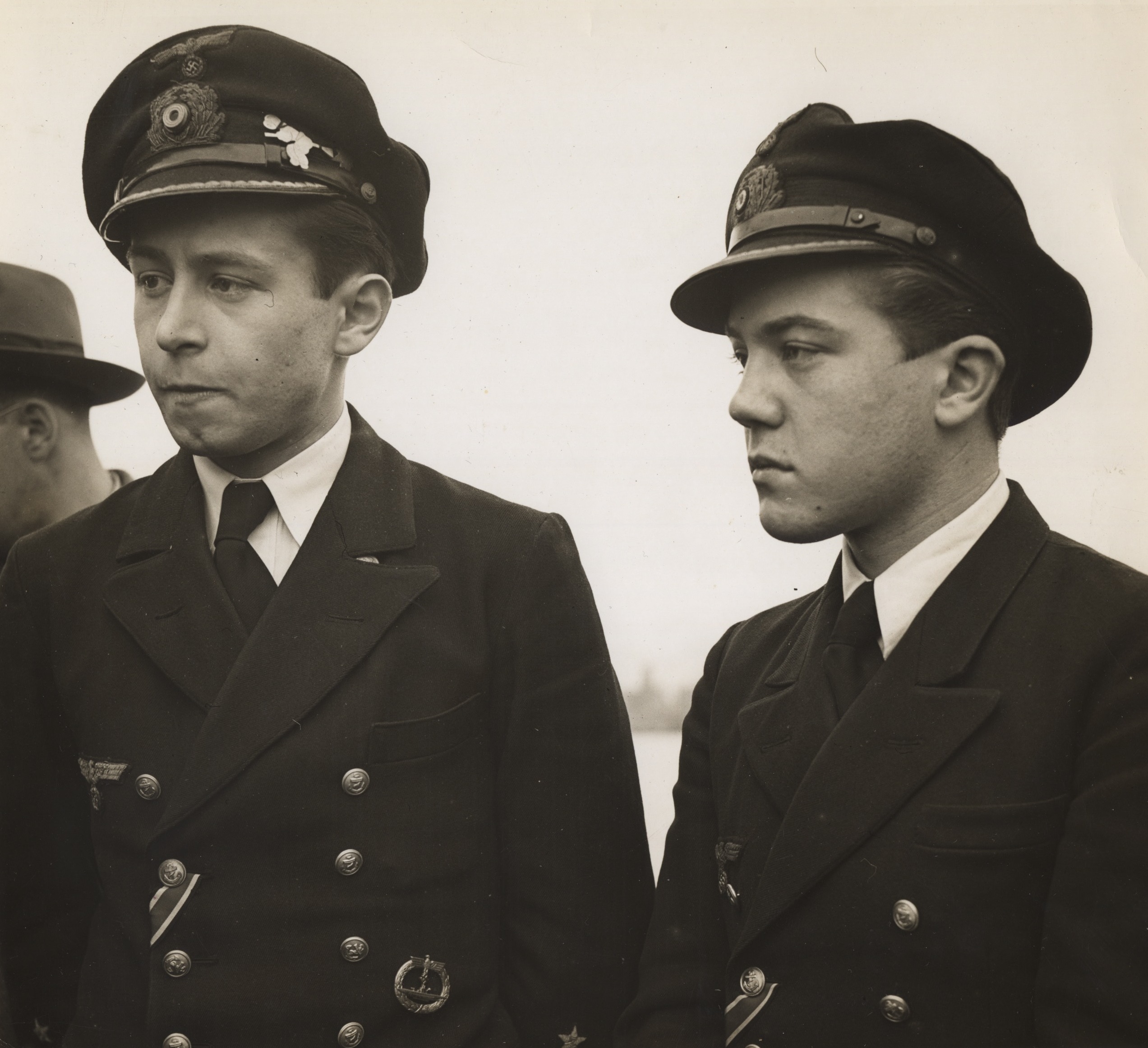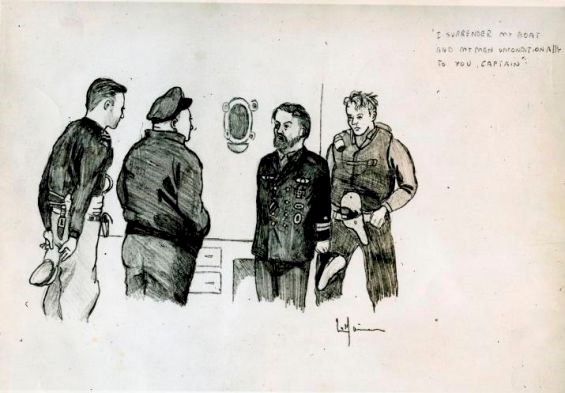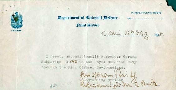 (U190-006) When the U-190 surrendered in May 1945, the senior officers included: Lt Werner Muller, 22 years old, and Lt Ernst Glenk, 21 years old, both veterans of three years in the U-boat fleet. // From the collection of William Connor // Photo given to him by a friend who was a RCN photographer // Courtesy of Jason Salter (U190-007) In the early hours of 12 May 1945, Hans-Erwin Reith, U-190's commander, signed this document formally surrendering the submarine to the Royal Canadian Navy. Although units of the Royal Canadian Navy had been involved in the boarding or surrender of U-Boats during the war, this document marked the first formal surrender of a German submarine to Canadian forces. Kenneth George Tryon, one of U-190's commanders when the submarine was in the Royal Canadian Navy between 1945 and 1947, donated this document and related artifacts to the Canadian War Museum in 1968. // Source: George Metcalf Archival Collection // CWM 19680168-009 // Courtesy of the Canadian War Museum (U190-008) In this sketch by HMCS Victoriaville's gunnery officer, U-190's captain surrenders his submarine to the captain of the Canadian frigate, Lieutenant Commander Lester Hickey (centre left, with cap). Hans-Erwin Reith (centre, with beard), U-190's commander since July 1944, subsequently signed a deed of unconditional surrender handing over the U-Boat to the Royal Canadian Navy. Lieutenant Bud Burbridge (left) was among the Canadians who would form part of the crew taking U-190 to Bay Bulls, Newfoundland. // Source: George Metcalf Archival Collection // CWM 20030255-010 // Courtesy of the Canadian War Museum (U190-009) the White Ensign flies over the Kreigsmarine Naval Ensign on the surrendered U-190 at St. John's, NFLD with HMCS ARNPRIOR in the background // From the collection of Nick Vukson // Courtesy of John Vukson (U190-010) Unknown sailor holding White Ensign and Kreigsmarine Ensign on U-190 // From the collection of Philip Goodfellow // Courtesy of Michael Goodfellow