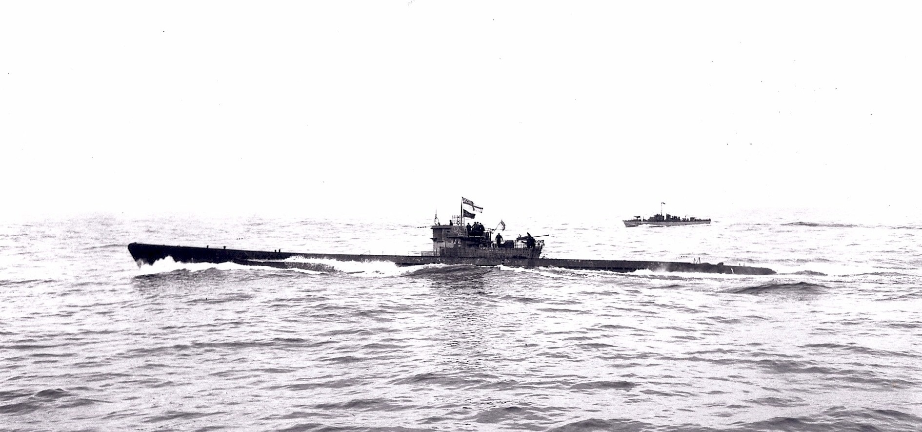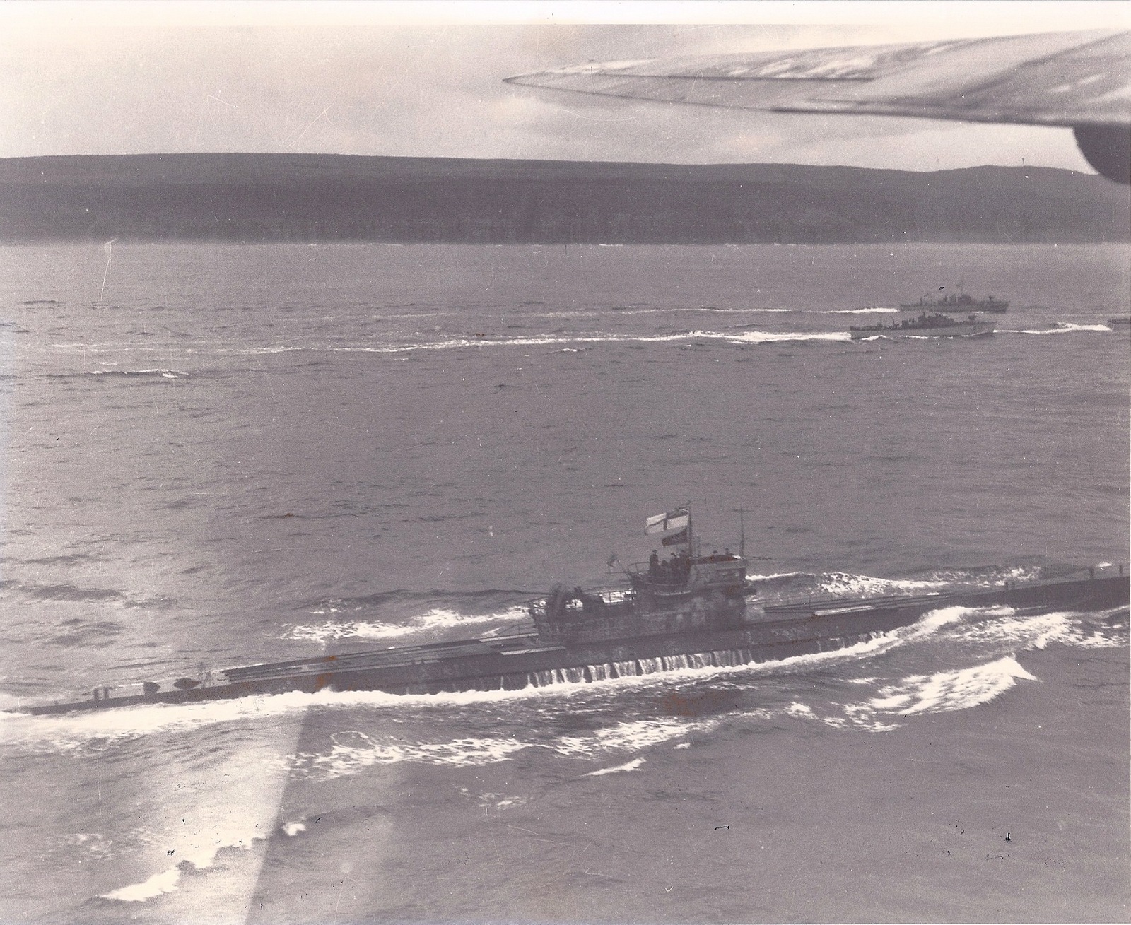 CNMAA014 Click on the above photo to view the full image Former HMCS U-190 awaits her fate. Note the tow chain on the bow, no personnel on the decks and the ships standing off in the distance. U-190 awaits to her fate as a live fire target // Credit: Library and Archives of Canada / PA 112878 Courtesy of Bruce Bennett, President, the Crow's Nest Military Artifacts Association