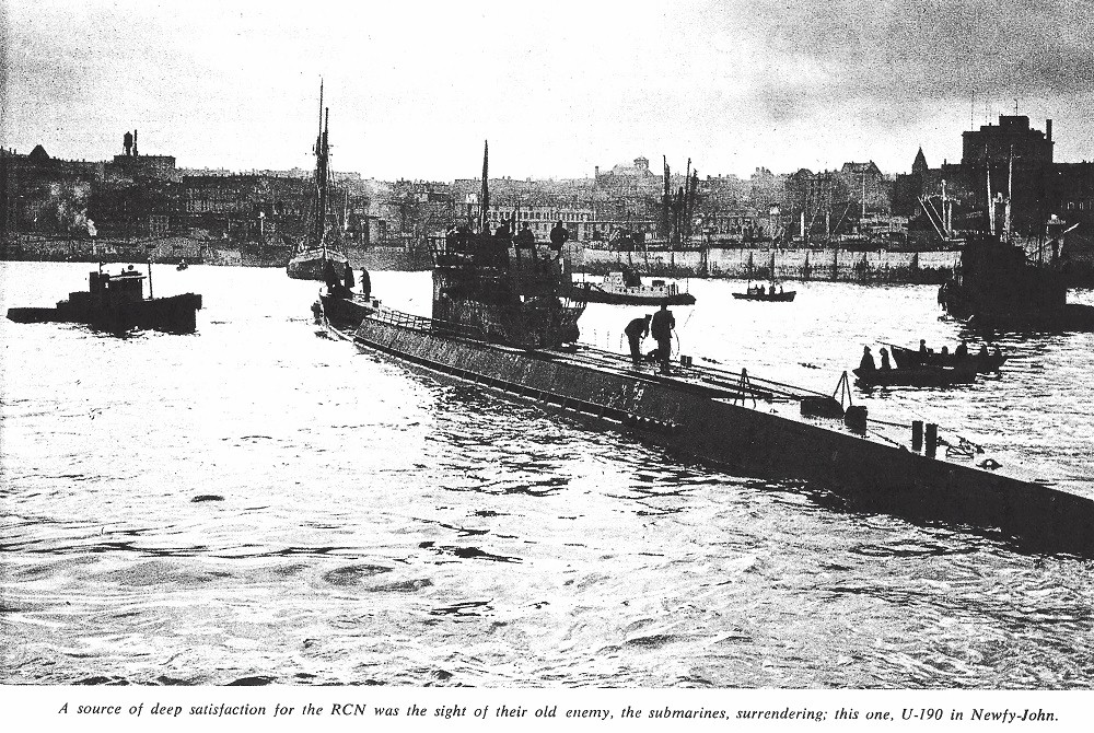 (RC61) Surrendered U-190 at St. John's, NFLD. Note: HMCS HAWKESBURY K415 across the harbour behind U-190 (RC62) Surrendered U-190 at St. John's, NFLD, after the war (RC62) The White Ensign flies over the Kreigsmarine Naval Ensign on the surrendered U-190 at St. John's, NFLD (RC63) Surrendered U-190 at St. John's, NFLD. HMCS LANARK on the left of the photo and HMCS ARNPRIOR on the right (RC64) HMCS U-190 Photographer unknown From the collection of Roy T. Cardy Courtesy of Dennis Cardy