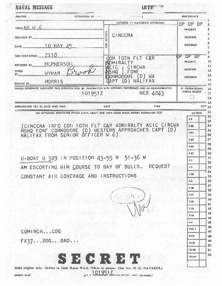 (U190-021) Newspaper article on the pending demise of U-190 as a target ship // The Windsor Daily Star 17 Jul 1947 // From the collection of LS Herbert Knight, M.I.D., RCNVR // Courtesy of Carole Dibbley (U190-022) Canadian Naval message on the surrender of U-190 // From the collection of John (Jack) Campbell // Courtesy of Spencer Campbell // Webmaster's Note: The message refers to the surrendered sub under escort as U-329 (which was never completed). Perhaps there was mis-understanding on the RCN ships as to the identity of their prisoner's vessel, but in the end it was U-190 (U190-23) Signalman Fred Carnall, HMCS Medicine Hat, on the deck of U-190 in St. John's, NFLD, May 1945 // Courtesy of Chris Carnall (U190-24) Article on the surrender of U-190 // The Legion Magazine May-Jun 2025 // Courtesy of Trudy Choppe