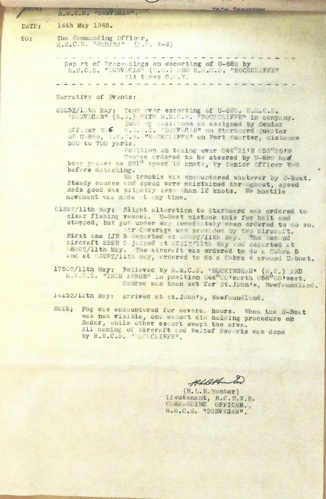 (U889-01) Report on the surrender of U-889 from Lt Robert Hunter, CO, HMCS DUNVEGAN to the CO, HMCS OSHAWA (U889-02) Report on the surrender of U-889 from LCdr James Pratt, CO, HMCS OSHAWA to Capt (D) Halifax - 14 May 1945 Researched by / Courtesy of Derek Waller, Air Commodore, RAF, ret'd. Source ref: LAC, RG 24, Vol. 11545