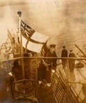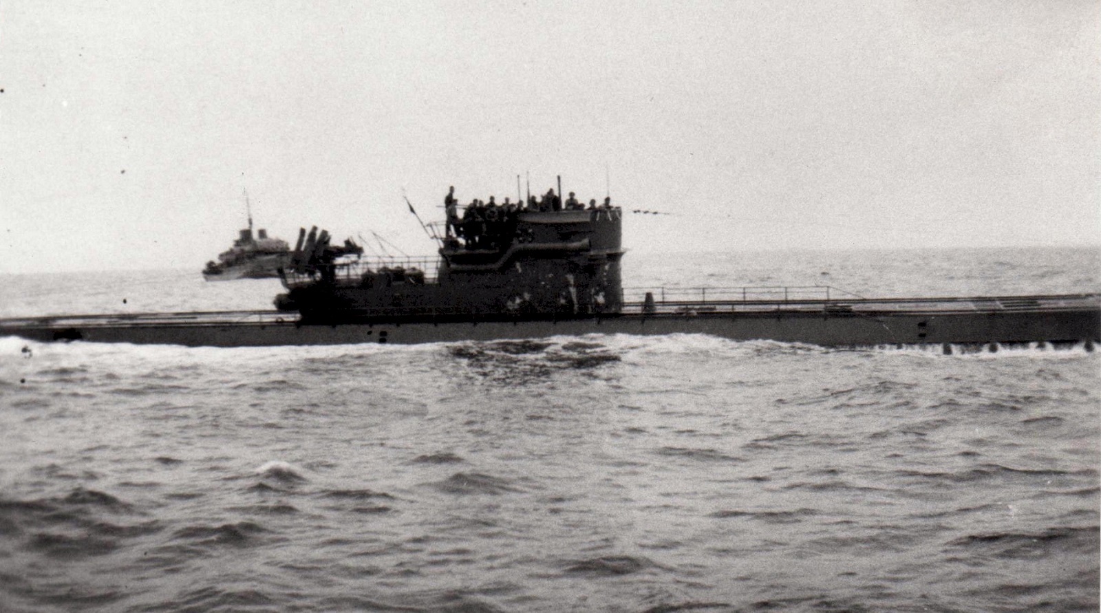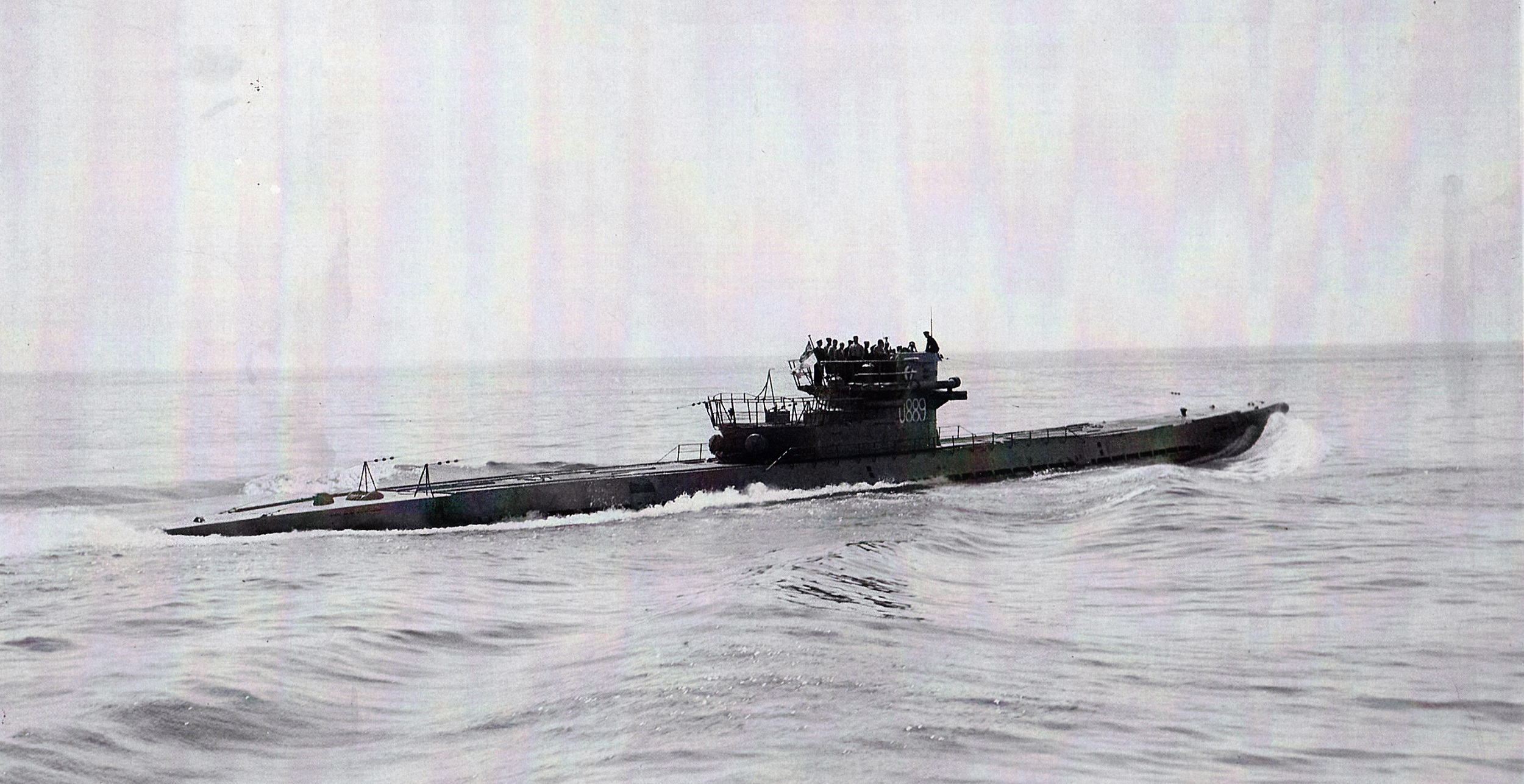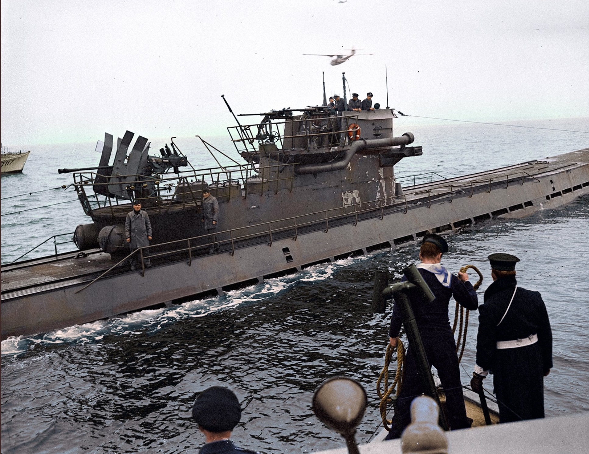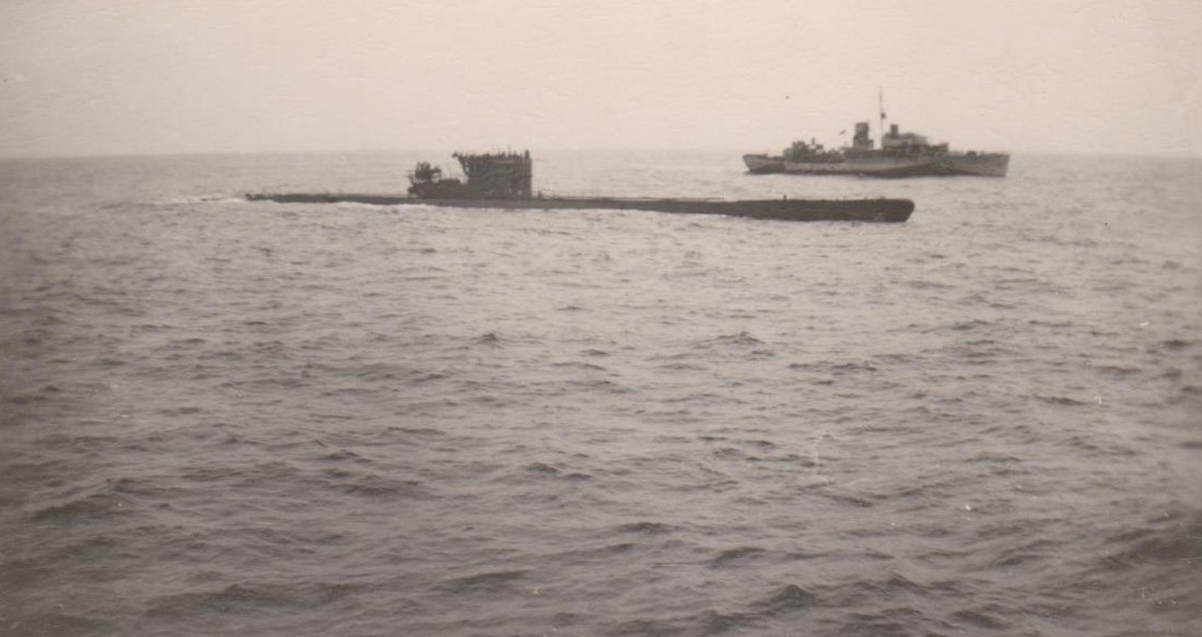 (U889-09) Surrender of the German submarine U-889 and hoisting of the British ensign 12 miles off Shelburne, NS, May 13, 1945. Photographed by the Royal Canadian Navy (MS-2-202 Box 23, Folder 12, photograph 1571). Source: Dalhousie Library (U889-10) Colourized photo of the surrender of the German submarine U-889 off Shelburne, Nova Scotia, May 13, 1945 (U889-11) Kapitänleutnant Friedrich Braeucker, C.O. of U-889 on the bridge at Shelburne, Nova Scotia, May 13, 1945. Source: Uboatarchive.net (U889-12) Surrender of U-889. Photo taken from HMCS OSHAWA J330 // From the collection of Robert Burns // Courtesy of Robert Burns (Jr) (U889-13) The surrender of U-889 - ML Q117 in the background. RCN photo. Neg # A-1416 // From the collection of H.W. Patterson // Courtesy of Steve Patterson
