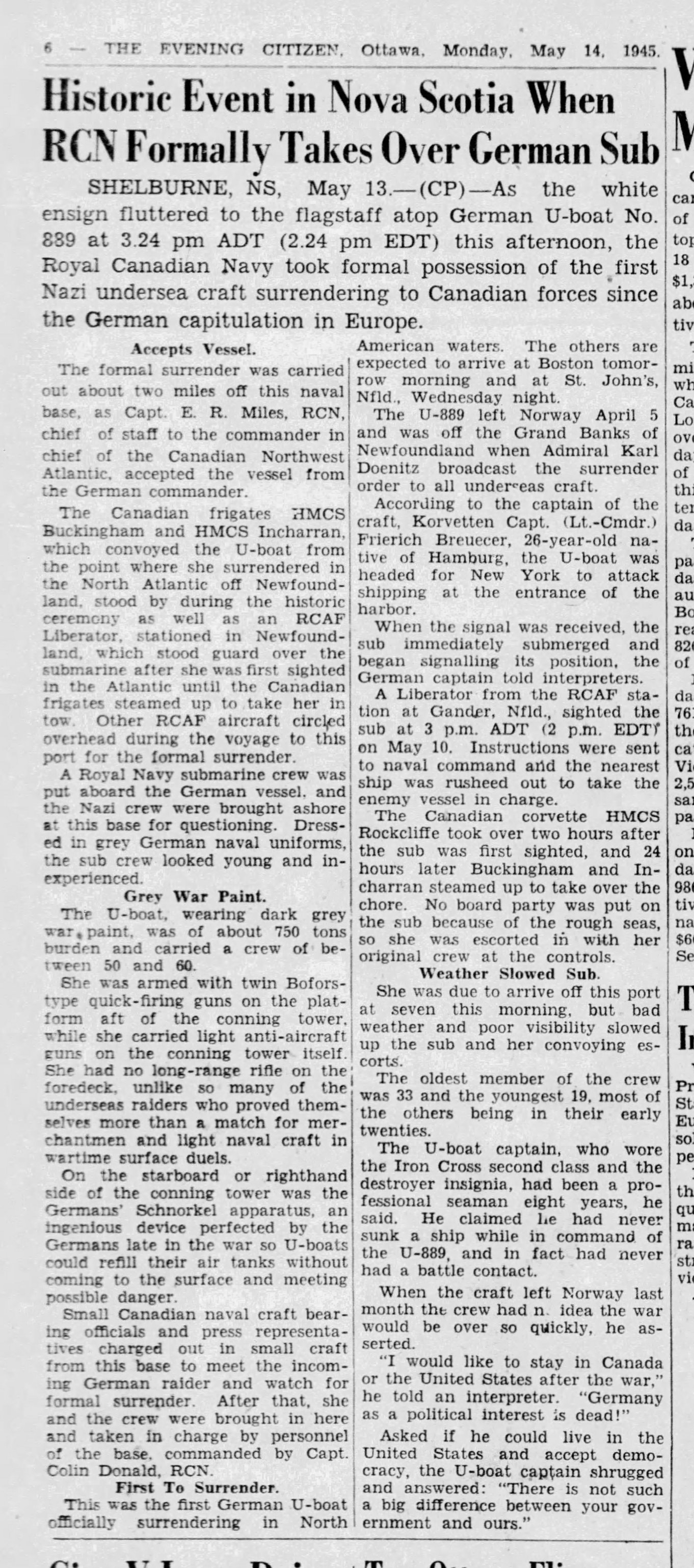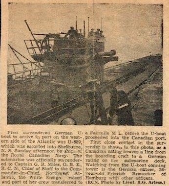 (U889-23) German U-boat U-889 surrendering off the coast of Nova Scotia // From the collection of William (Wink) Leworthy, RCAF (U889-24) German U-boat U-889 surrendering off the coast of Nova Scotia // From the collection of William (Wink) Leworthy, RCAF (U889-25) Surrendered U-889 being inspected by HC25 prior to being allowed to pass the anti-submarine boom at Shelburne, NS // William (Wink) Leworthy, RCAF (U889-26) Article on the surrender of U-889 at Shelburne, NS - The Evening Citizen, Ottawa, 14 May 1945