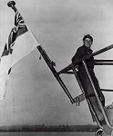 (U889-07) A Canadian sailor poses aboard U-889 with the Royal Canadian Navy's White Ensign. Although spotted by a Canadian aircraft and intercepted by Canadian ships on 10 May, poor weather delayed U-889's official surrender until the 13th, when the submarine arrived at Shelburne, Nova Scotia. As part of the surrender, Canadian sailors hoisted the White Ensign on the U-Boat's flagstaff. The sailor wears the insignia of the naval police, including a white cuff with "NP" and white gaiters covering his ankles. His holstered pistol is attached to a lanyard that passes around his neck. CWM 20070014-017