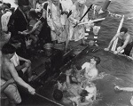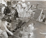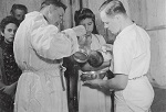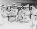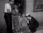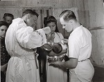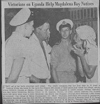 (LR25) Newspaper article on crew of UGANDA assisting locals in the village of Bahia, Magdelina Bay, Mexico, 1946 // Crew mentioned in article: Chaplain (R.C.) J.H. Laporte, RCN; Surgeon-Commander J. Blair MacLean, RCN; Capt. E.B. Hooks (Dentist), C.D.C.(N); Surgeon-Lt F.C. Johns, RCN; L/S.B.A. Frank Oliver, RCN (LR26) HMCS UGANDA'S padre performing Baptisms/Christenings at Bahia, Magdelina Bay, Mexico, 1946. He was the first priest to visit the village in 11 years (LR27) HMCS UGANDA'S ship's dentist examining the local villagers at Bahia, Magdelina Bay, Mexico, 1946 (LR28) Crossing the Line (Equator) on HMCS UGANDA during her trip from the Pacific to the Atlantic - 1946 (LR29) Crossing the Line (Equator) on HMCS UGANDA during her trip from the Pacific to the Atlantic - 1946