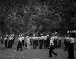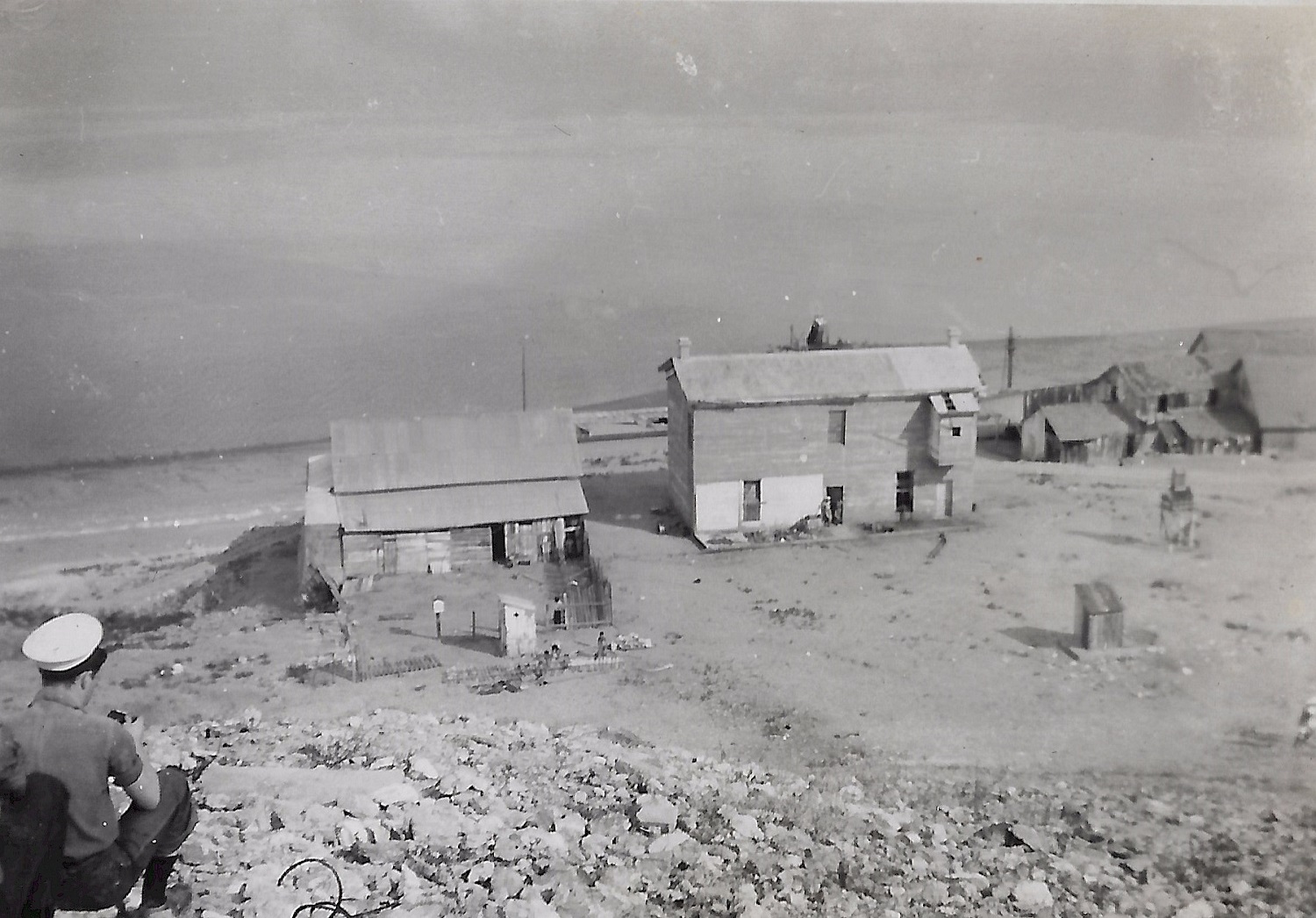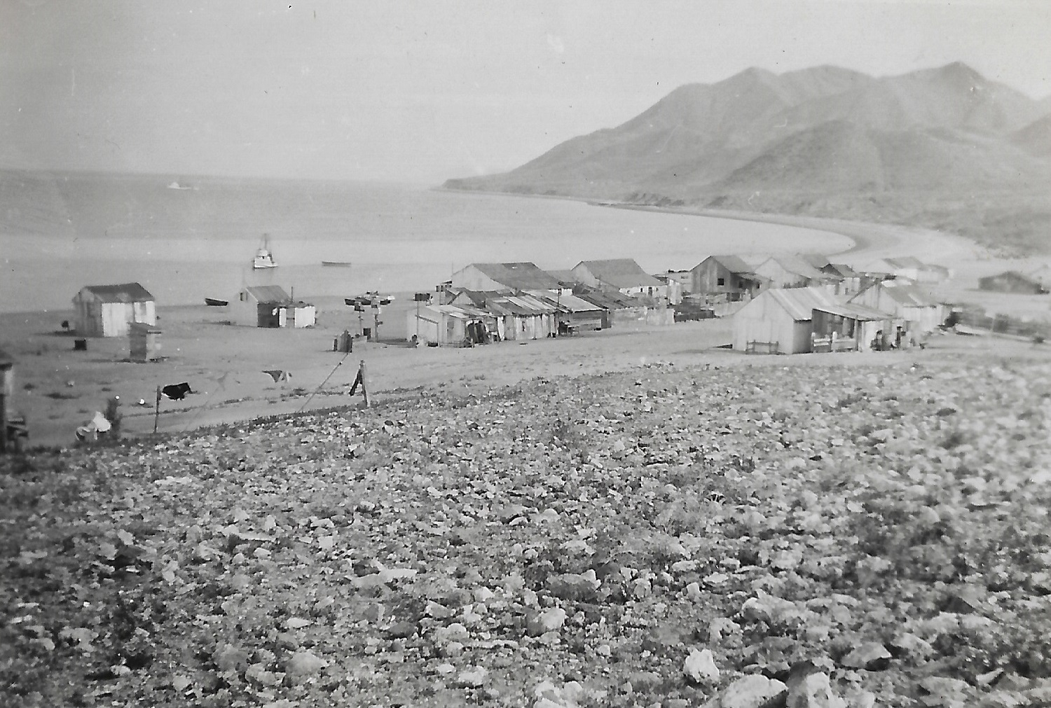 (JM100) HMCS UGANDA at anchor in Magdalena Bay, Mexico (JM101-JM102) Village of Bahia, Magdalena Bay. HMCS UGANDA can be seen anchored off shore (JM103-JM104) UGANDA sailor sitting on hill overlooking Bahia, Magdalena Bay, Mexico