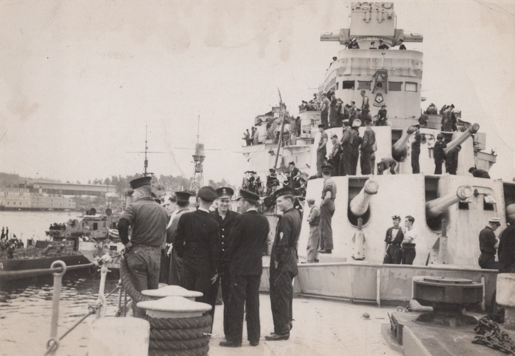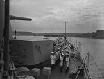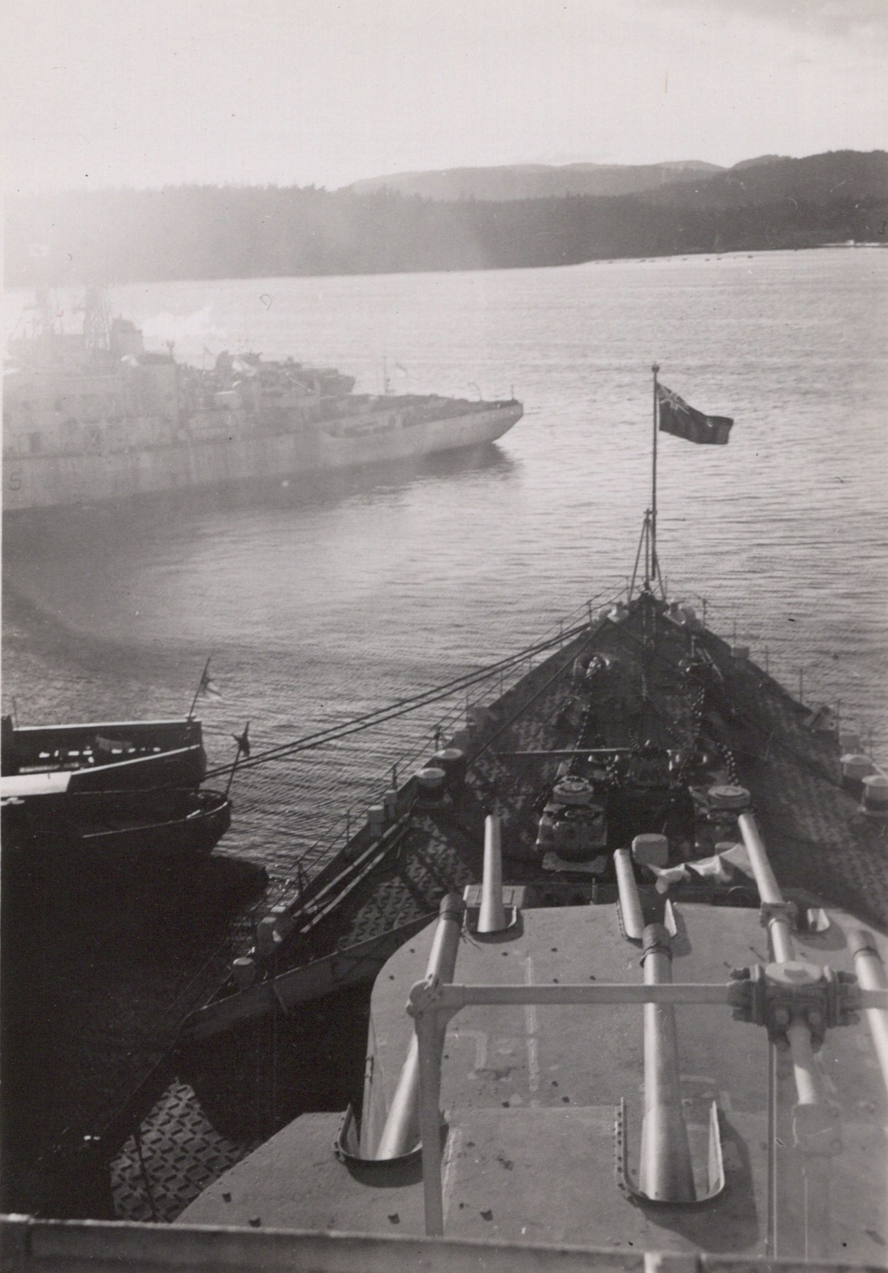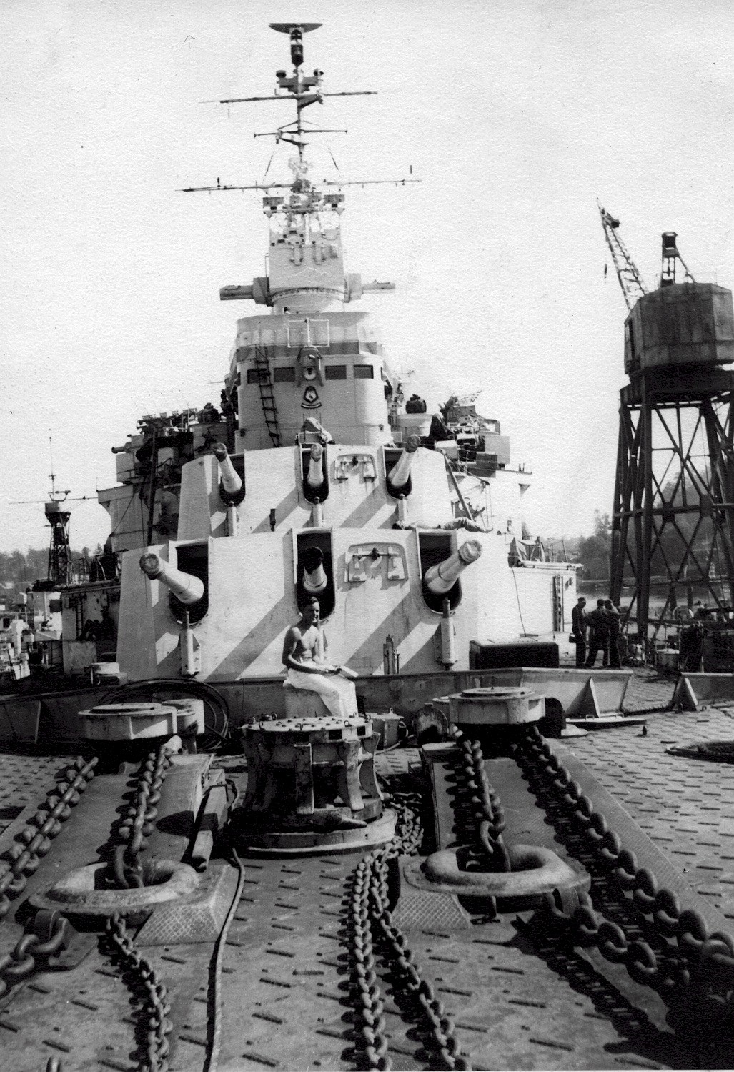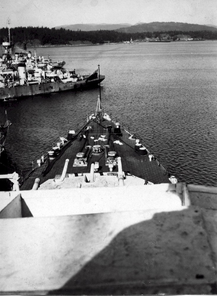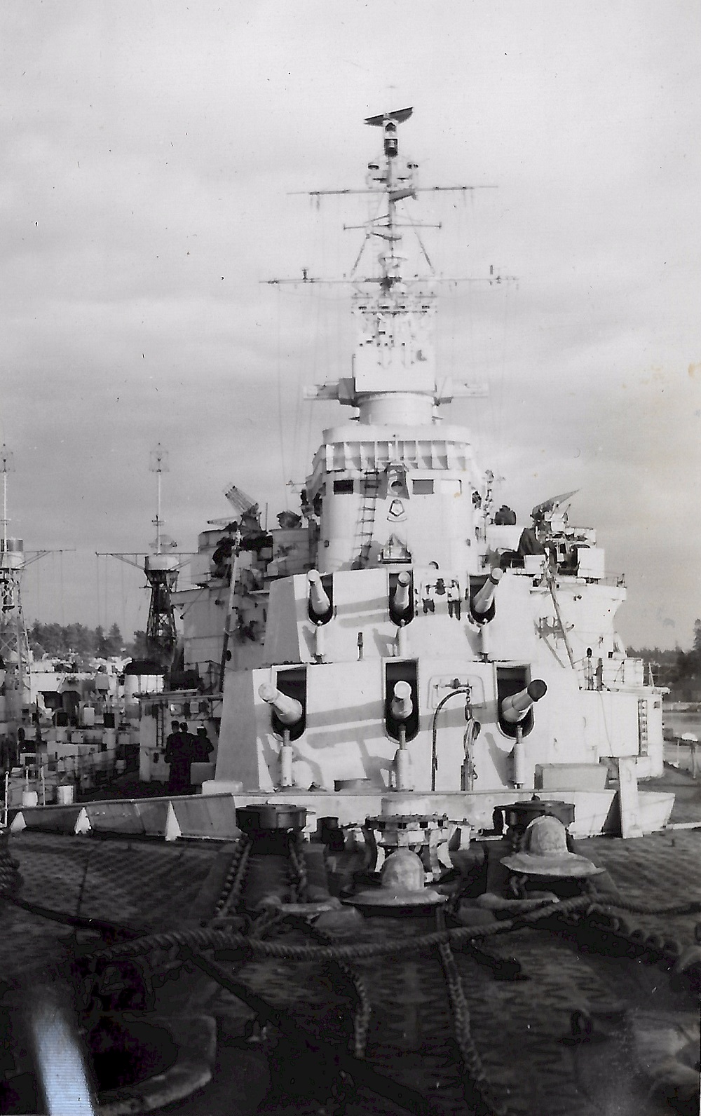 (AB21) HMCS UGANDA in Esquimalt. Crew milling about the upper decks. Castle Class HMCS LEASIDE K492 is alongside UGANDA with and 2nd vessel pendent number ending in a "4" out board of her (AB22) Unknown sailors in front of UGANDA'S "A" turret (AB23) Looking down from the bridge of HMCS UGANDA in Esquimalt. On the left hand side of the photo, the Castle Class Corvette HMCS COPPER CLIFF K495 is alongside other Castle Class Corvettes. The "5" in her pendent number visible From the collection of Sto 1c Art Bell, RCNVR Photos courtesy of Art's son Andrew, daughter-in-law Rita Giulietti and daughter Janet Bell Crawford