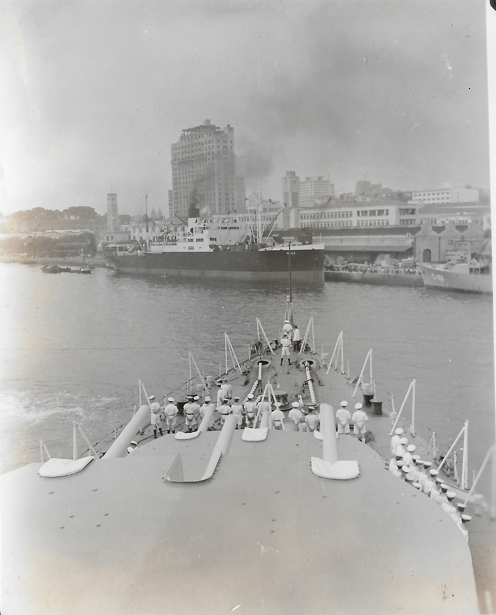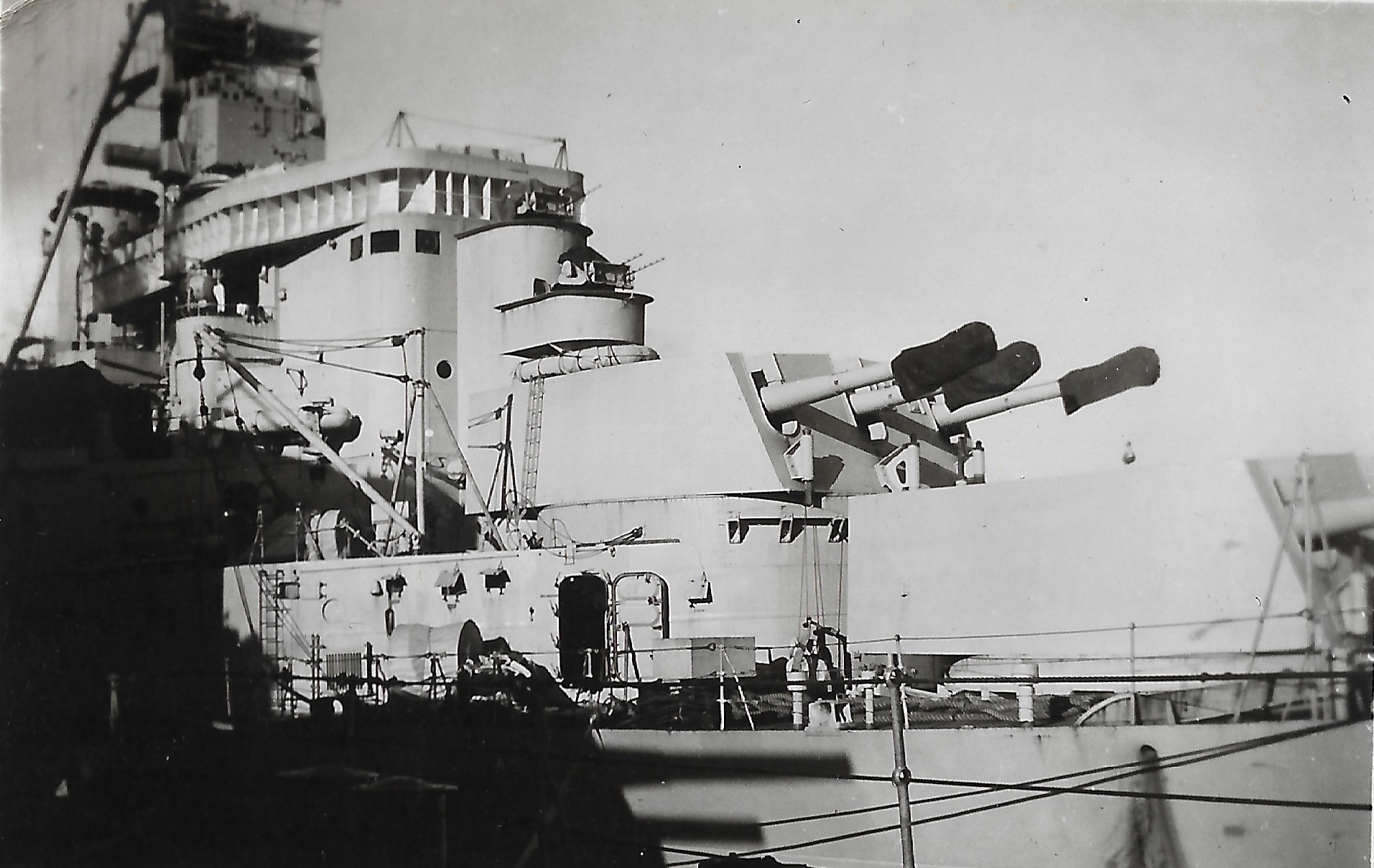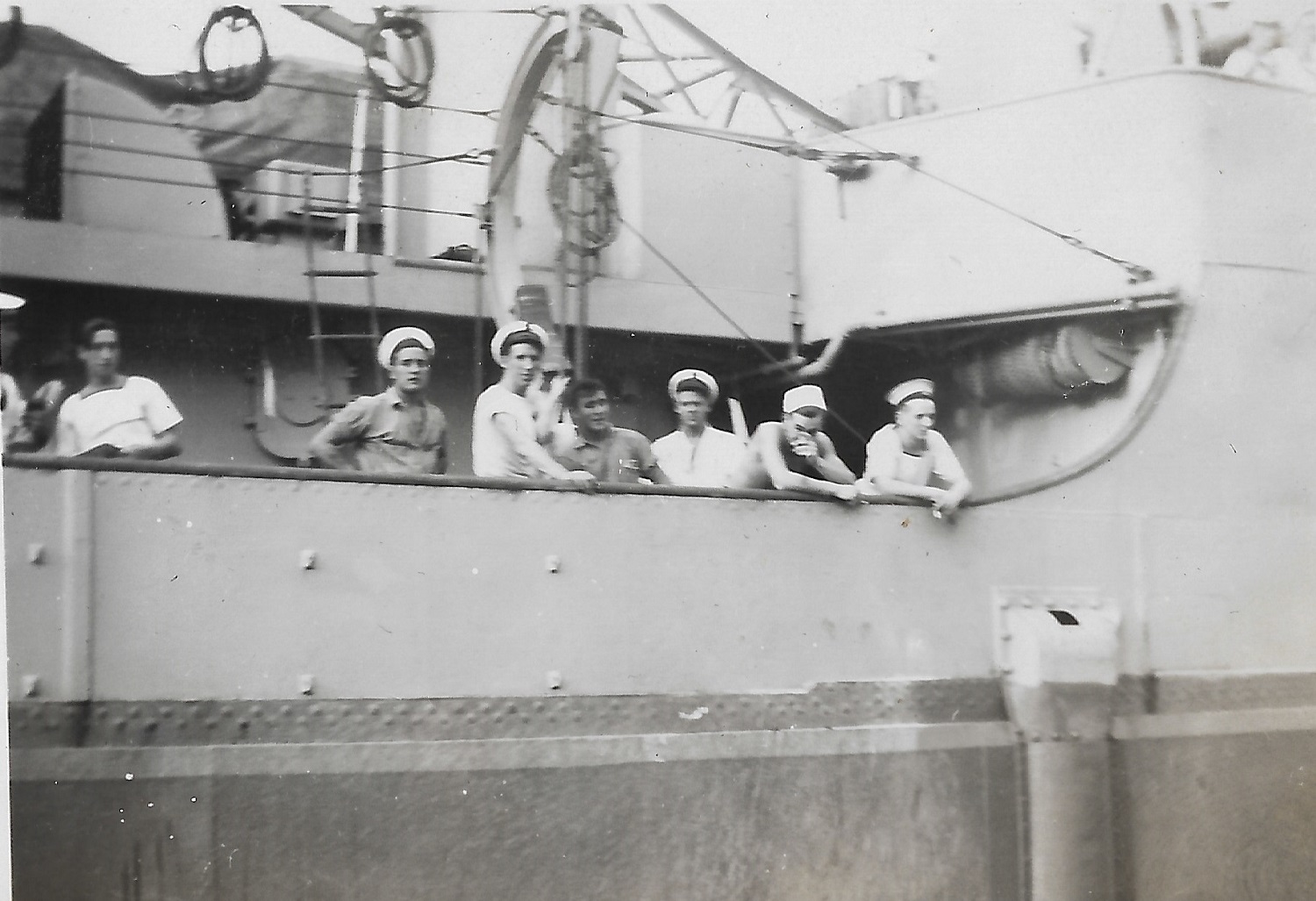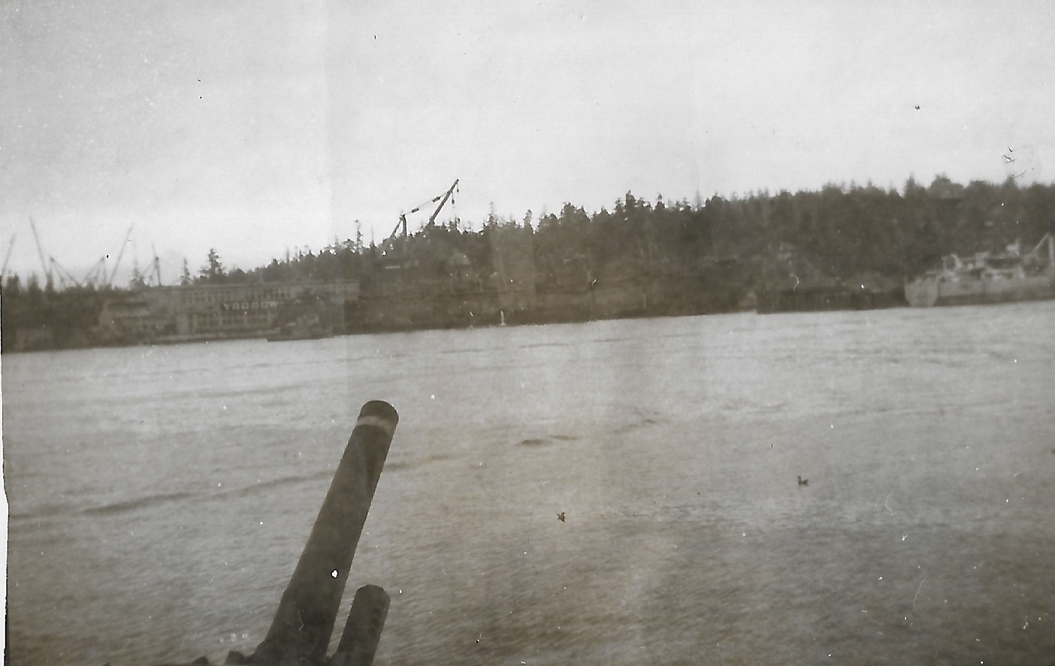 (AB21) HMCS UGANDA in Esquimalt. Crew milling about the upper decks. Castle Class HMCS LEASIDE K492 is alongside UGANDA with and 2nd vessel pendent number ending in a "4" out board of her (AB22) Unknown sailors in front of UGANDA'S "A" turret (AB23) Looking down from the bridge of HMCS UGANDA in Esquimalt. On the left hand side of the photo, the Castle Class Corvette HMCS COPPER CLIFF K495 is alongside other Castle Class Corvettes. The "5" in her pendent number visible From the collection of Sto 1c Art Bell, RCNVR Photos courtesy of Art's son Andrew, daughter-in-law Rita Giulietti and daughter Janet Bell Crawford