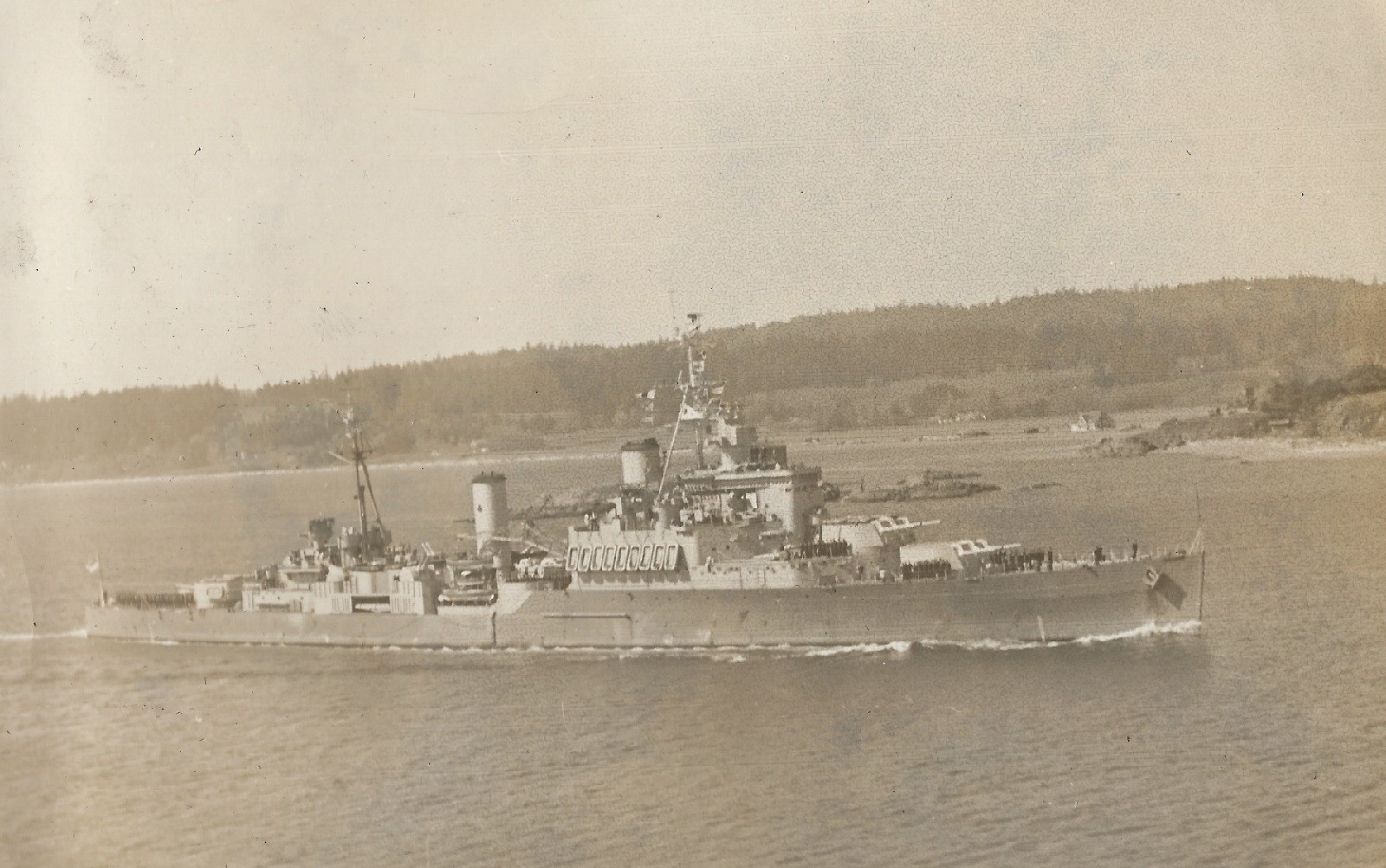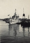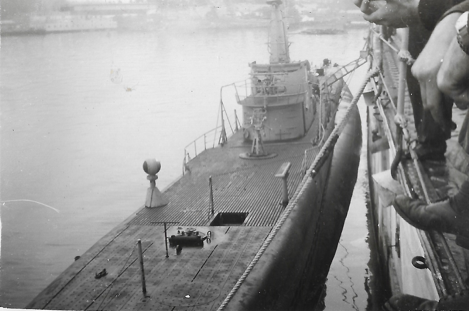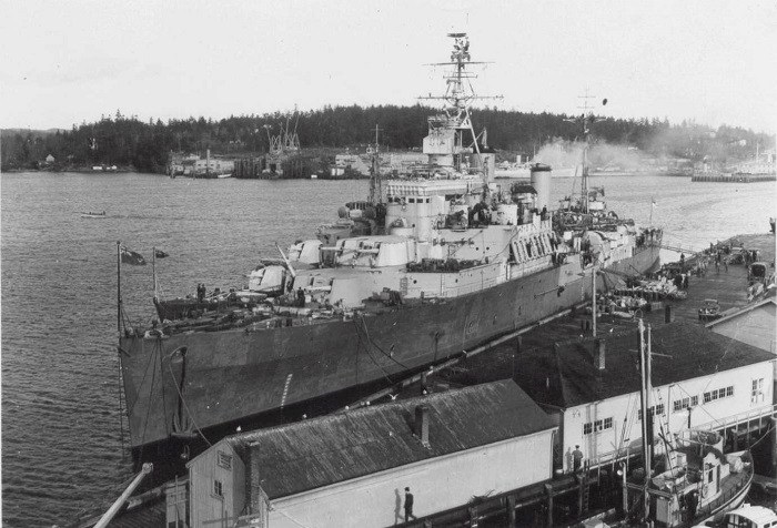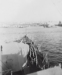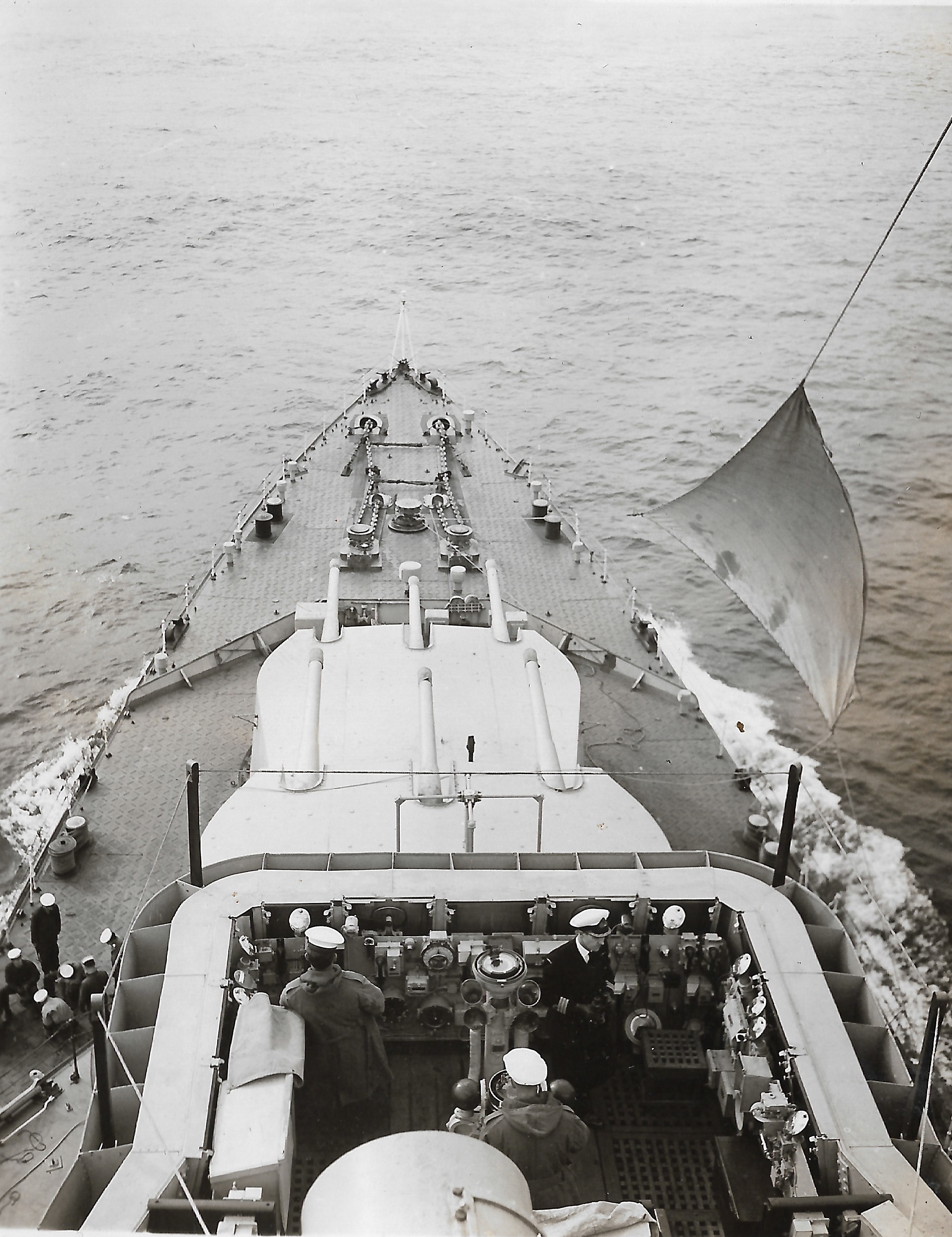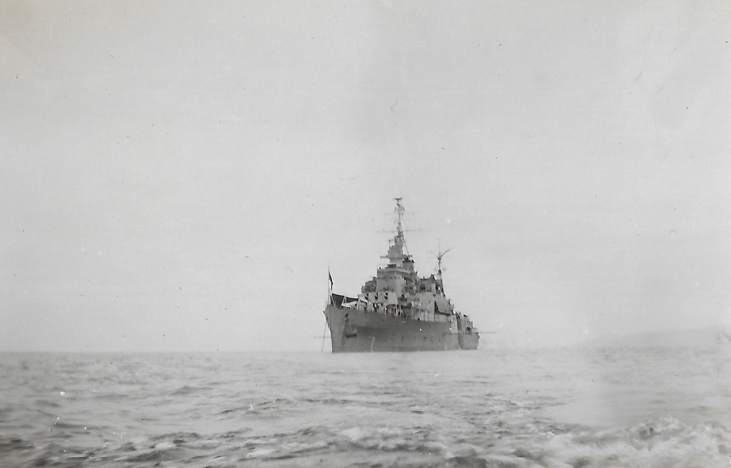 (AB21) HMCS UGANDA in Esquimalt. Crew milling about the upper decks. Castle Class HMCS LEASIDE K492 is alongside UGANDA with and 2nd vessel pendent number ending in a "4" out board of her (AB22) Unknown sailors in front of UGANDA'S "A" turret (AB23) Looking down from the bridge of HMCS UGANDA in Esquimalt. On the left hand side of the photo, the Castle Class Corvette HMCS COPPER CLIFF K495 is alongside other Castle Class Corvettes. The "5" in her pendent number visible From the collection of Sto 1c Art Bell, RCNVR Photos courtesy of Art's son Andrew, daughter-in-law Rita Giulietti and daughter Janet Bell Crawford