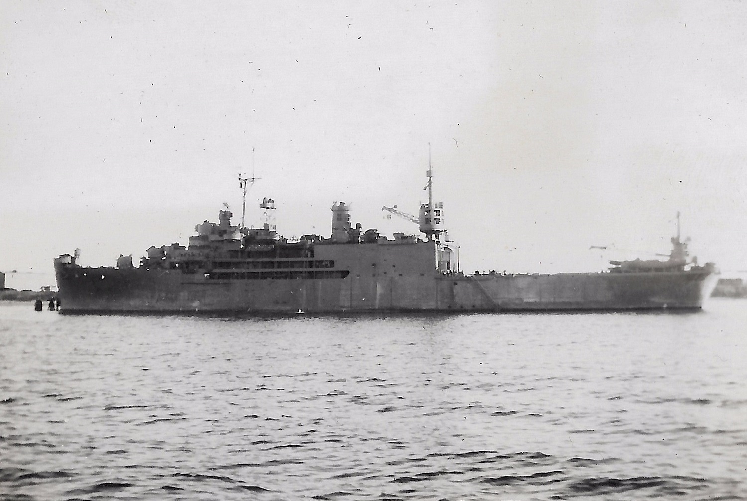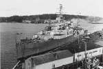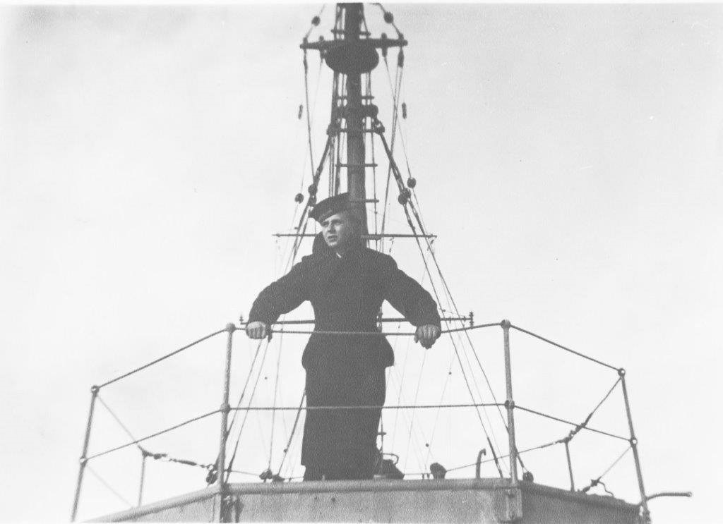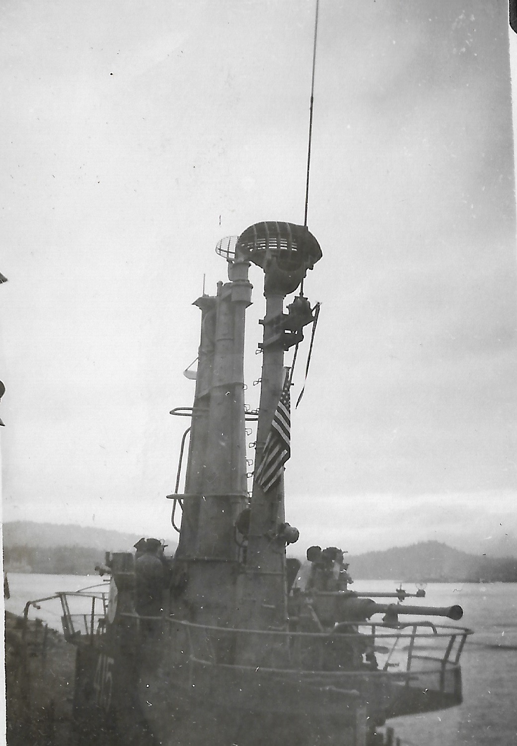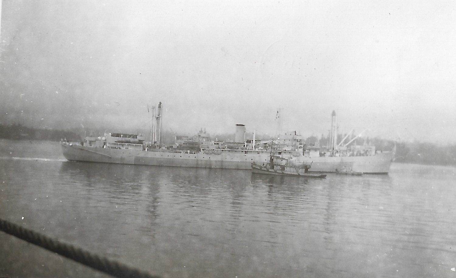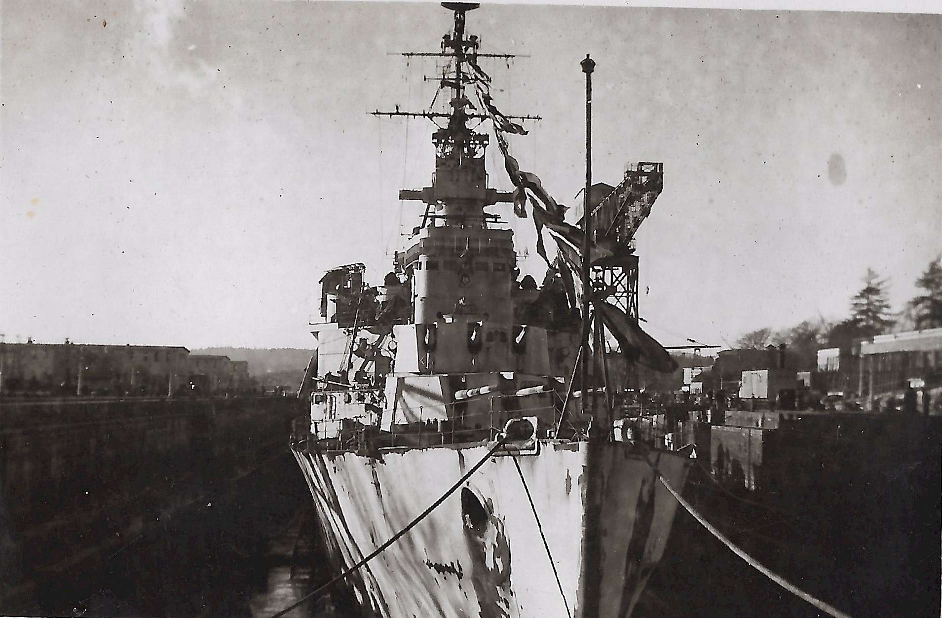 (AB21) HMCS UGANDA in Esquimalt. Crew milling about the upper decks. Castle Class HMCS LEASIDE K492 is alongside UGANDA with and 2nd vessel pendent number ending in a "4" out board of her (AB22) Unknown sailors in front of UGANDA'S "A" turret (AB23) Looking down from the bridge of HMCS UGANDA in Esquimalt. On the left hand side of the photo, the Castle Class Corvette HMCS COPPER CLIFF K495 is alongside other Castle Class Corvettes. The "5" in her pendent number visible From the collection of Sto 1c Art Bell, RCNVR Photos courtesy of Art's son Andrew, daughter-in-law Rita Giulietti and daughter Janet Bell Crawford