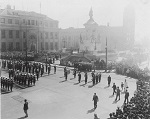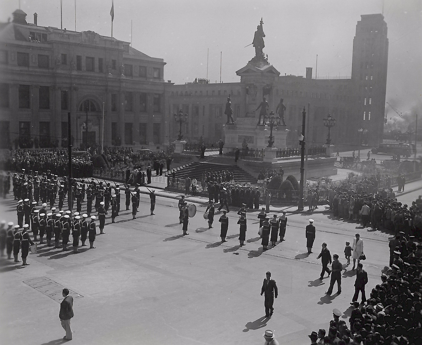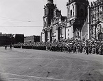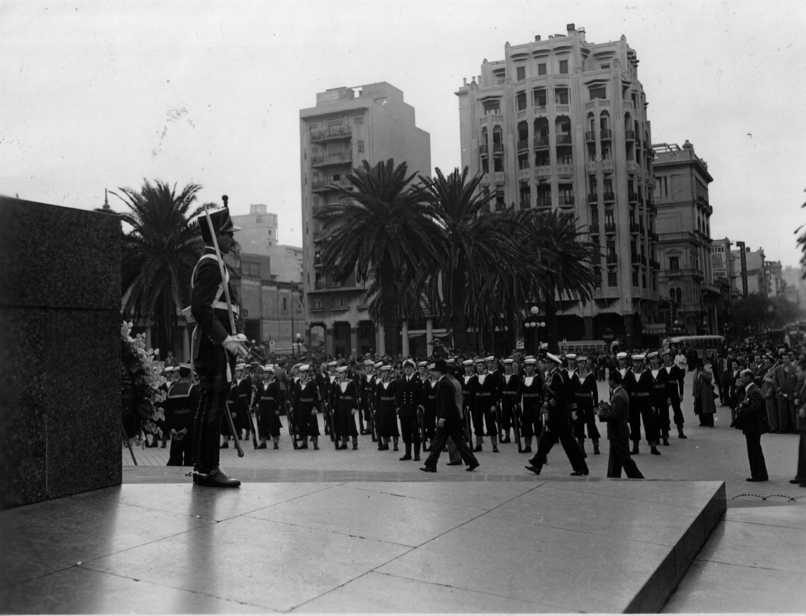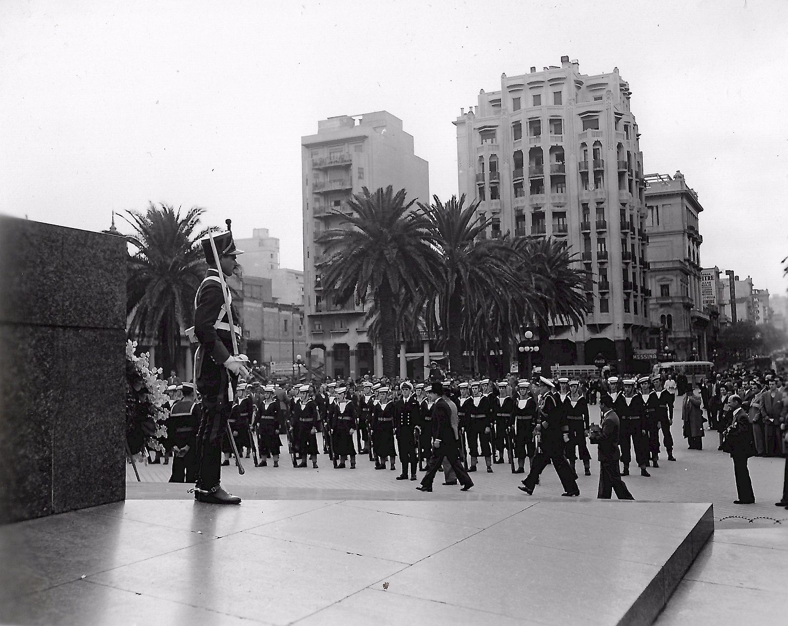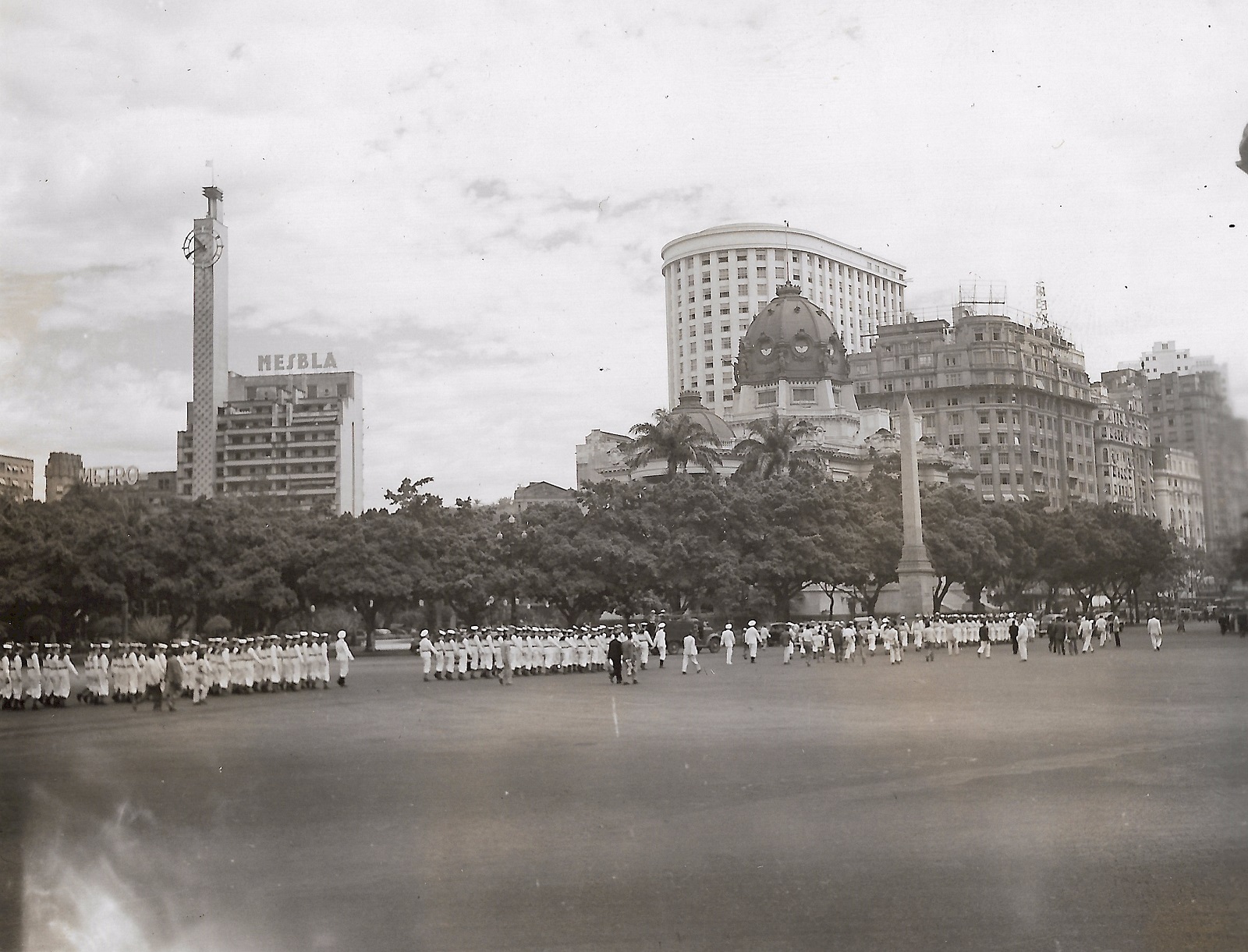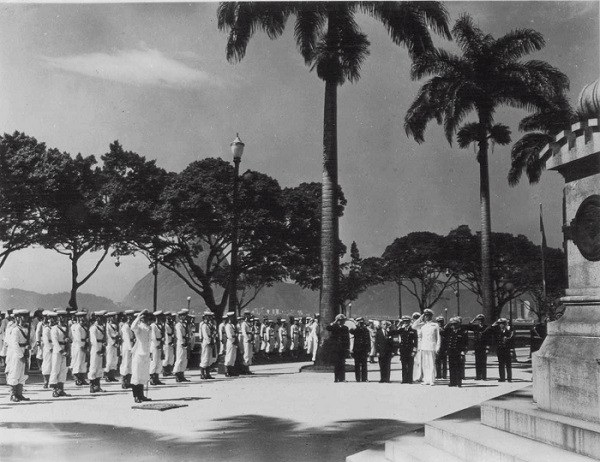 (JM164) Brazilian army in traditional uniform formed up on parade (JM165) HMCS UGANDA sailors on parade - RCN neg # G773 (JM166) Monument and Mausoleum of the Heroes of the Battle of Laguna, Rio de Janeiro, Brazil (JM167) Sailors on HMCS UGANDA while alongside in Rio (JM168) Believed to be the funeral for L/Stwd George Stuart who died on ship of an accidental electrocution during UGANDA'S port visit to Rio