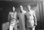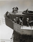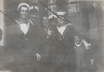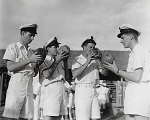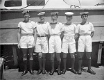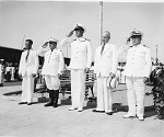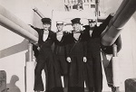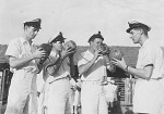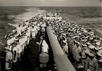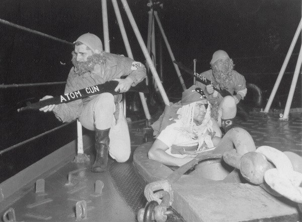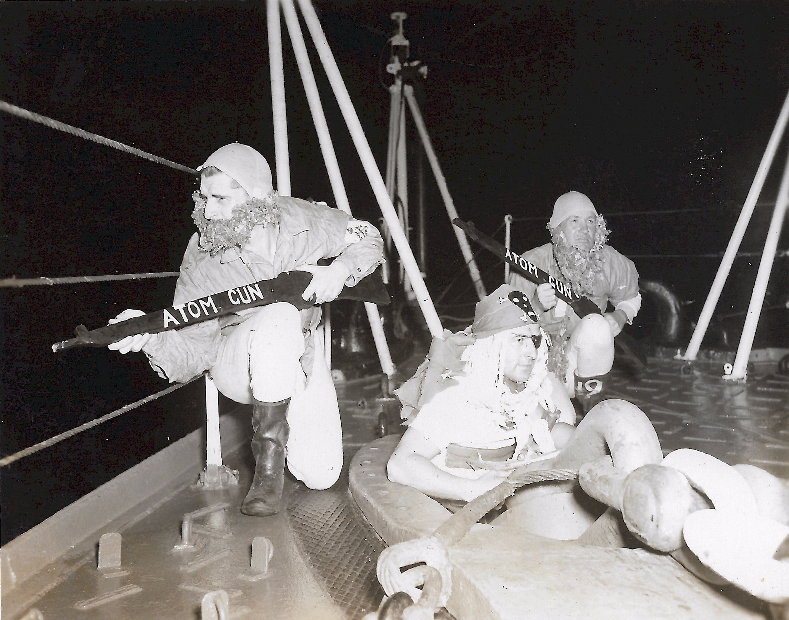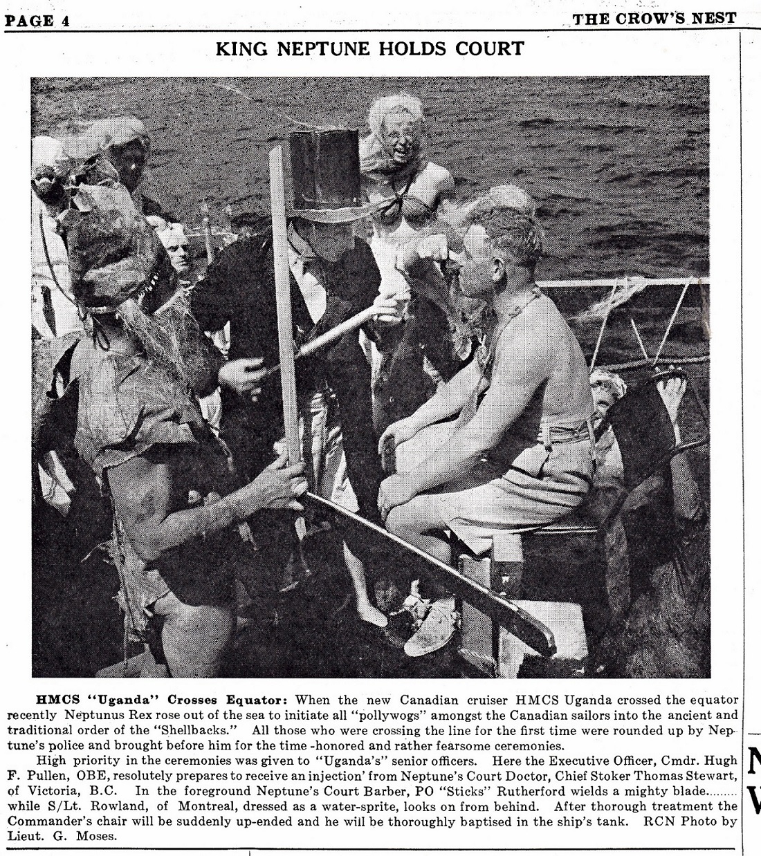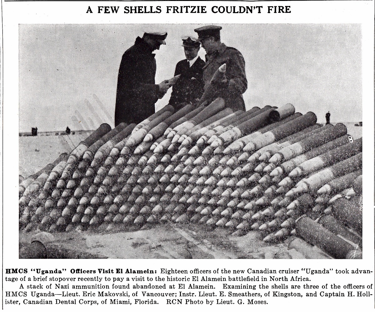 (UGA005) The gundeck of HMCS UGANDA after shelling Miyakojima in May, 1945. The ship in the distance is HMNZS GAMBIA. Courtesy of the CFB Esquimalt Naval and Military Museum: Image # VR2014.1.1 (UGA006) Officers from HMCS UGANDA visit El Alamein. In photo - Lt Eric Makovski, Instr Lt E. Smeathers and Capt H. Hollister. Crow's Nest newspaper - May 1945 (UGA007) Crossing the Equator on HMCS UGANDA. Crow's Nest newspaper - May 1945