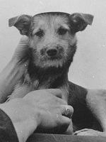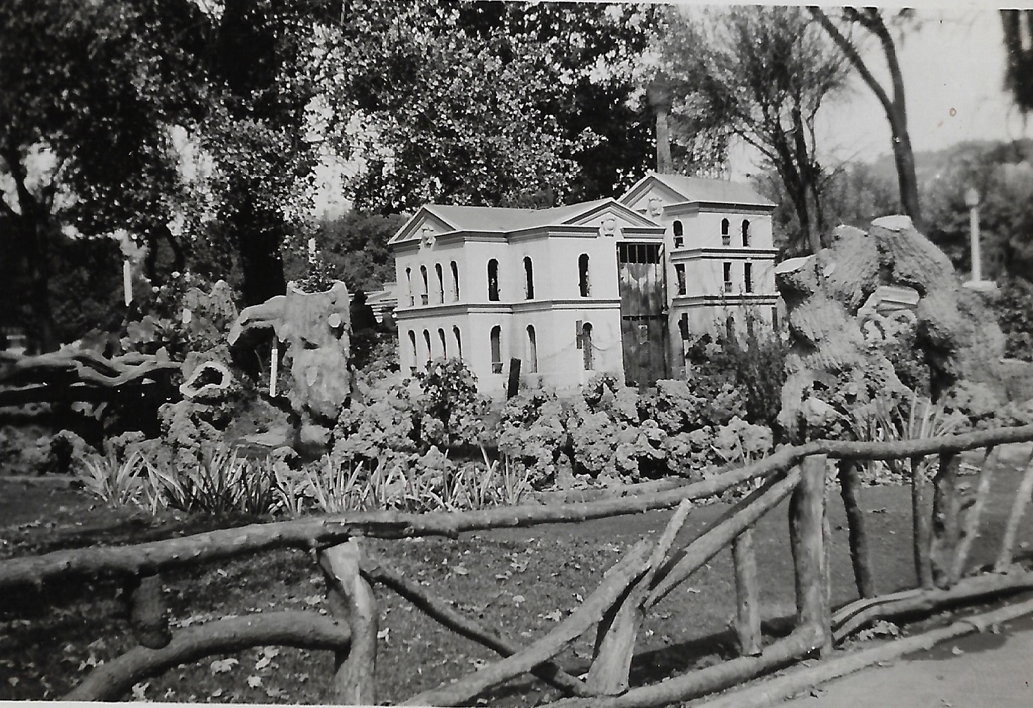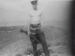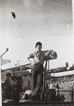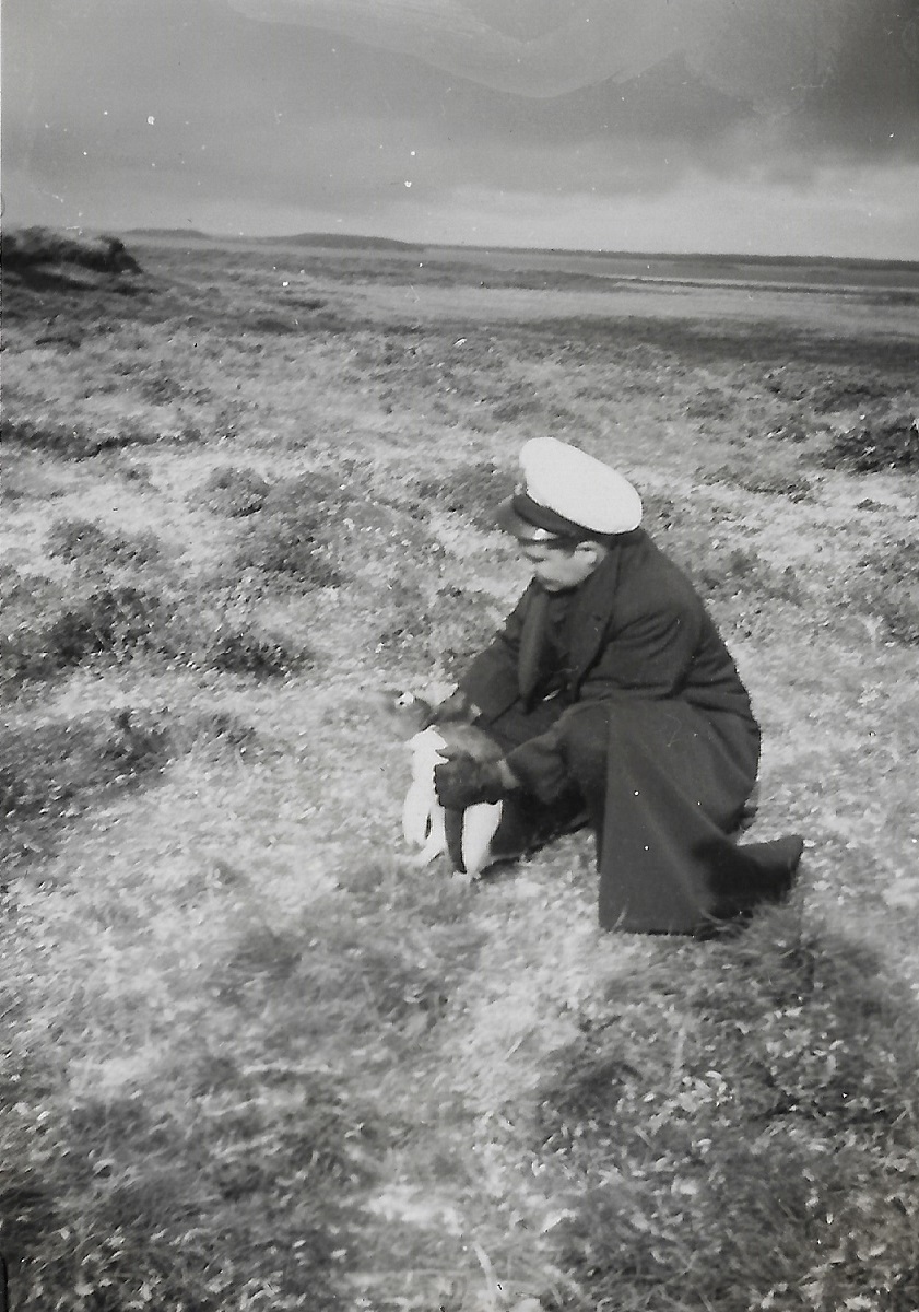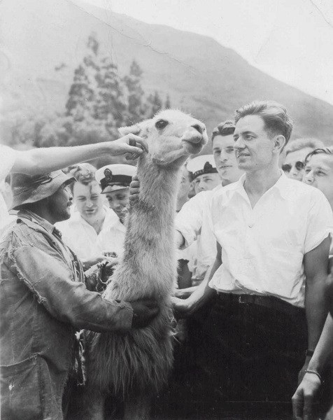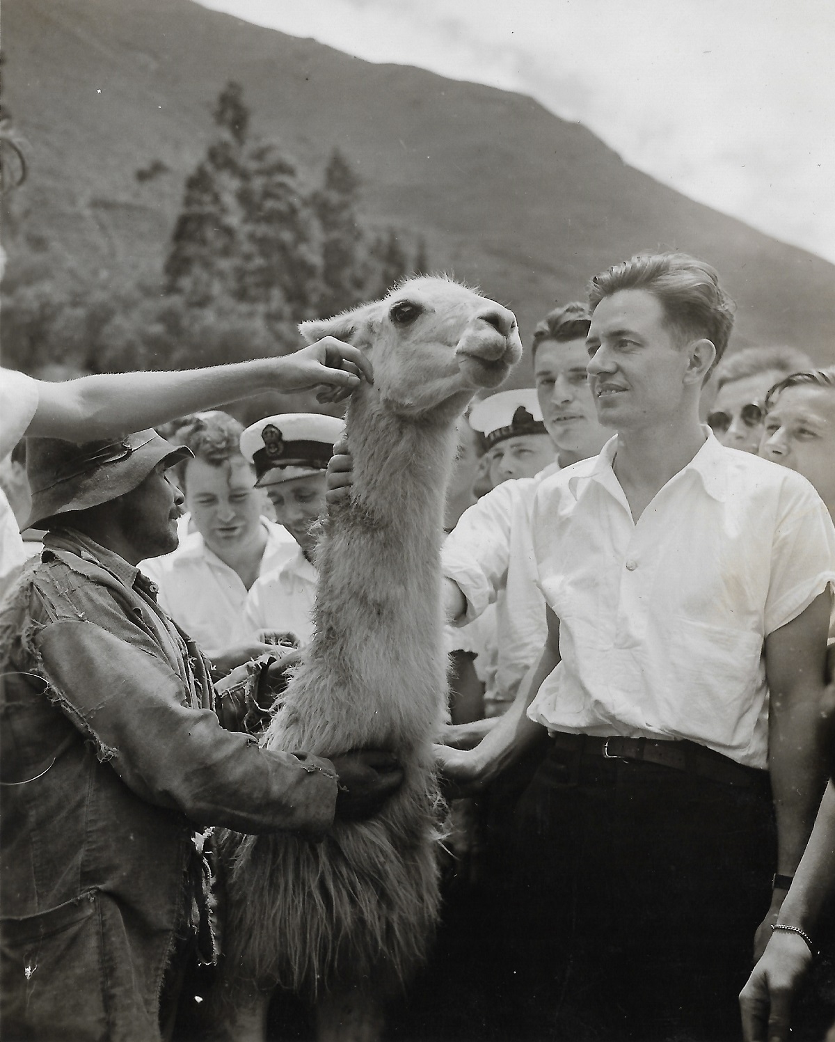(LR30) King Neptune's Men - Crossing the Line (Equator) on HMCS UGANDA during her trip from the Pacific to the Atlantic - 1946 (LR31) HMCS UGANDA at anchor of Peru - 1946 (LR32) PO Larry Restall standing by a train in Perua steam locomotive in Peru. The train ran up the mountains using a series of switchbacks. At the end of the day they still had not got to the top, so they returned to their starting point. PO Restall had hoped to get up to Machu Pichu. (LR33) Petting a Llama, Peru, 1946