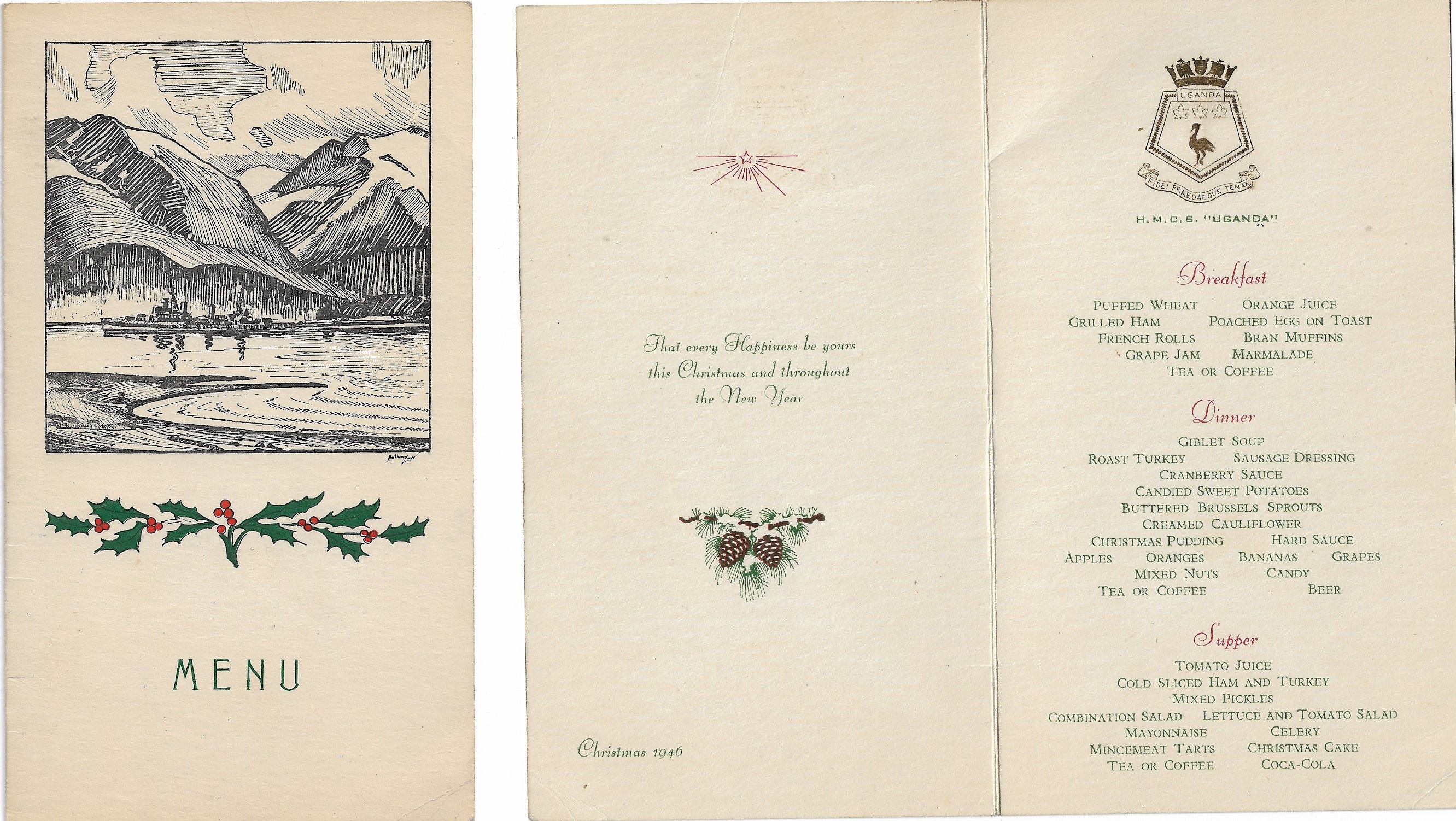 (JM69) HMCS UGANDA ship's company photo - undated (JM70) HMCS UGANDA'S Executive Branch - undated (JM71) HMCS UGANDA Christmas Menu - 1946