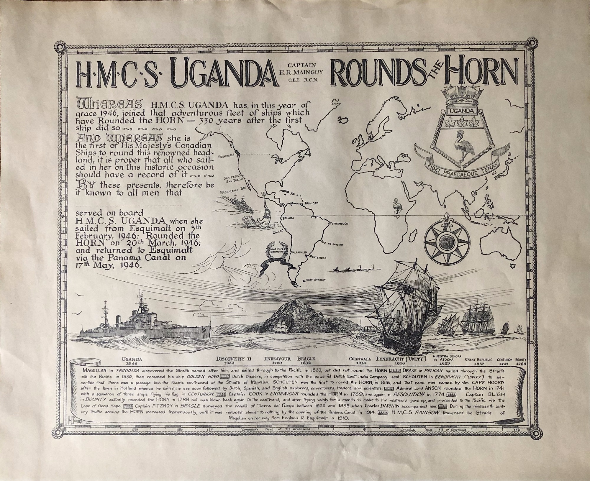(JM125-JM126) HMCS UGANDA Rounding the Horn "under sail". UGANDA was the first ship of the RCN to Round the Horn (JM127) HMCS UGANDA Rounding the Horn Certificate - 20 Mar 1946