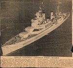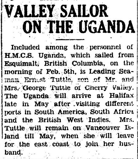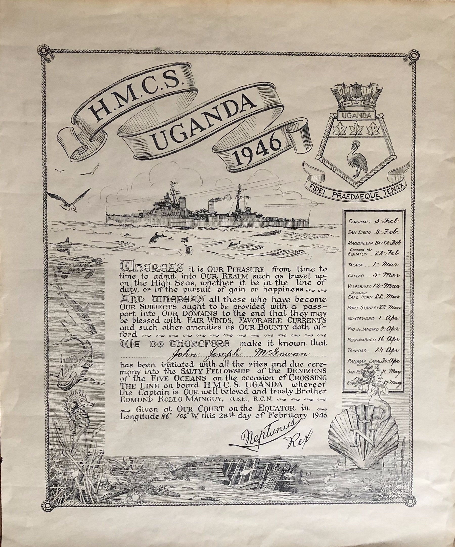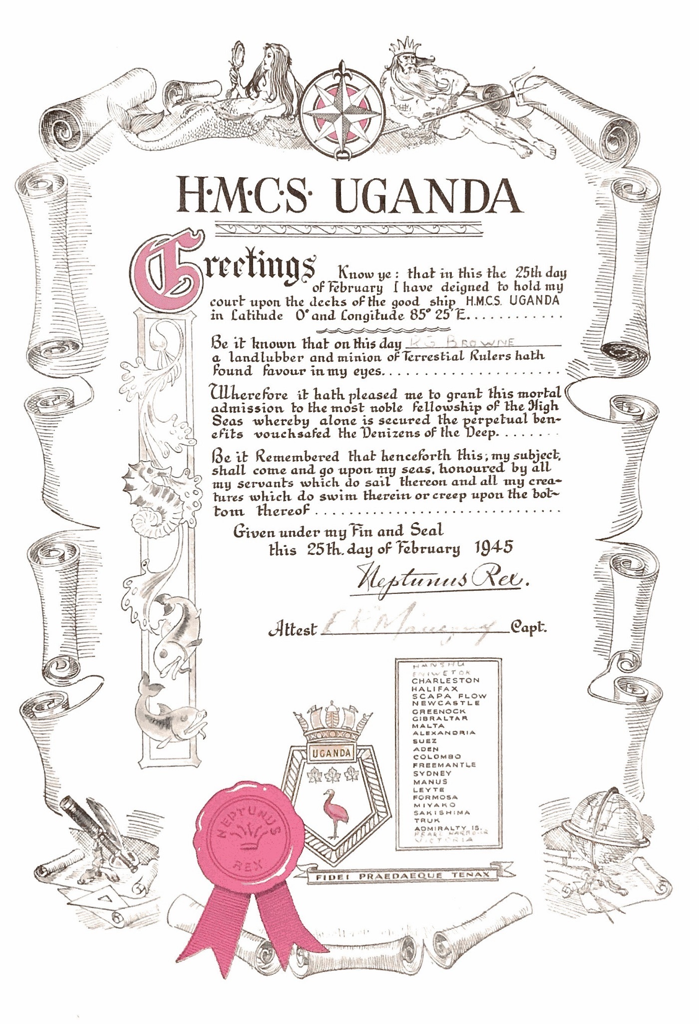 (UGA001) HMCS UGANDA. Courtesy of Gordon Howard (UGA002-UGA003) Newspaper articles on the transfer HMCS UGANDA to the RCN from the RN. From the collection of John Acorn. Courtesy of Barry Acorn (UGA004) Robert Gordon Browne's Crossing the Line (Equator) Certificate on HMCS UGANDA 25 Feb 1945. From the collection of Robert Browne. Courtesy of Daniel Browne