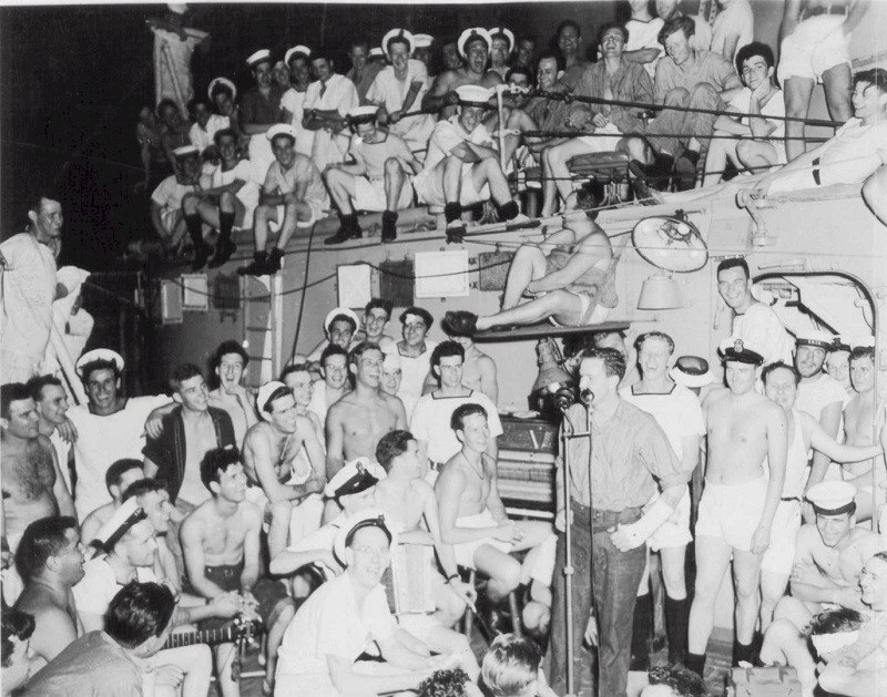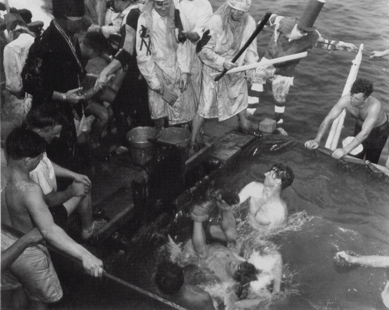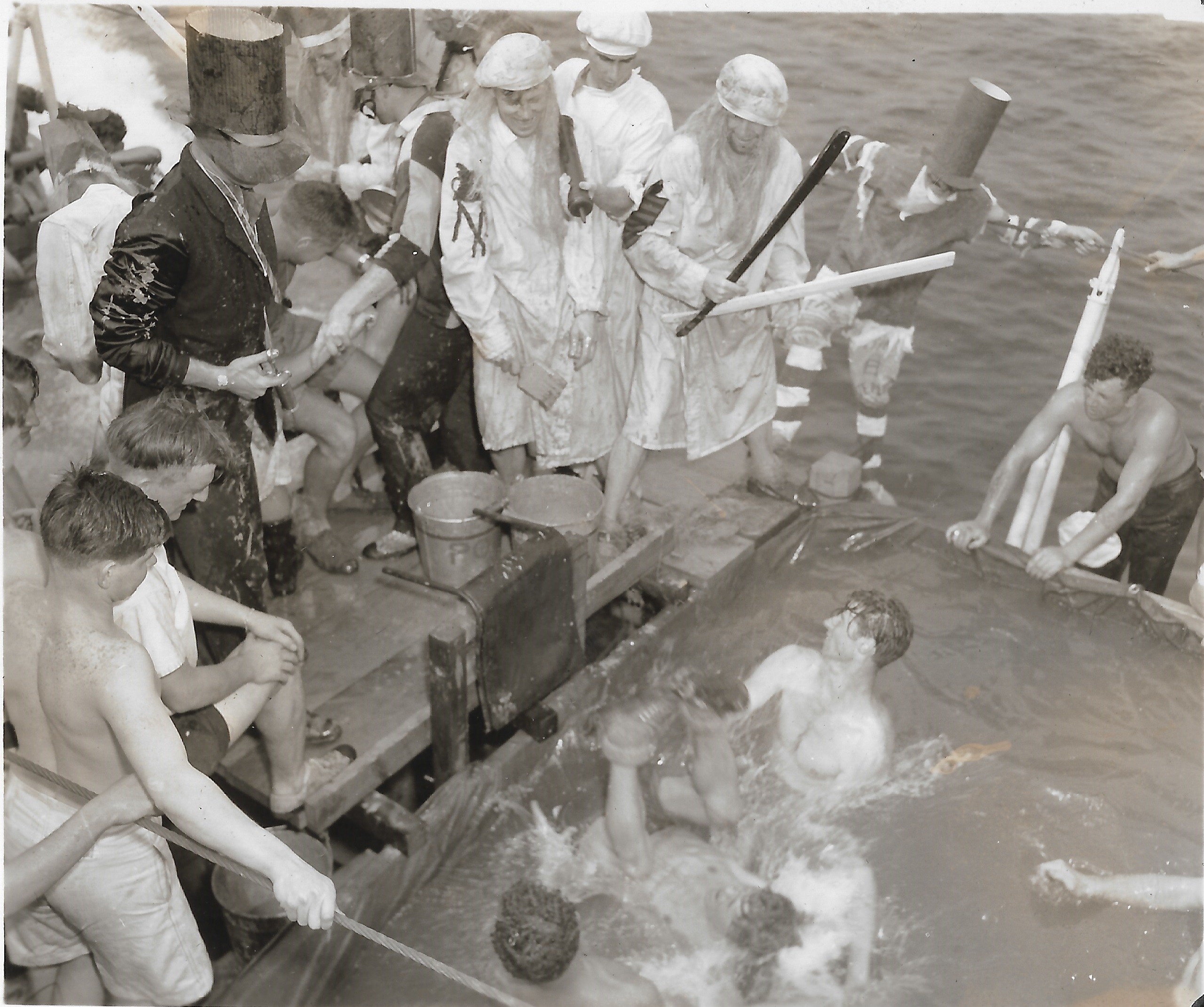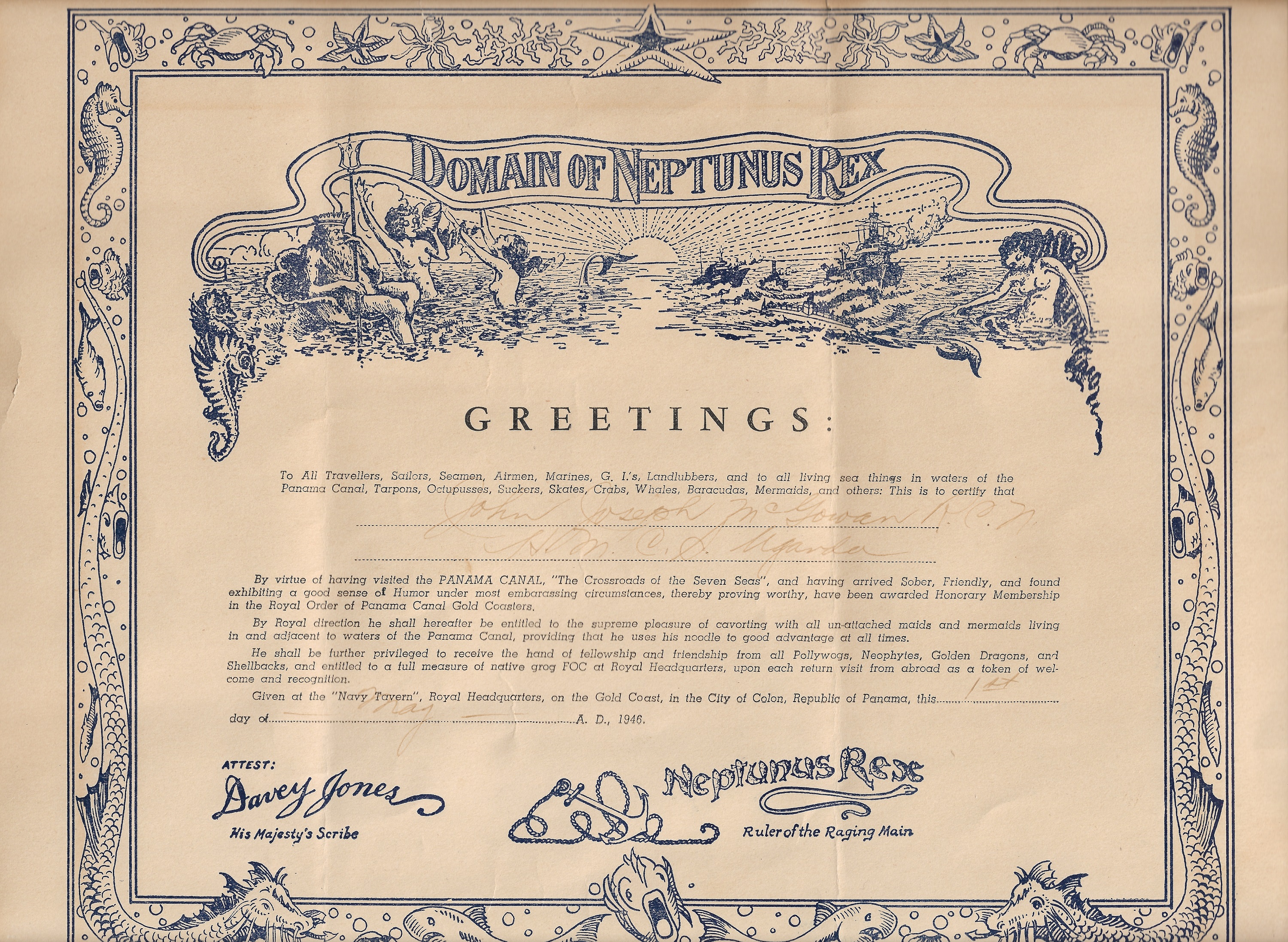 (JM110) The night before the Crossing the Line ceremony on HMCS UGANDA (.JM111) Crossing the Line ceremony on HMCS UGANDA enroute to Peru from Magdalena Bay, Mexico (JM112) HMCS UGANDA Crossing the Line (Equator) Certificate - 28 Feb 1946. Certificate includes a list of port visits for the 1946 South American Cruise