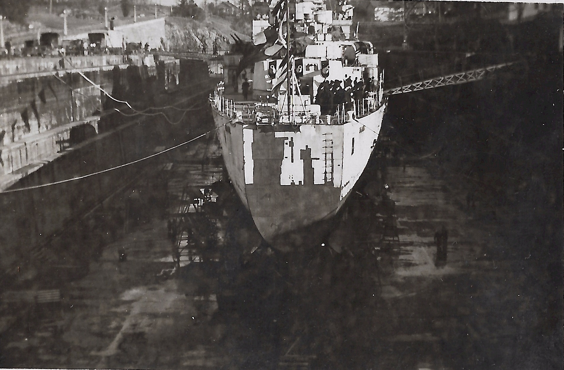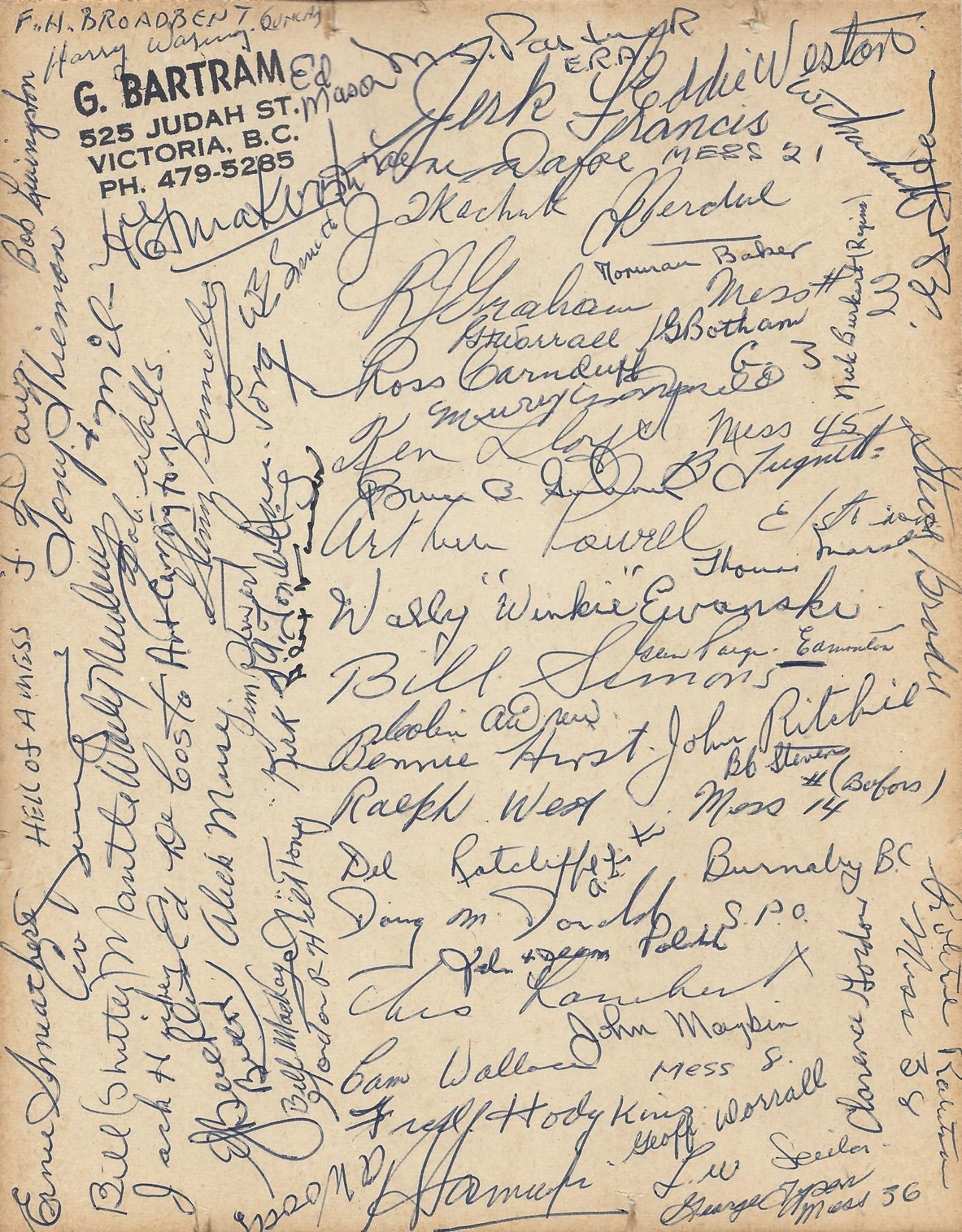 (UGA030) Valley Sailor on the UGANDA. The Picton Gazette 13 Feb 1946. Source: Prince Edward County Archives Microfilm collection. Researched and complied by: © John Lyons 2016 (UGA031) HMCS UGANDA in San Francisco - date unknown (UGA032-UGA033) HMCS UGANDA in the government dry dock in Esquimalt, BC - 1948. From the collection of Tom Smith, C2ET, RCN (UGA034) Signatures of UGANDA crew members. From the collection of Dale Pollard