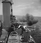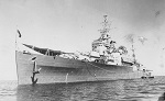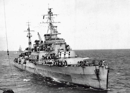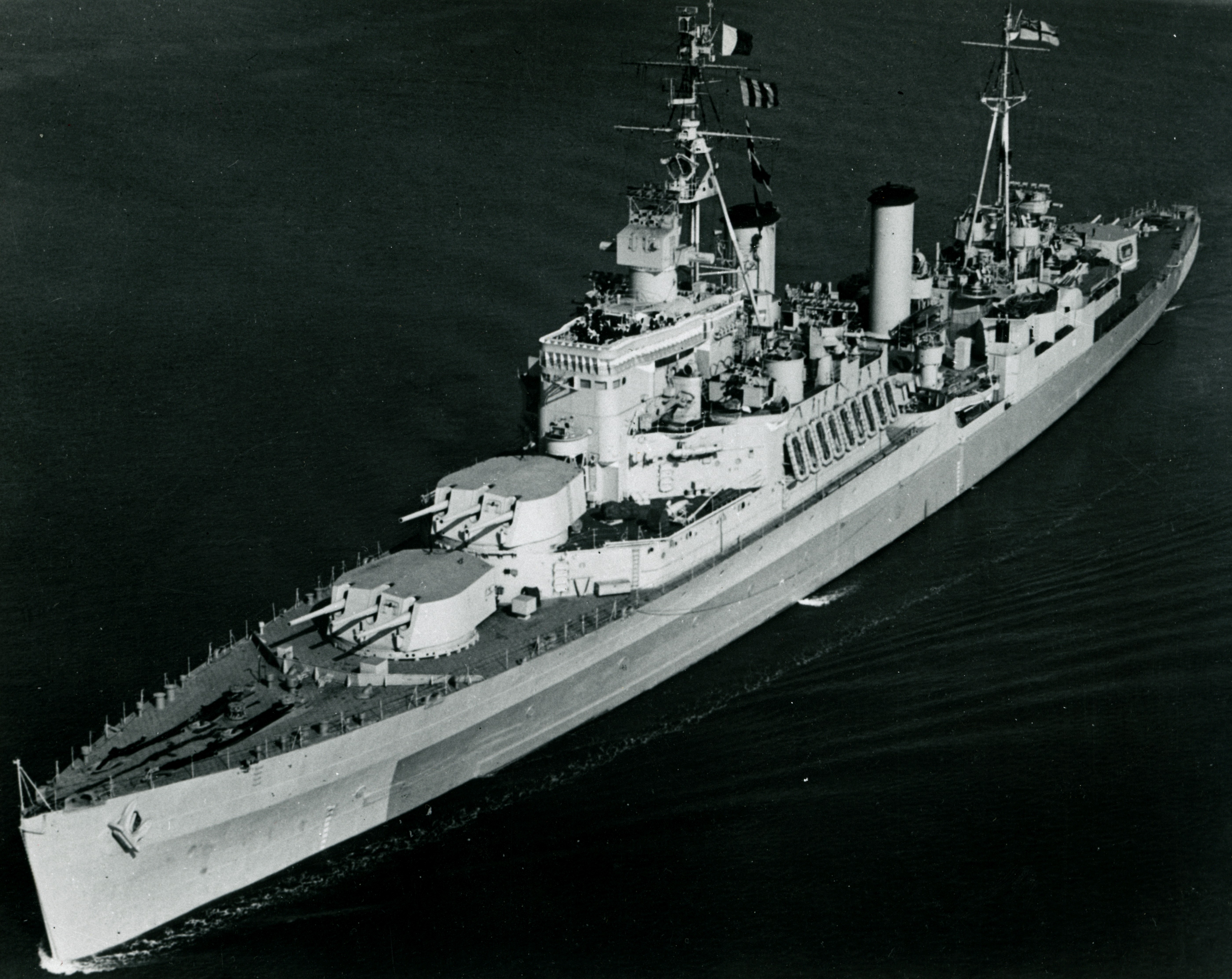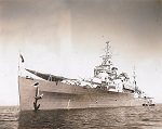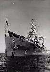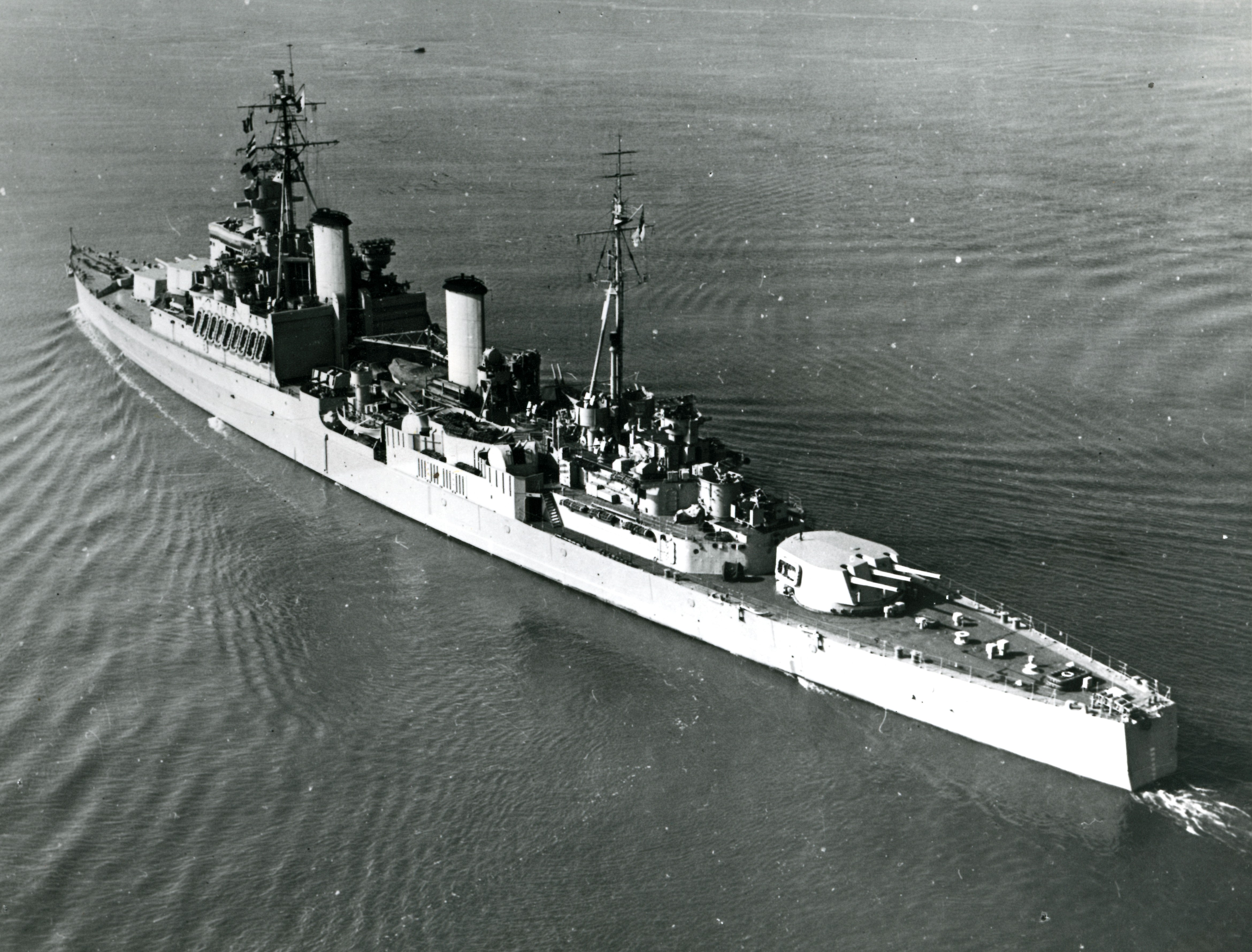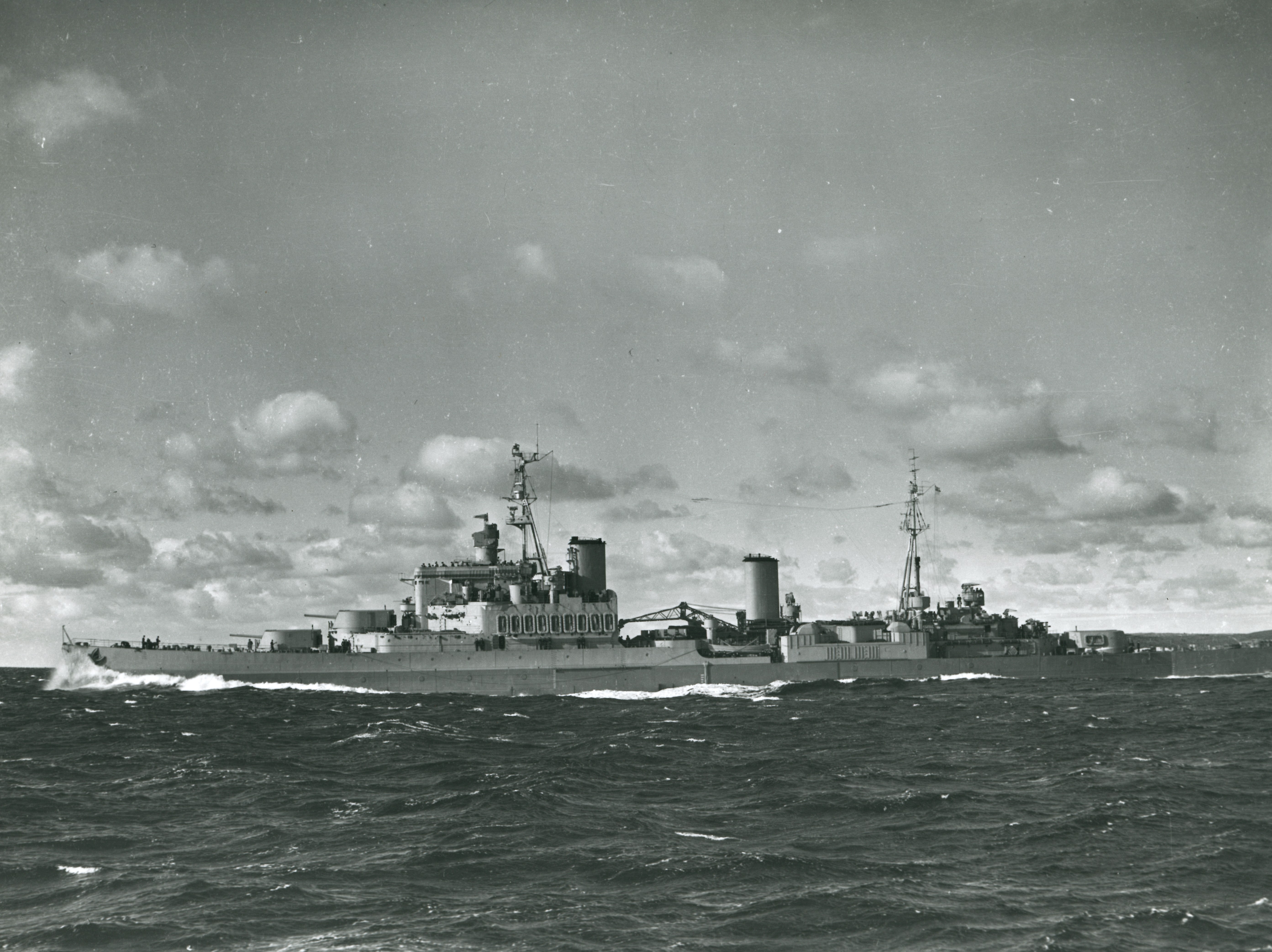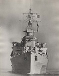 As HMS UGANDA, she was completed 03 Jan 1943, at Vickers-Armstrong Ltd., Newcastle-on-Tyne. After working up with the Home Fleet she joined Plymouth Command in Apr 1943 for operations in the Bay of Biscay and the English Channel, and in Jul 1943 joined the 15th Cruiser Squadron, Mediterranean Fleet, as part of Force "K." She was badly damaged by a German glider bomb on 13 Sep 1943, while supporting the Allied landing at Salerno, Italy, and arrived at Charleston, S.C., in November for a year of repair work. Presented to the RCN, the ship was commissioned HMCS UGANDA on 21 Oct 1944, at Charleston, and in Nov 1944 returned to the U.K. for further modifications. She left in Jan 1945, for the Pacific via the Suez Canal, to join the 4th Cruiser Squadron, British Pacific Fleet thus becoming the first ship of the RCN to transit the Suez Canal. In Apr 1945 she joined Task Force 57 in the Okinawa area, and was thereafter principally employed in screening the Fleet's aircraft carriers operating against Japanese airfields in the Ryukyu Islands.