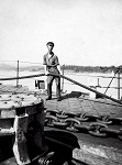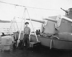(JM77) Cook Parsons on HMCS UGANDA while in drydock (JM78) Cook John McGowan (right) with shipmate on HMCS UGANDA (JM79) HMCS ONTARIO in Esquimalt - SEEN FROM HMCS UGANDA (JM80) Esquimalt harbour. Yarrow shipbuilding seen on the far shore (JM81) AB Morrow (position in boat not identified on photo) in UGANDA'S 1st motor boat.
