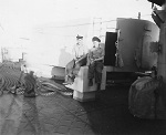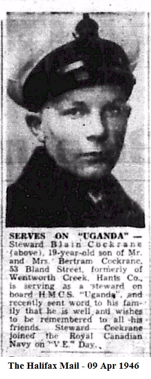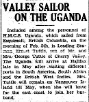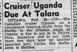 (UGA025) Newspaper article on UGANDA'S visit to Talara, Peru and then Callao, Peru. The Halifax Mail 01 Mar 1946. Research by / Courtesy of George Newbury (UGA026) HMCS UGANDA rounding Cape Horn "under sail", 1946. From the collection of Eric Stapleton (UGA027) Charles Williamson onboard HMCS UGANDA rounding the Horn in 1946. Courtesy of Dale Welta (UGA028) A piece of the pocket-battleship Admiral Graf Spee. From the collection of Tom Elstone. Courtesy of Rick Elstone (UGA029) HMCS UGANDA at the old Ocean Dock, Prince Rupert, BC - circa 1946. Courtesy of John Gabel