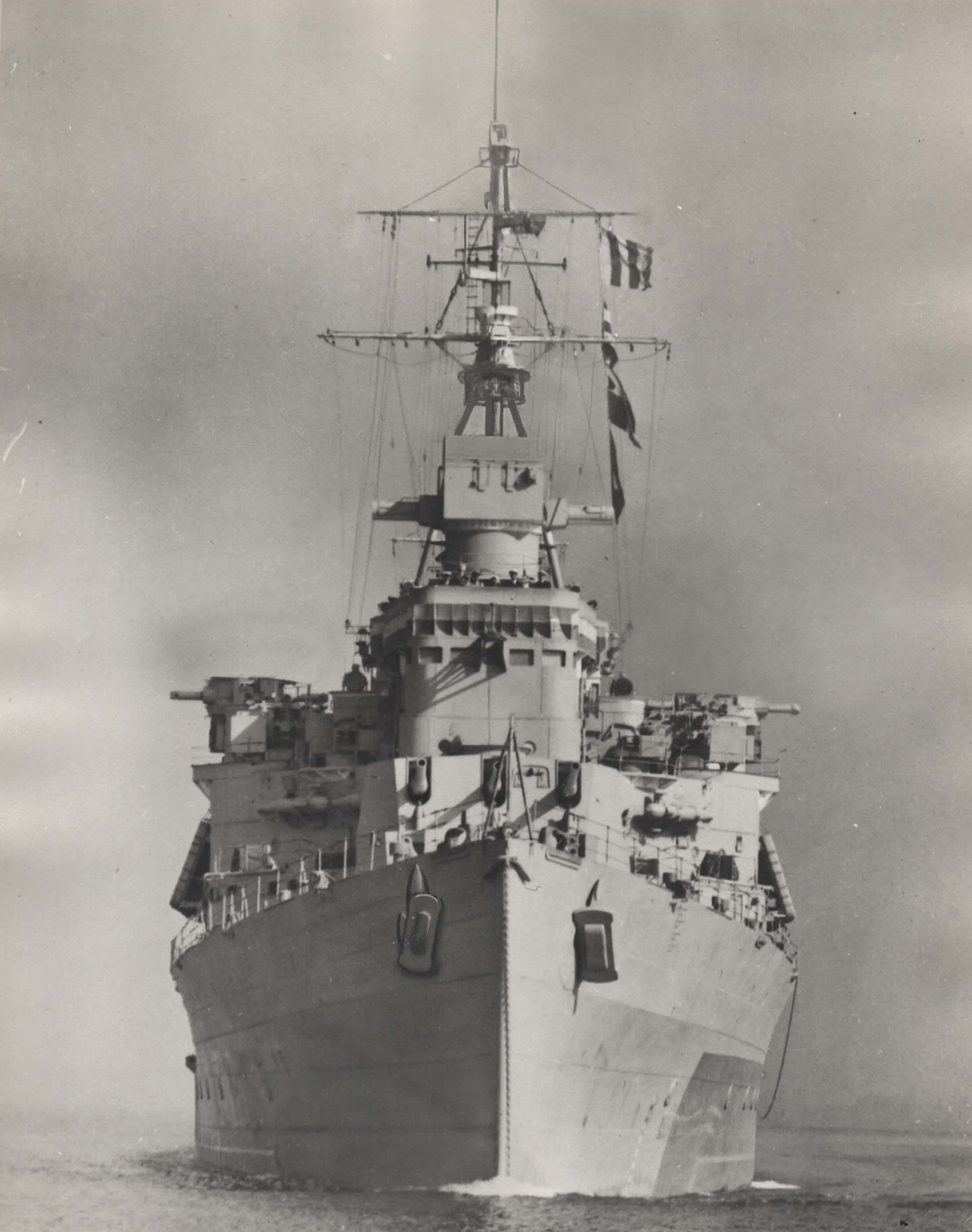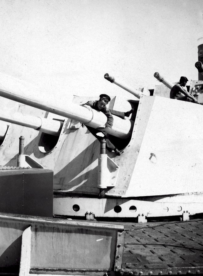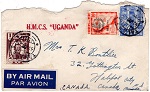 (UGA035) Envelope from a letter to Mrs T. K. Boutilier of Halifax from HMCS UGANDA in Peru - postmarked 1945 (UGA036) A & B turret on HMCS UGANDA // Courtesy of the Naval Museum of Halifax (UGA037) HMCS UGANDA // Courtesy of the Naval Museum of Halifax