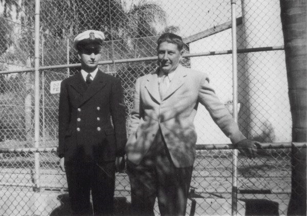 (LR15) HMCS UGANDA'S badge and motto (LR16) PO's Mess, HMCS UGANDA - PO Larry Restall serving (LR17) HMCS UGANDA in Esquimalt - 1946 (LR18) HMCS UGANDA in San Diego - 1946 (LR19) PO Larry Restall (left) and friend at the San Diego Zoo - 1946