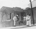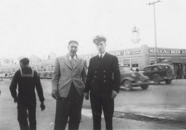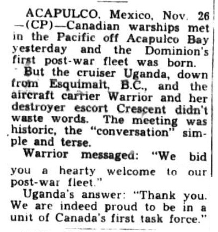 (LR20) Shore Patrol in San Diego - 1946 (LR21) PO Larry Restall (right) and friend in Tijuana, Mexico - 1946 (LR22) HMCS UGANDA, Magdalena Bay, Mexico - 1946 (LR23) PO Larry Restall, Magdalena Bay, Mexico - 1946 (LR24) HMCS UGANDA joins HMCS WARRIOR and HMCS CRESCENT off Acapulco Bay - Halifax Mail, Wed. 27 Nov 1946. Researched by / courtesy of George Newbury