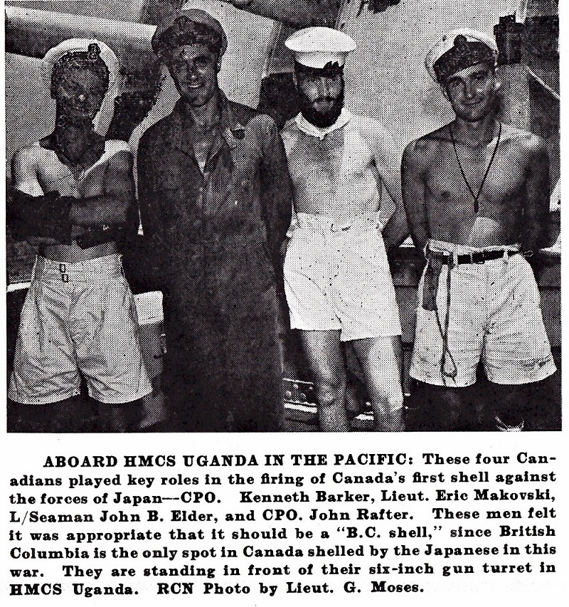 (UGA008) Bombardment by HMCS UGANDA off Sukuma Airfield on Miyako Jima. Source: Library and Archives Canada, ref PA-136073 (UGA009) Petty Officer Engine Room Artificer John Renvik, HMCS UGANDA, Jun 1945. Source: Lt Gerald M. Moses / Canada. Dept. of National Defence / Library and Archives Canada / PA-179624 (UGA010) Sailors from Medicine Hat, Alberta, serving aboard HMCS UGANDA, Jun 1945. (L-R): AB J.L. Taylor, W.C. Moore, M.M. Brigham, Stokers E. Titsing, S.A. Tanbling. Source: Lt Gerald M. Moses / Canada. Dept. of National Defence / Library and Archives Canada / PA-188863 (UGA011) AB Garth Barnes and Paul Kuzma relaxing during a lull in action stations aboard the cruiser HMCS UGANDA in the Pacific Ocean, 18 May 1945. Source: Lt Gerald M. Moses / Canada. Dept. of National Defence / Library and Archives Canada / PA-140832 (UGA012) Gun crew of HMCS UGANDA setting fuses on 6" shells prior to bombardment of Truk - 23 June 1945. Source: Lt Gerald Milne Moses / Canada. Dept. of National Defence / Library and Archives Canada / PA-114920