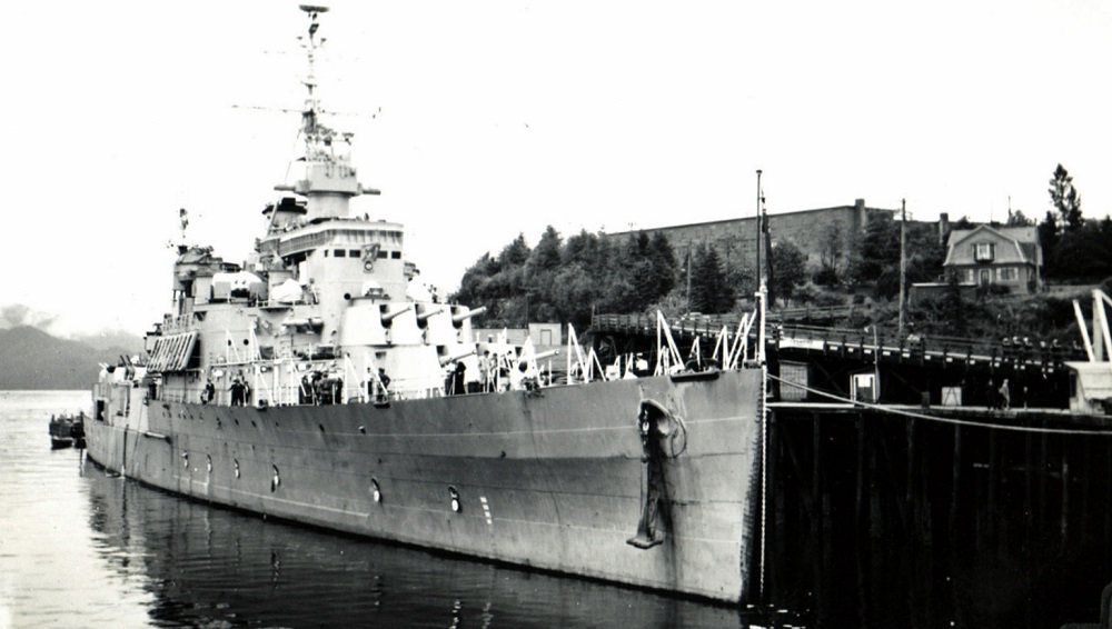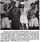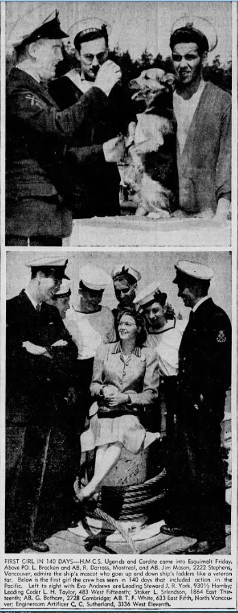 (UGA015) HMCS UGANDA (UGA016) HMCS UGANDA. Courtesy of Mike O'Keefe (UGA017) HMCS UGANDA - Stoker Phillips Burial at Sea 1945. Source: Canada. Dept. of National Defence/Library and Archives Canada/PA-132982 (UAG018)Aboard HMCS UGANDA in the Pacific. CPO Kenneth Barker, Lt Eric Makovski, LS John B. Elder and CPO John Rafter. Crow's Nest newspaper - Aug 1945 (UGA019) HMCS UGANDA - Esquimalt, 1945. From the collection of Hugh A. Benson. Courtesy of Doug Benson