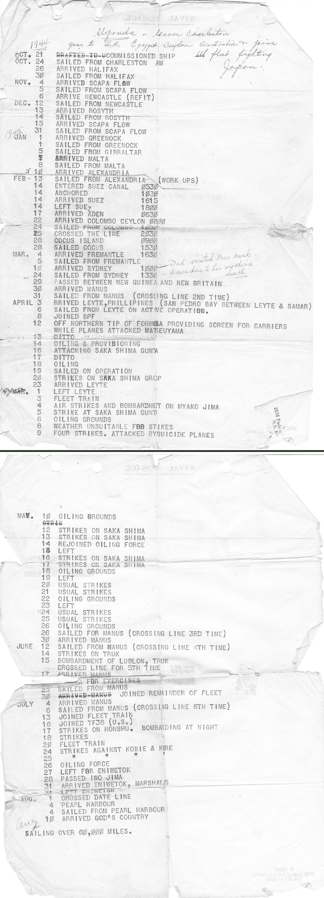 Click here to view a summary of UGANDA'S deployment from her commissioning on 21 Oct 1944 till her arrival in Esquimalt on 10 Aug 1945 (from the collection of Charles Bourgeois)