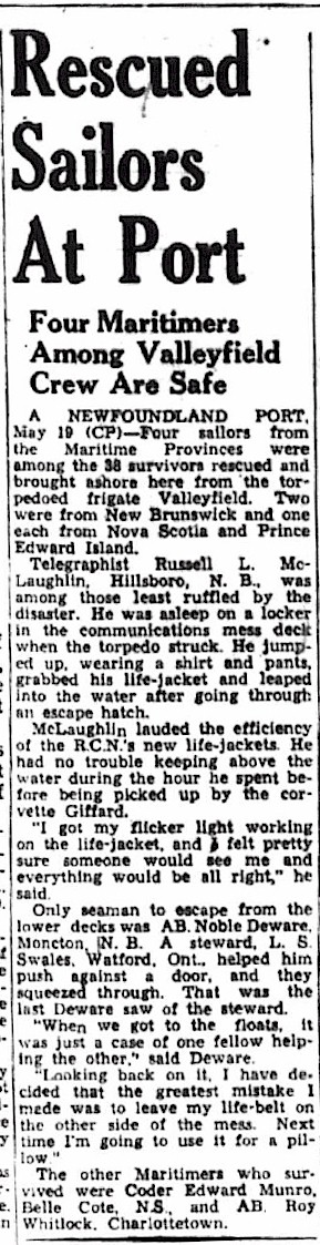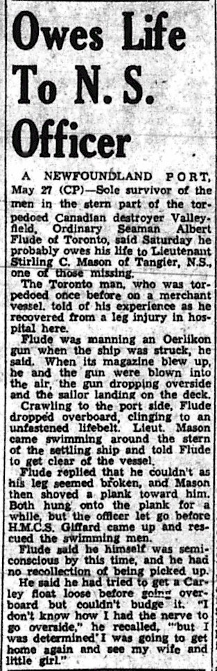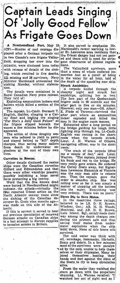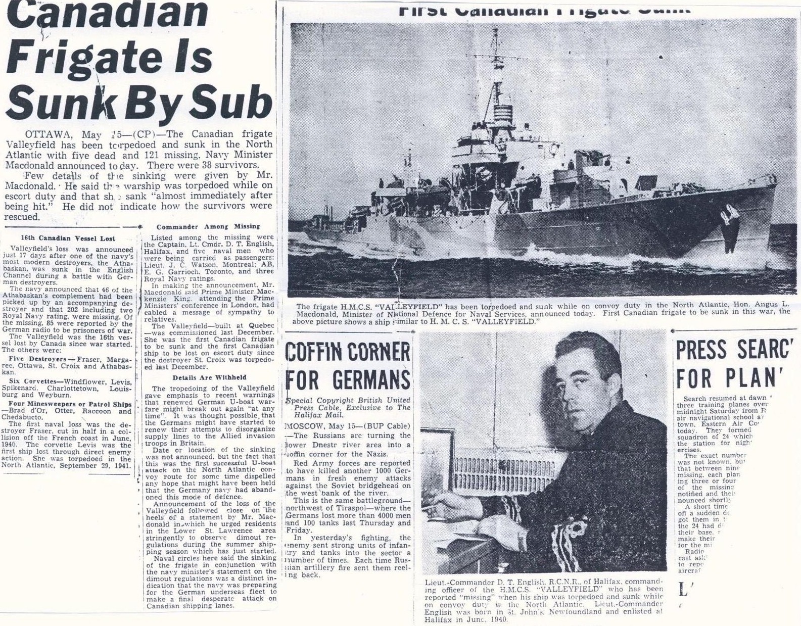 HMCS VALLEYFIELD sunk by U-548 (Kptlt Eberhard Zimmermann) 0435hrs,