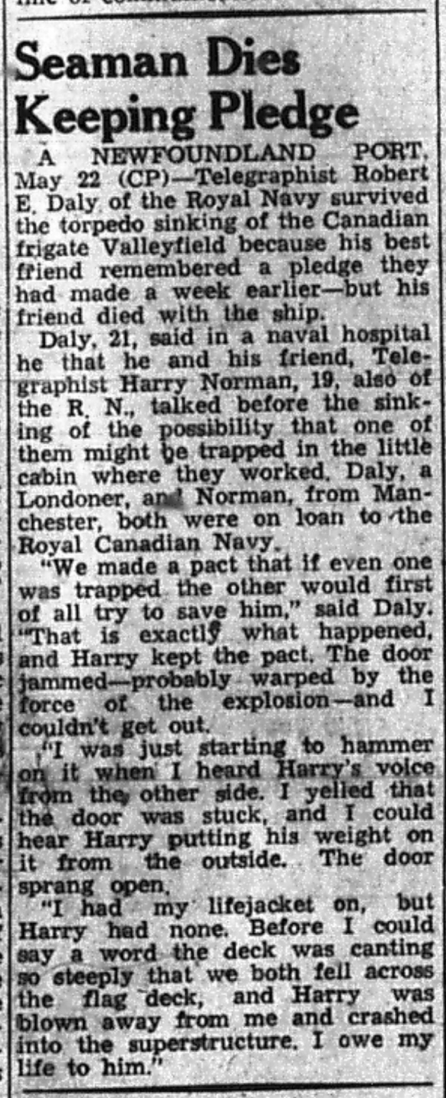 to friend and shipmate Tel Harry Norman, who died when HMCS VALLEYFIELD