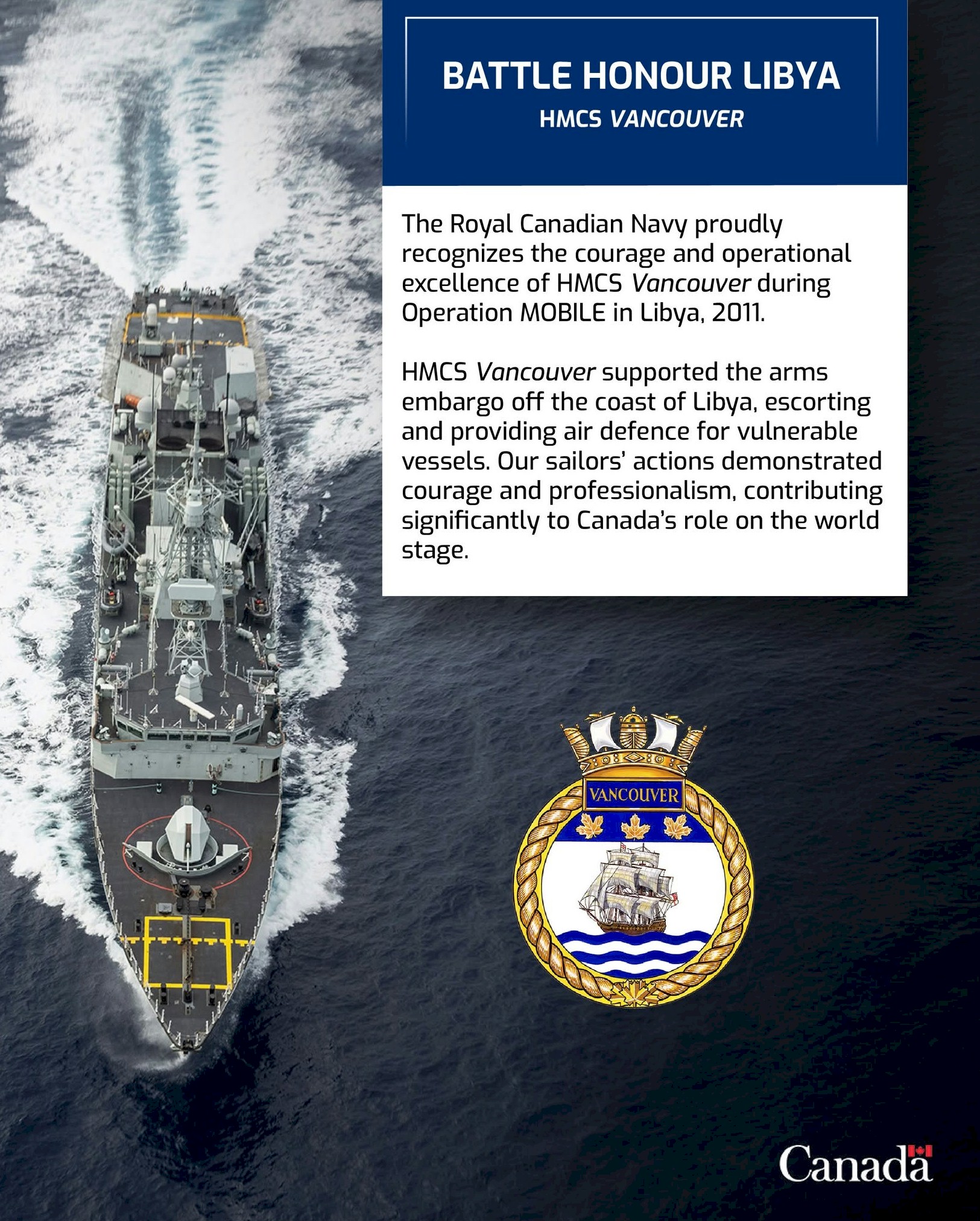 On 02 Jul 2025, HMCS VANCOUVER was awarded Battle Honour Libya 2011 for her participation in OPERATION MOBILE in Libya in 2011.