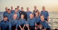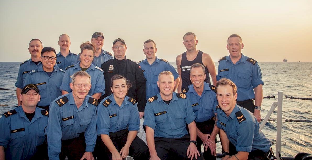 Former PROTECTEUR crew members pose aboard HMCS VANCOUVER off the coast of Panama on 16 March 2016 with PROTECTEUR and its towing vessel visible in the top right background. Personnel from top left to bottom right: LS Duane Earle, LS Jeffrey Allam, LS James Campbell, MCpl Alfred Castrojas, Cpl Nancy Rheaume, MS David Spiker, Lt(N) Maxime Delcourt, PO2 Benjamin Salamon, PO1 Steven Stacyszyn, LS Shawn Snow, LS Leo Bossé, LS Margeaux Hadwin, Lt(N) Jeff Scheerer, PO1 Stephan Melancon and LS Sergej Krivenko
