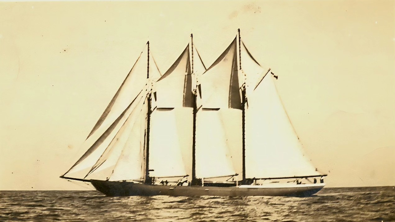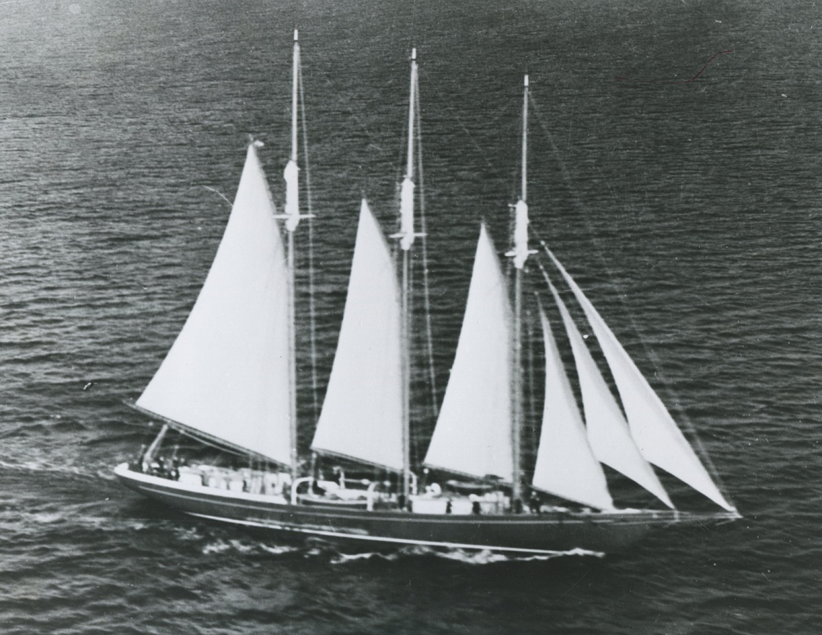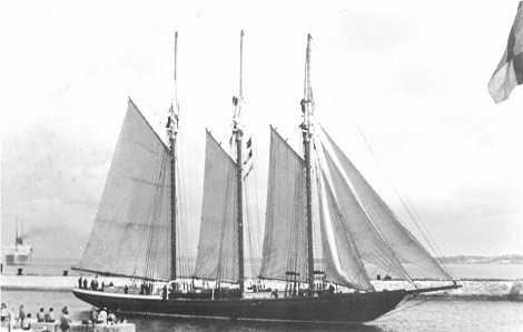 The only sailing vessel among the thirteen ships serving in the RCN on the eve of the Second World War, this three-masted schooner was designed by W. J. Roue at Dartmouth, Nova Scotia. Mr. Roue was the one who designed the famous fishing vessel BLUENOSE. She was 143 feet overall in length and was built at Meteghan River, Nova Scotia. She was rigged as a tern schooner with three masts. Painted with a royal blue hull, gold stripe, varnished spars and a white boot topping, she commissioned on 25 Oct 1937 as a training ship.